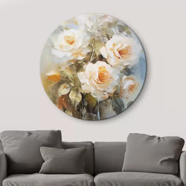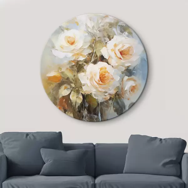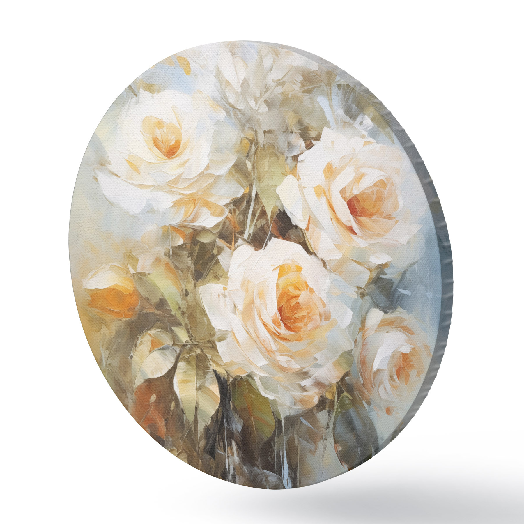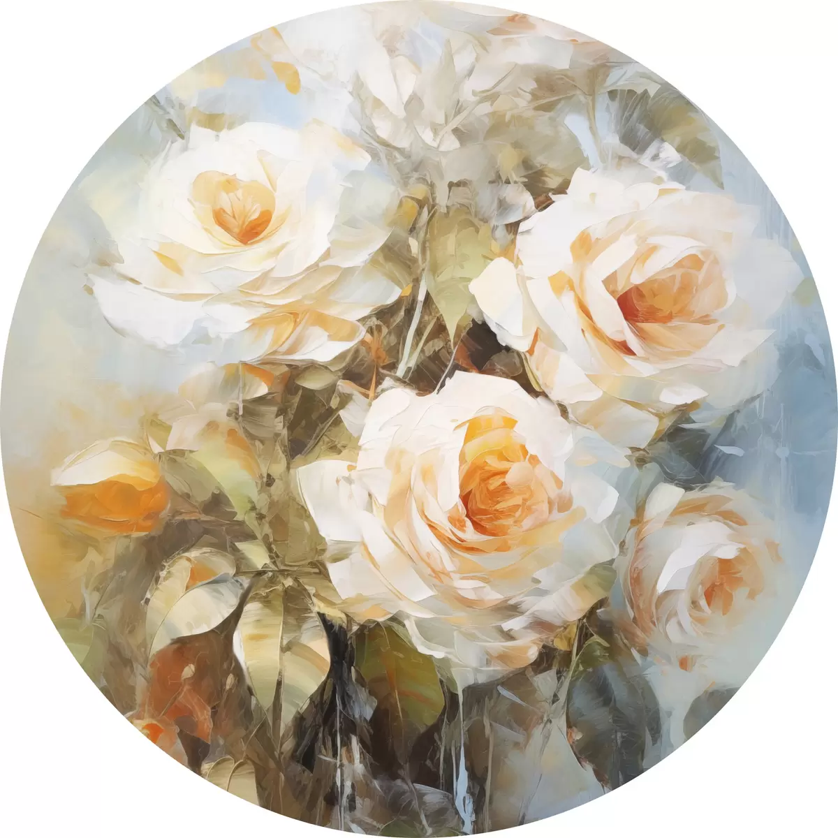 Cuadros redondos Rosas blancas con naranja, sobre un fondo azul claro suave, con pinceladas visibles y un estilo pictórico r43175