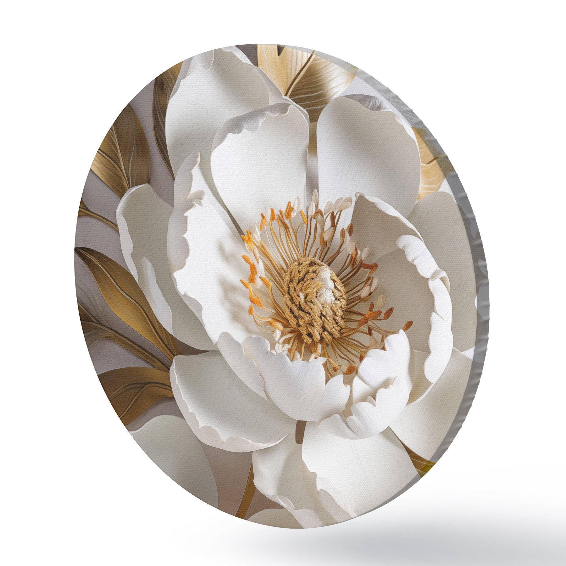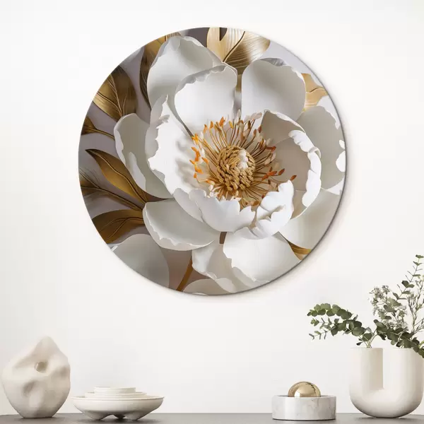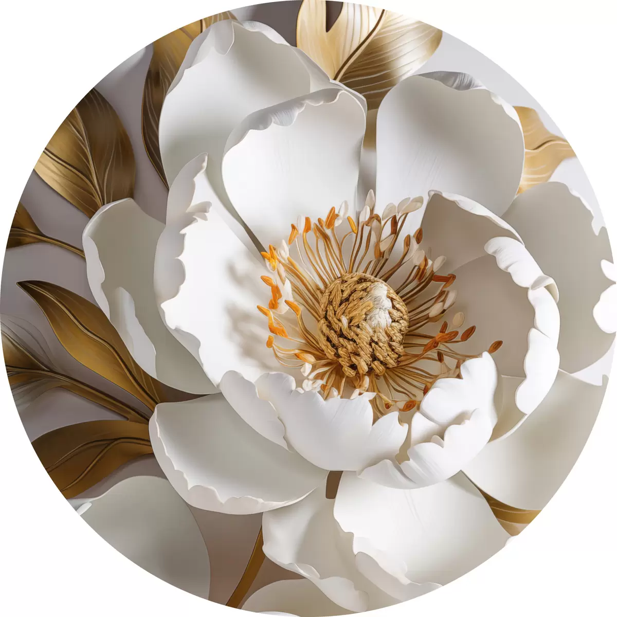 Cuadros redondos Flores decorativas de peonía blancas y delicadas con hojas amarillas, el fondo es de color gris claro r43176