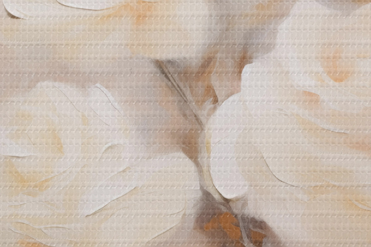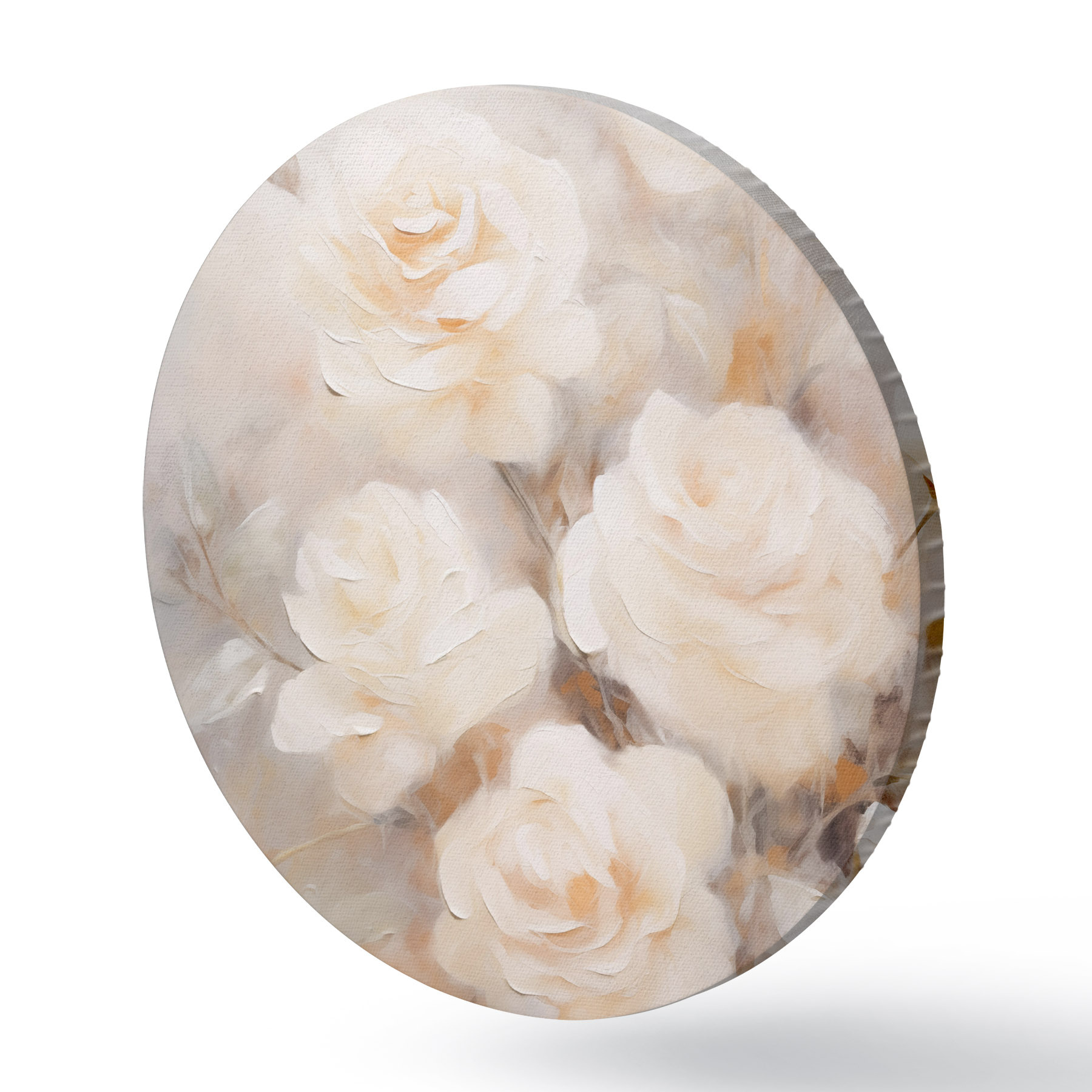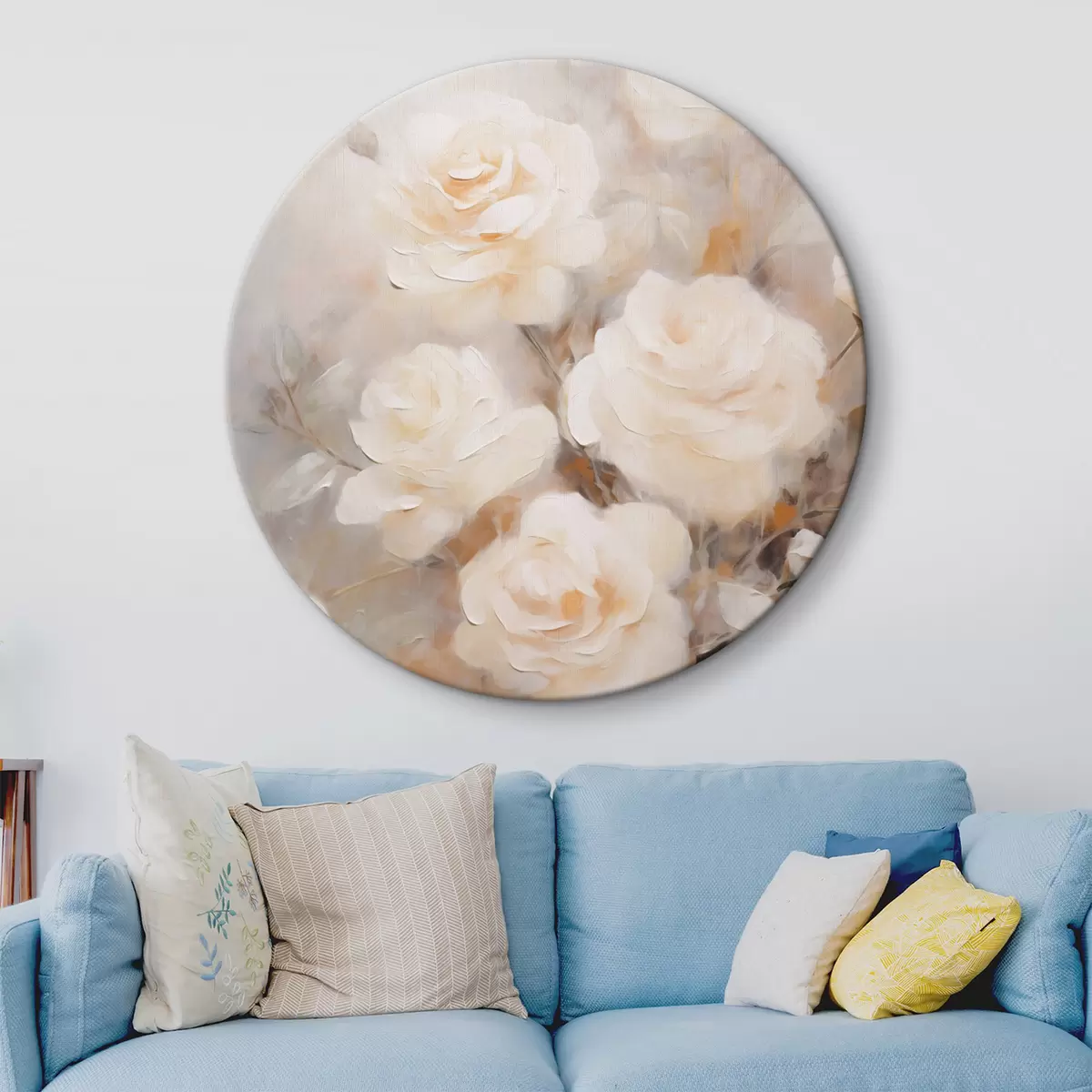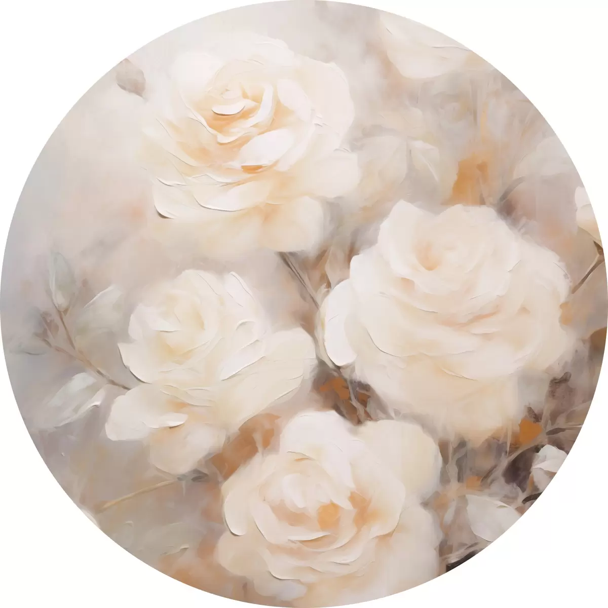 Cuadros redondos Rosas blancas de pétalos suaves, con un fondo de colores apagados y formas difuminadas, creando un efecto de ensueño r43177