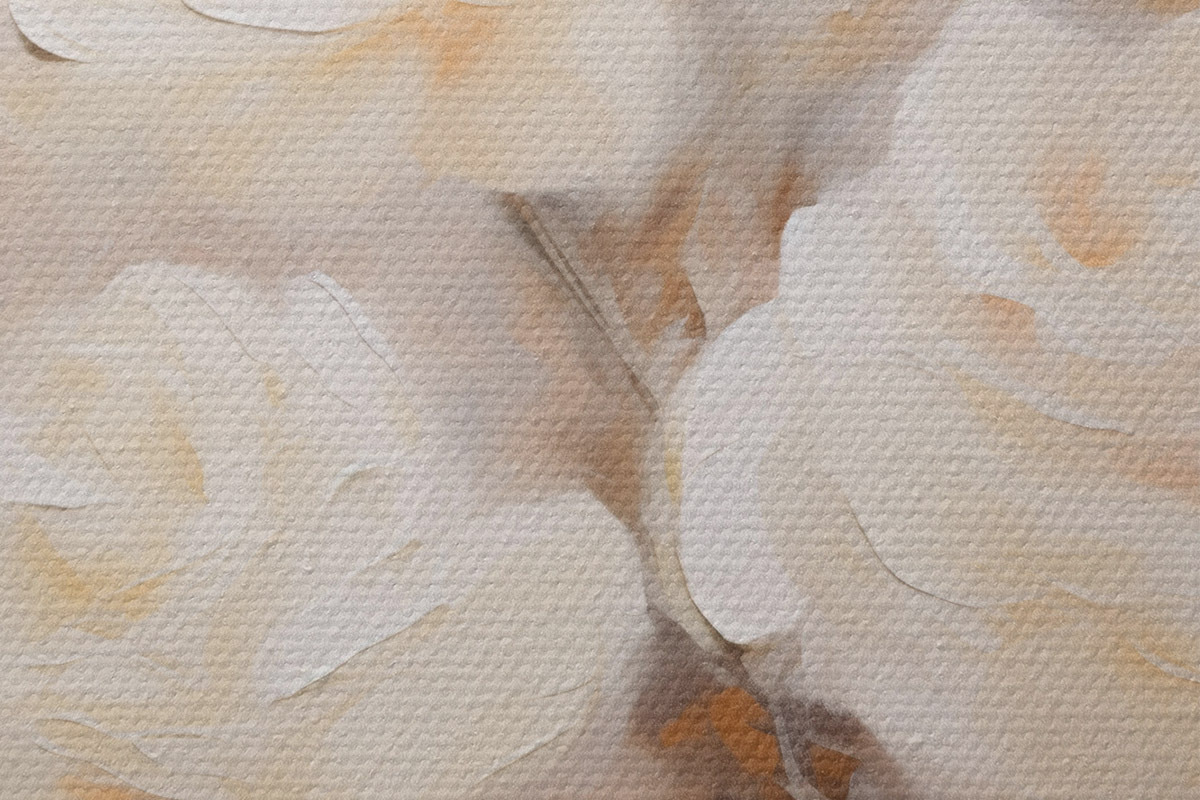 Foto Rosas blancas de pétalos suaves, con un fondo de colores apagados y formas difuminadas, creando un efecto de ensueño Nr r43177