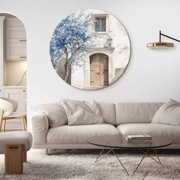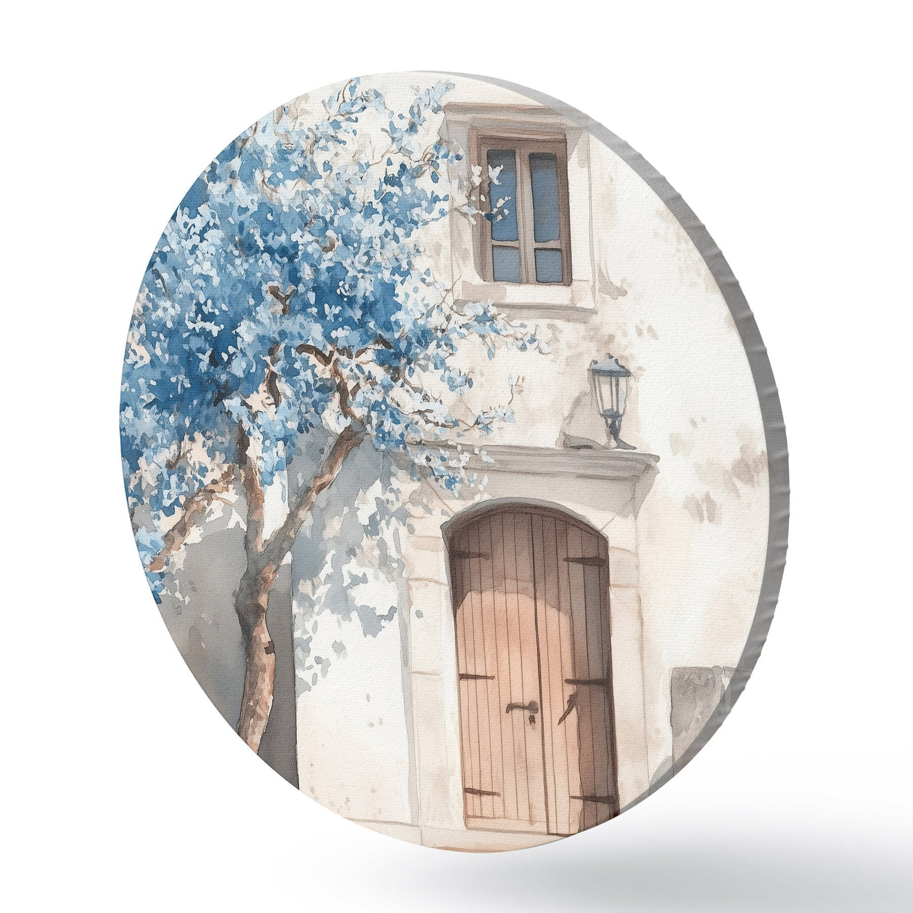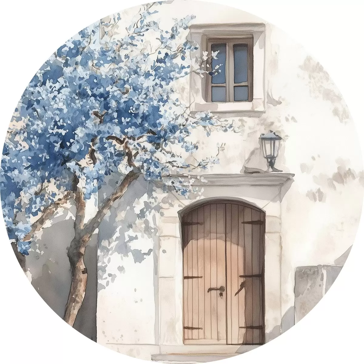 Cuadros redondos Casa griega con hermoso árbol, arquitectura, estilo acuarela r43178