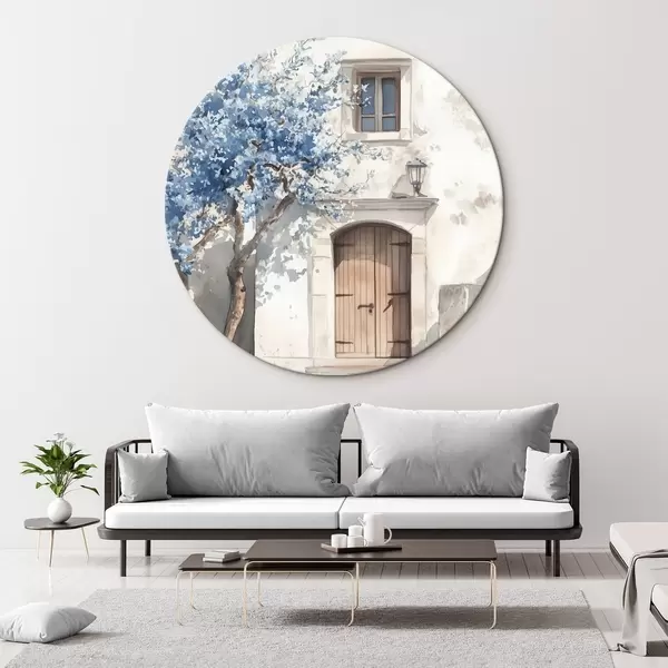 Cuadros redondos Casa griega con hermoso árbol, arquitectura, estilo acuarela r43178