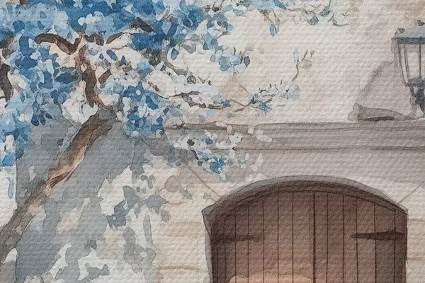 Foto Casa griega con hermoso árbol, arquitectura, estilo acuarela Nr r43178
