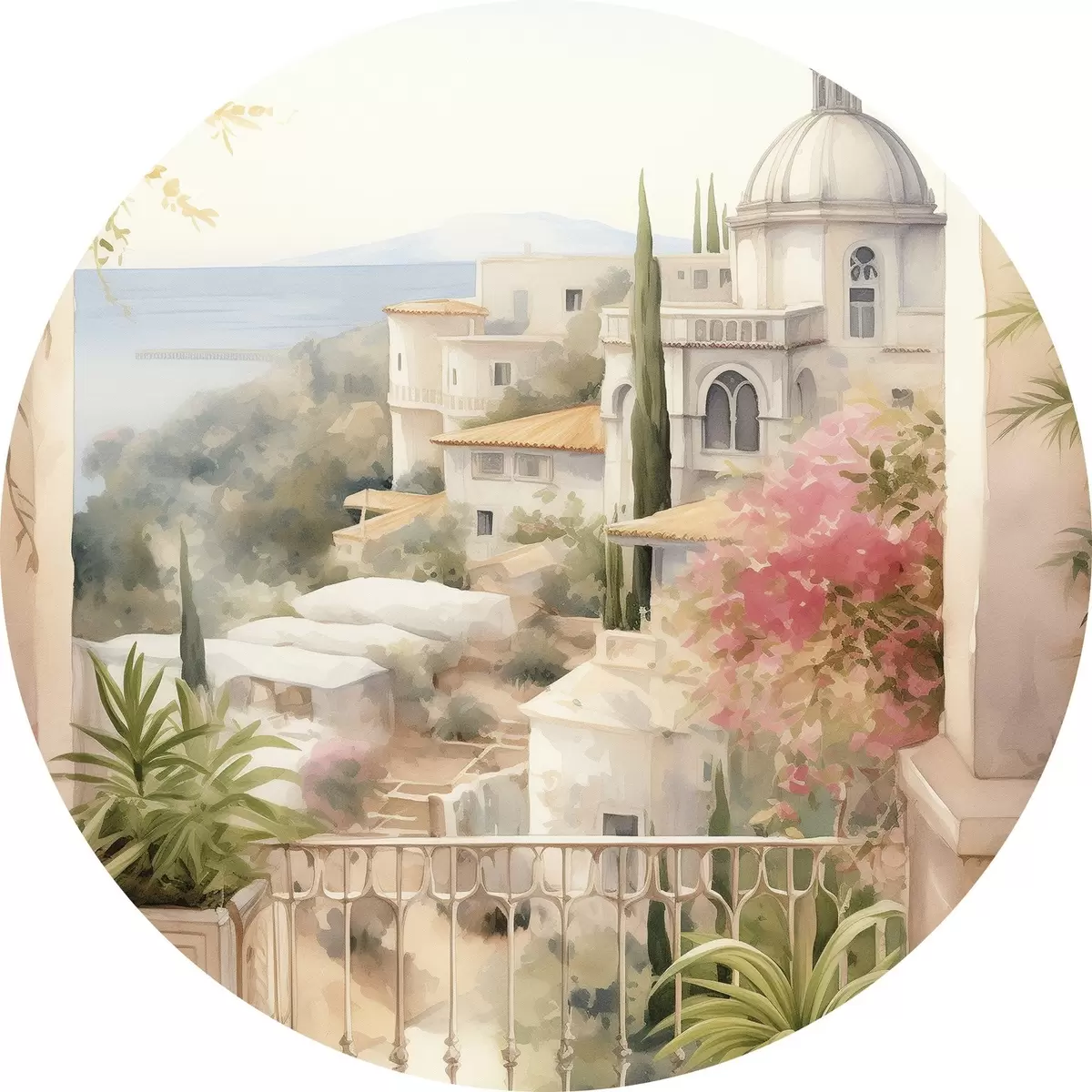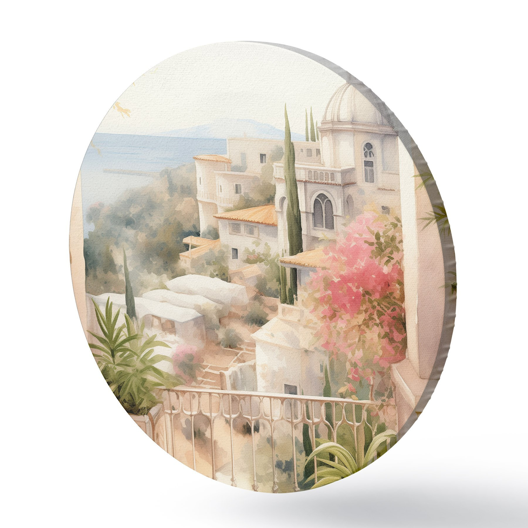 Cuadros redondos Paisaje de verano en España, arquitectura mediterránea, estilo acuarela r43181