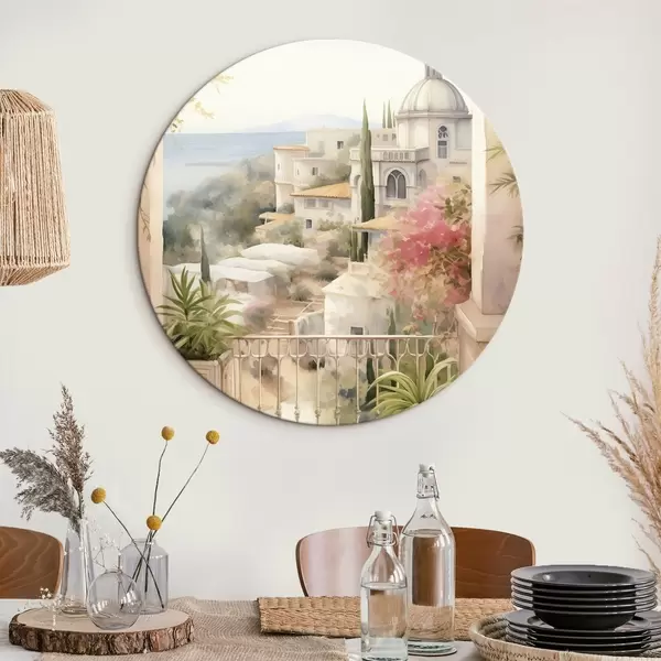 Cuadros redondos Paisaje de verano en España, arquitectura mediterránea, estilo acuarela r43181