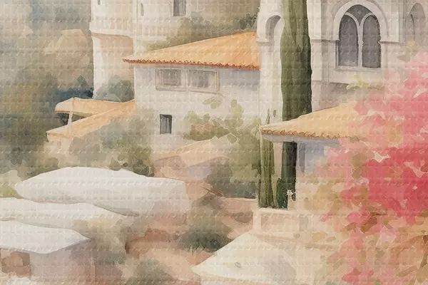 Foto Paisaje de verano en España, arquitectura mediterránea, estilo acuarela Nr r43181