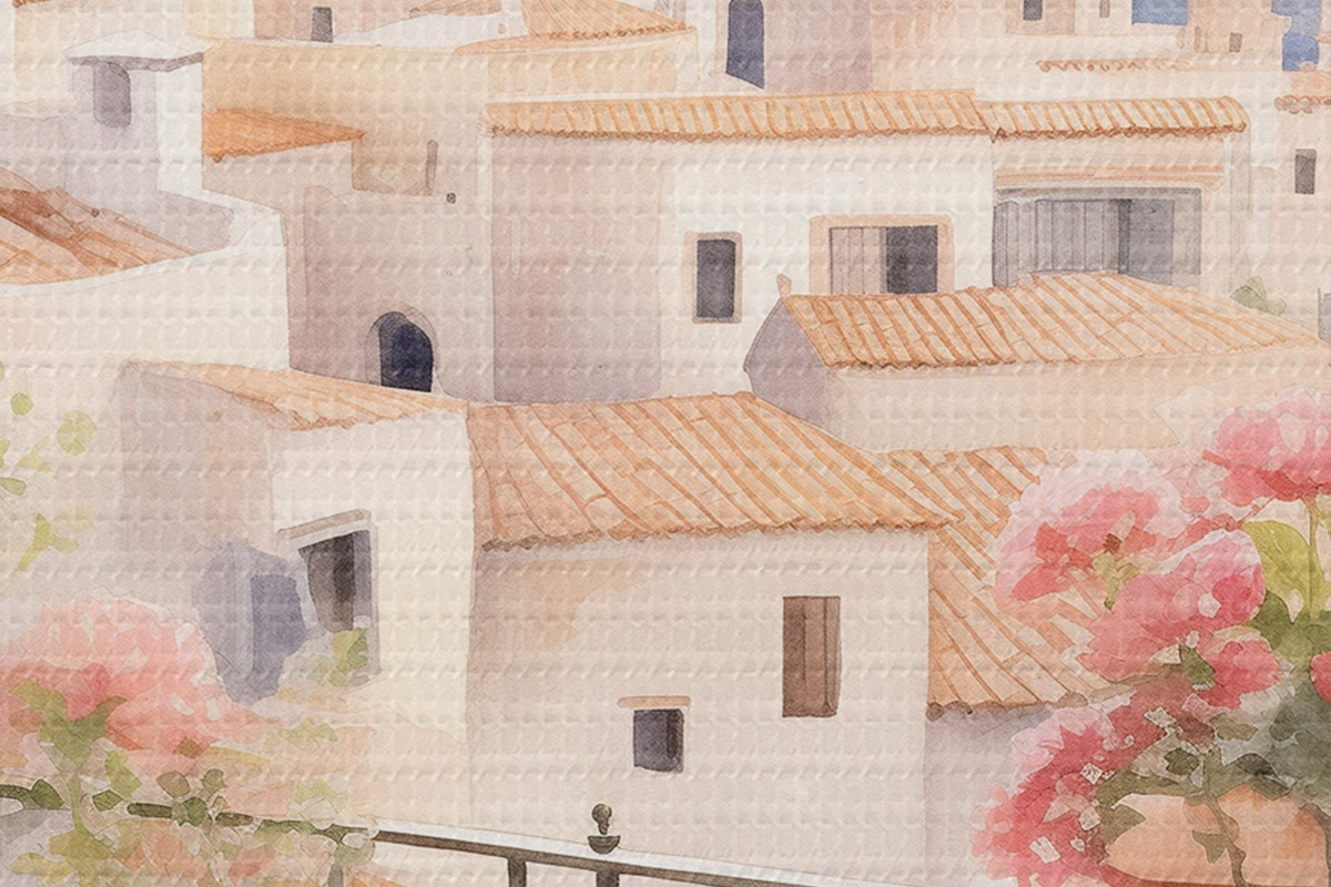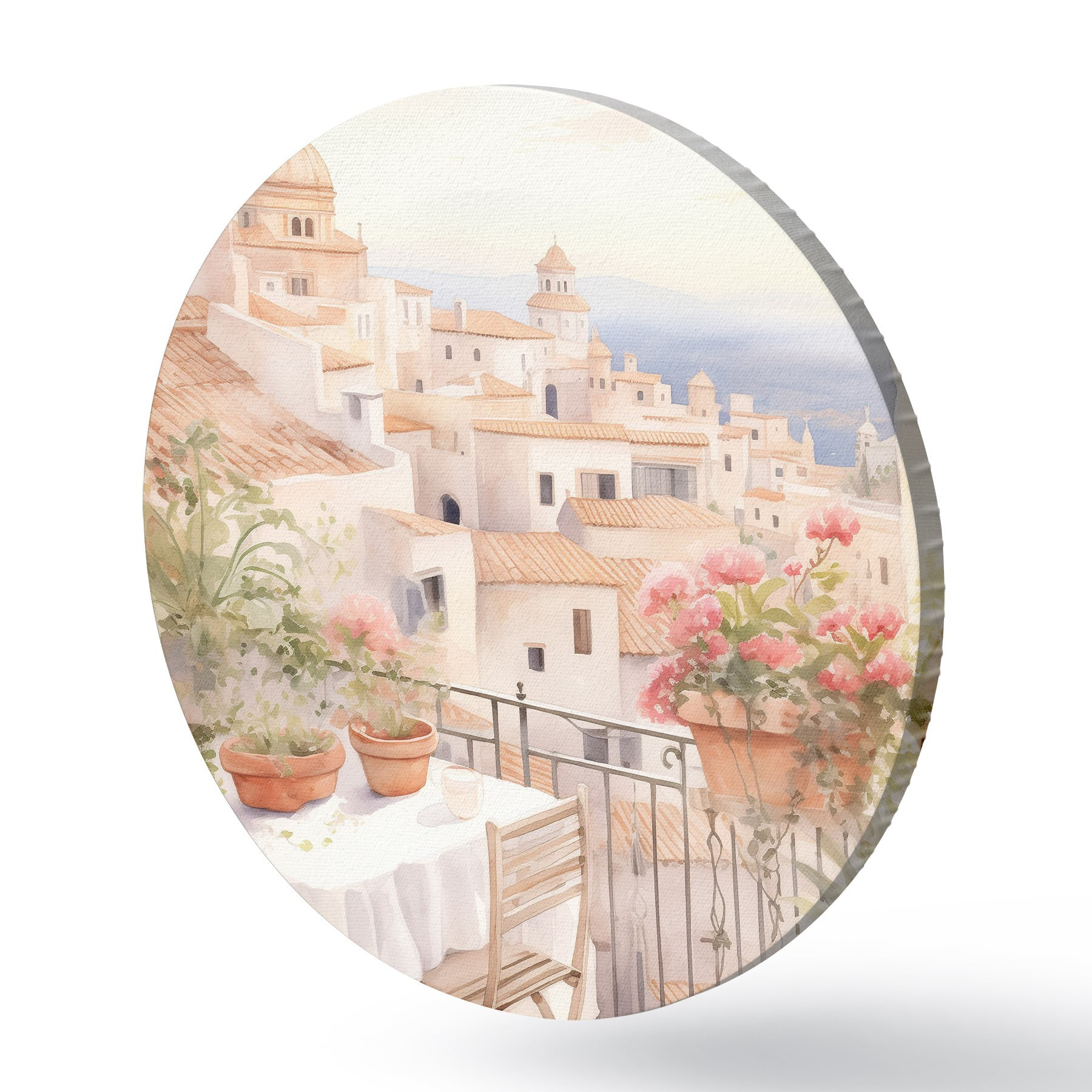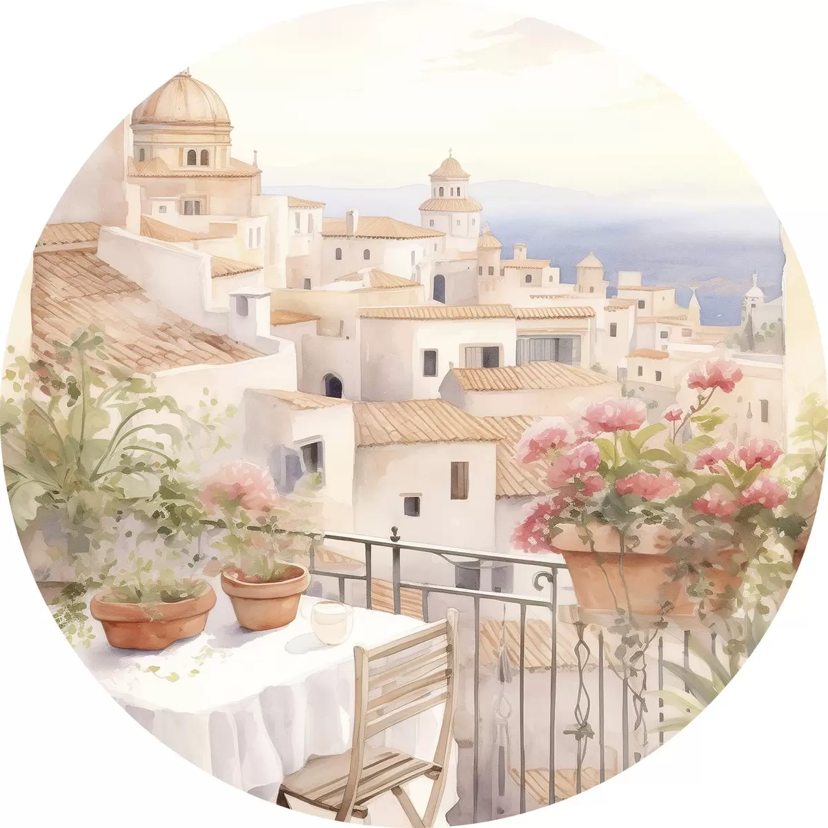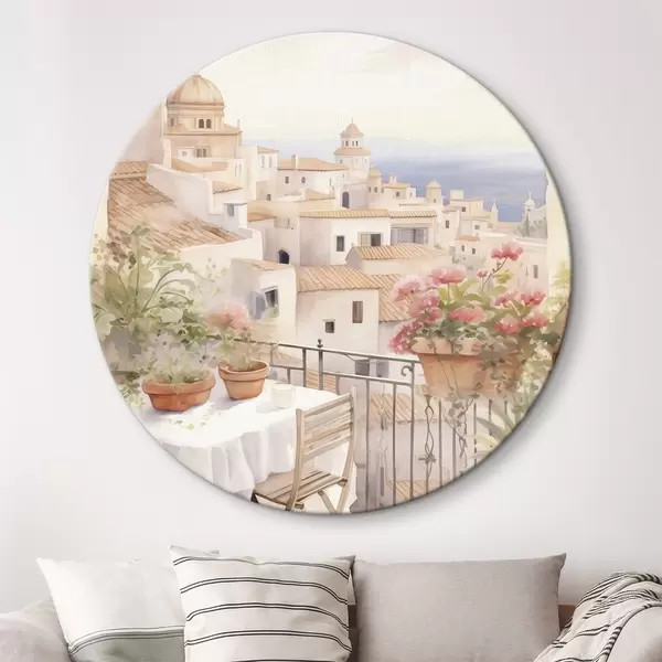 Cuadros redondos Puesta de sol en el balcón, Italia, arquitectura, flores en flor, estilo acuarela r43184