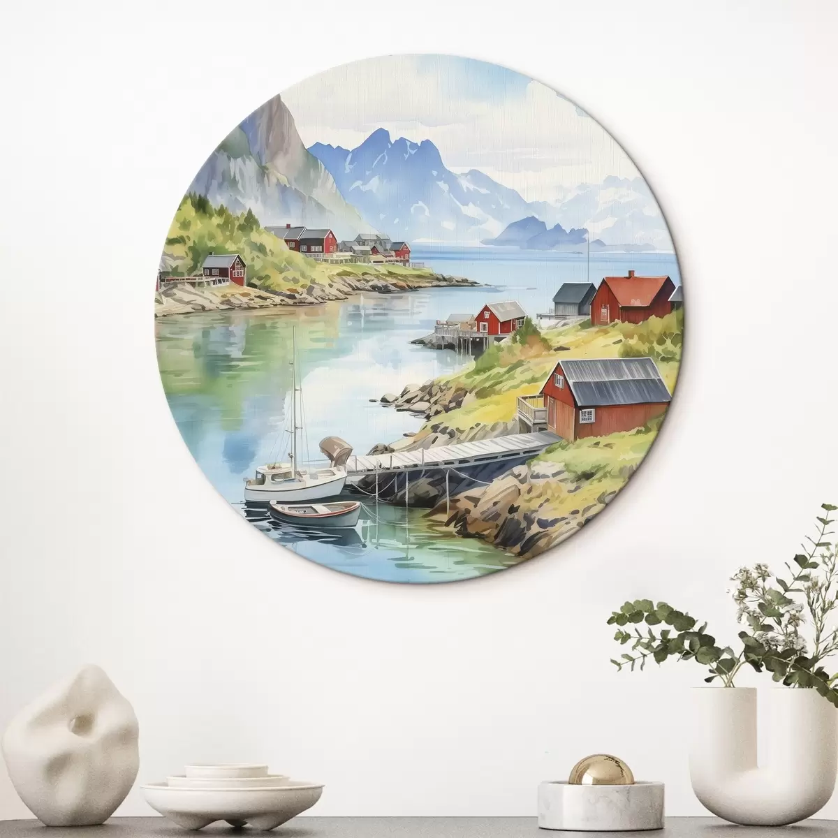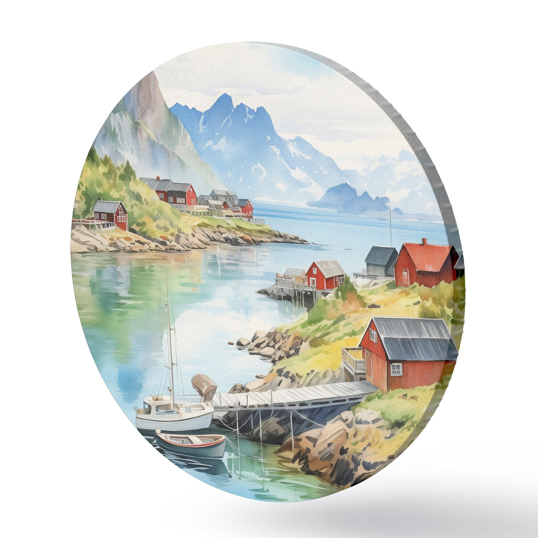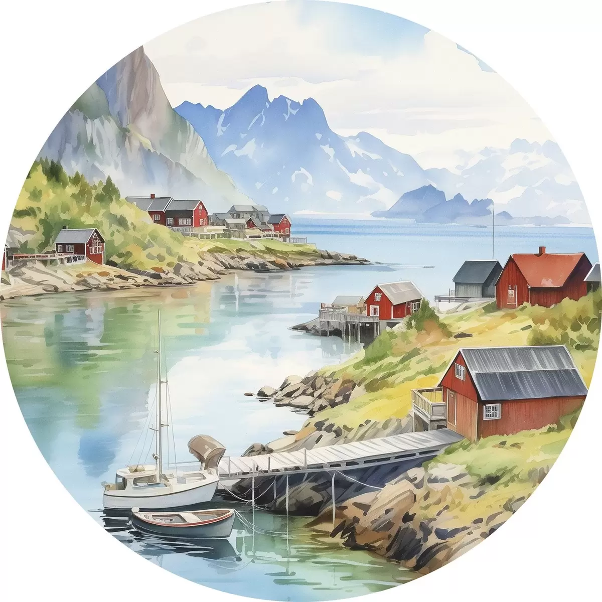 Cuadros redondos Paisaje de verano de las islas Lofoten, casas rojas, montañas, barcos r43187