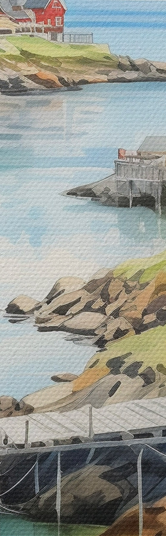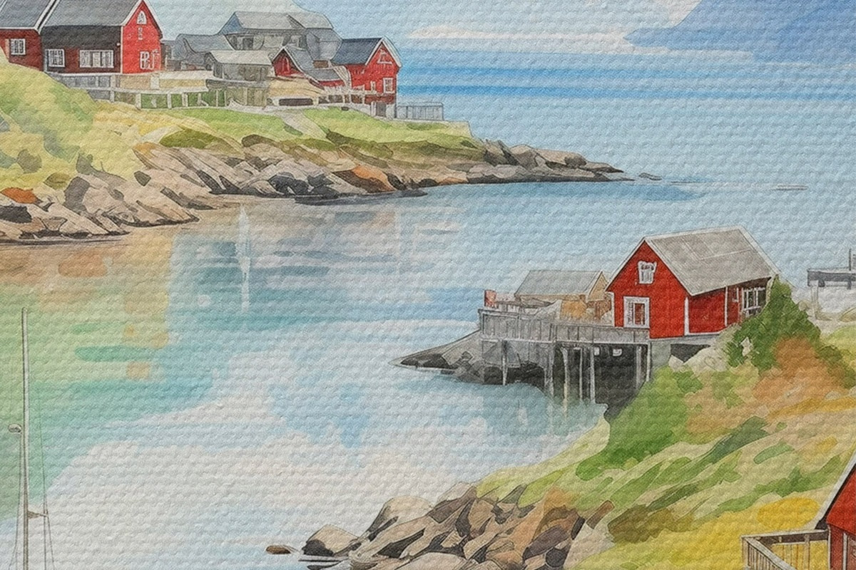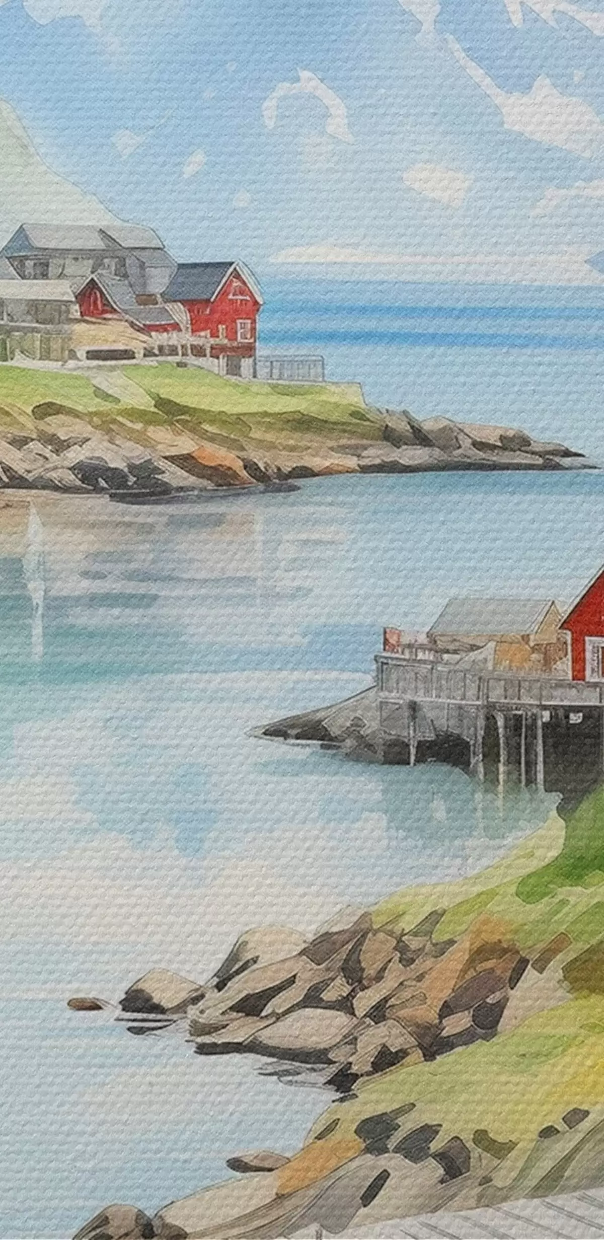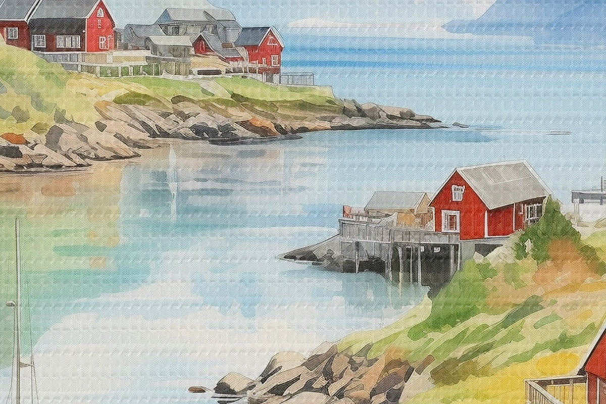 Foto Paisaje de verano de las islas Lofoten, casas rojas, montañas, barcos Nr r43187