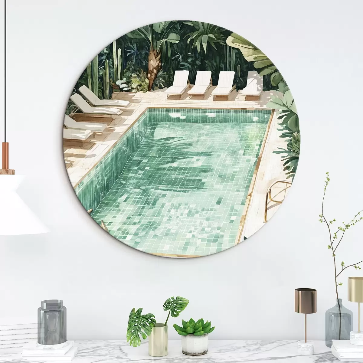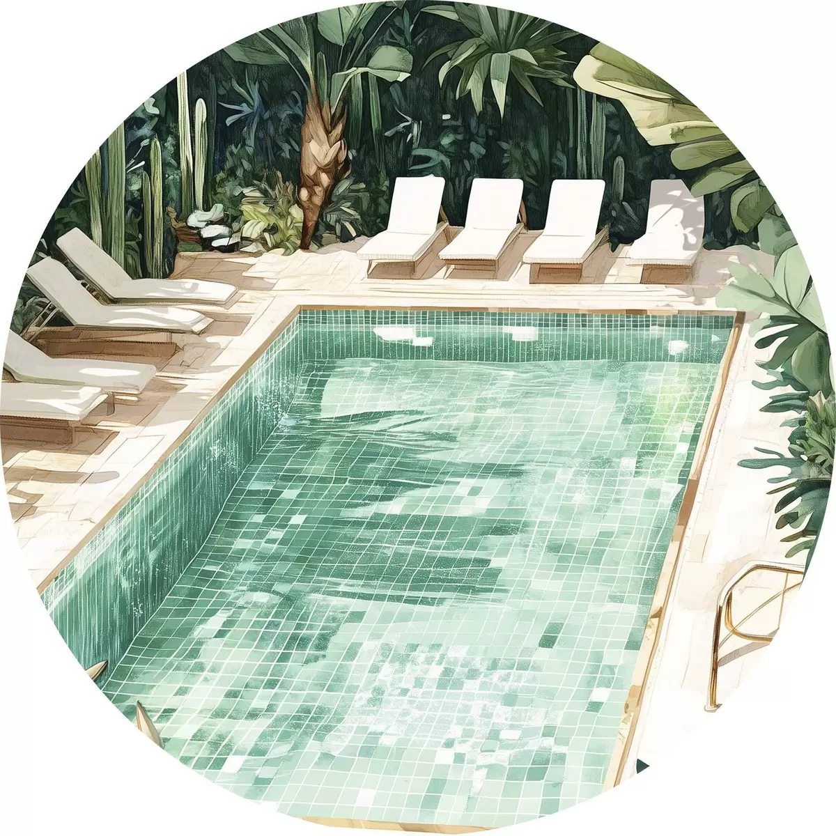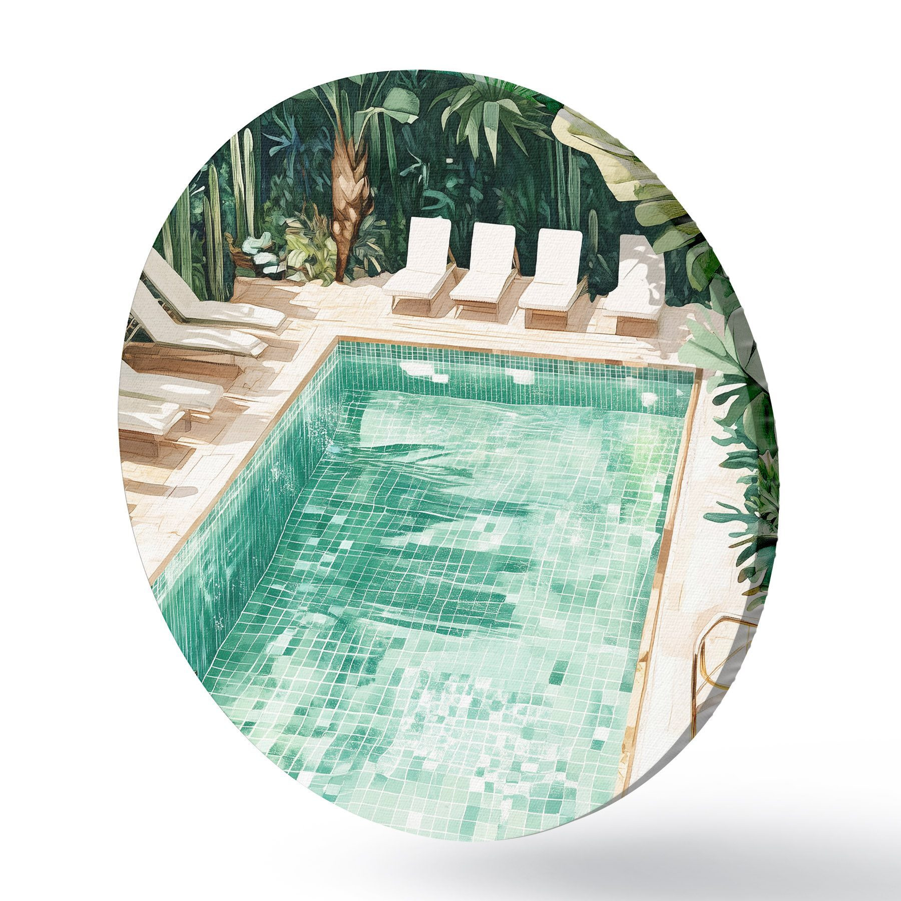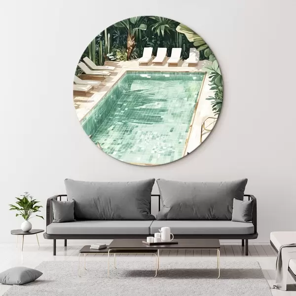 Cuadros redondos Piscina de verano en el jardín verde, estilo vintage, acuarela r43189