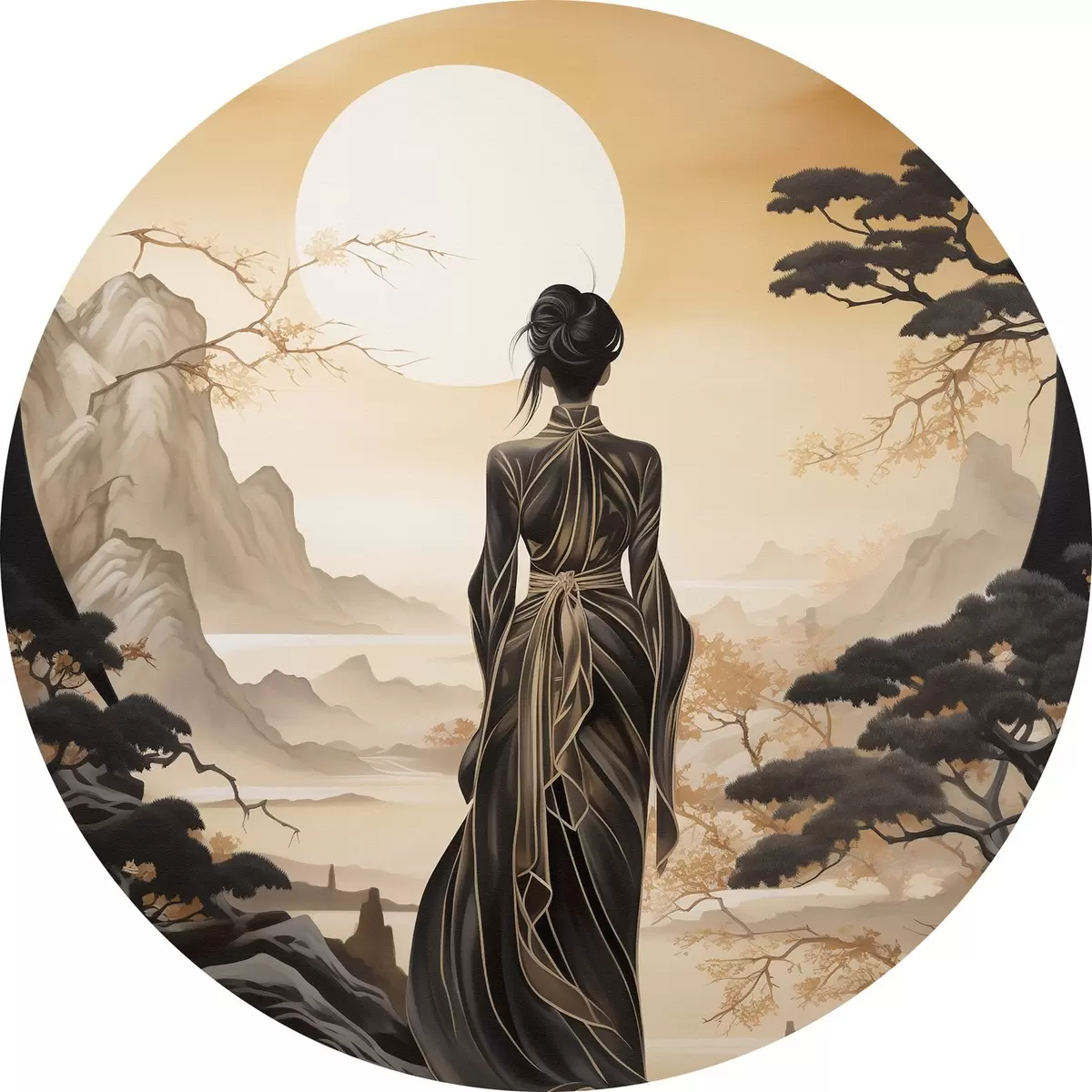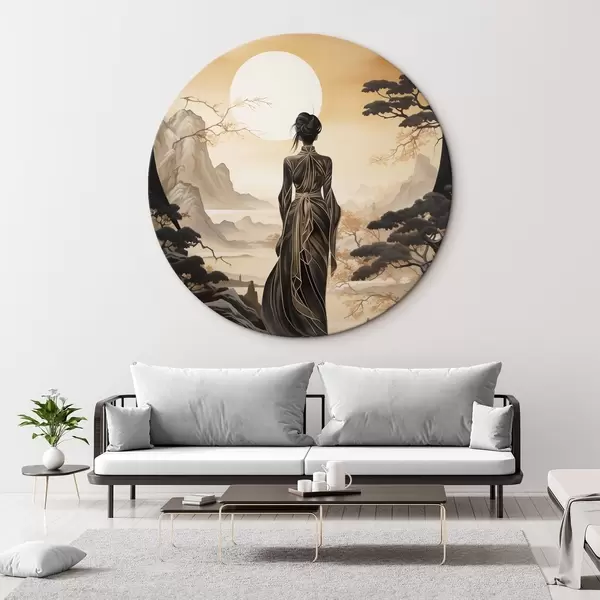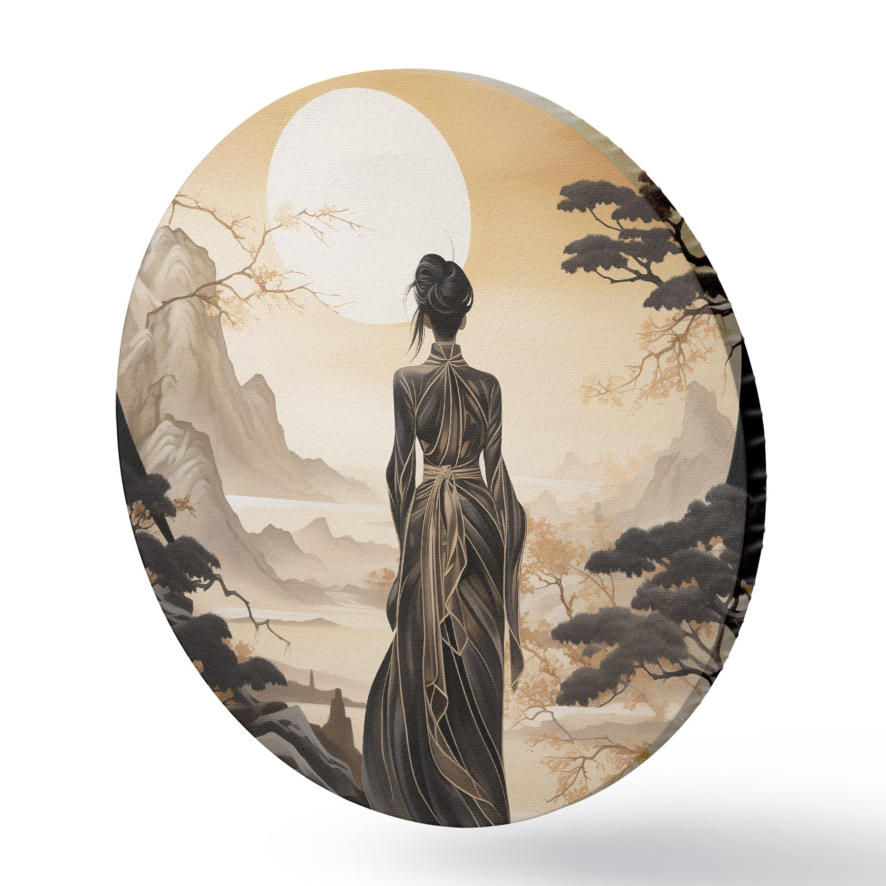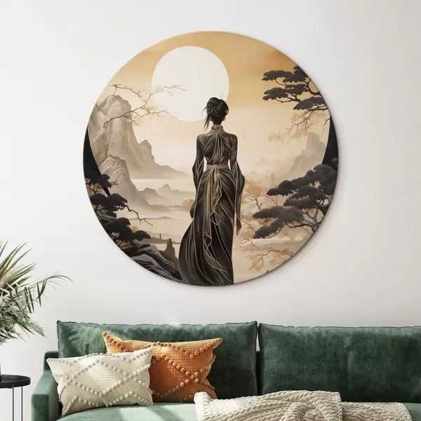 Cuadros redondos Gente, Japón, chica al atardecer sobre el fondo de sakura y montañas r43256