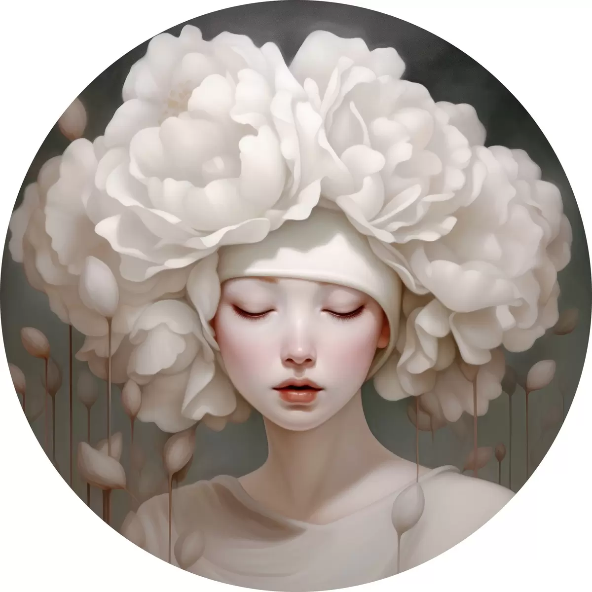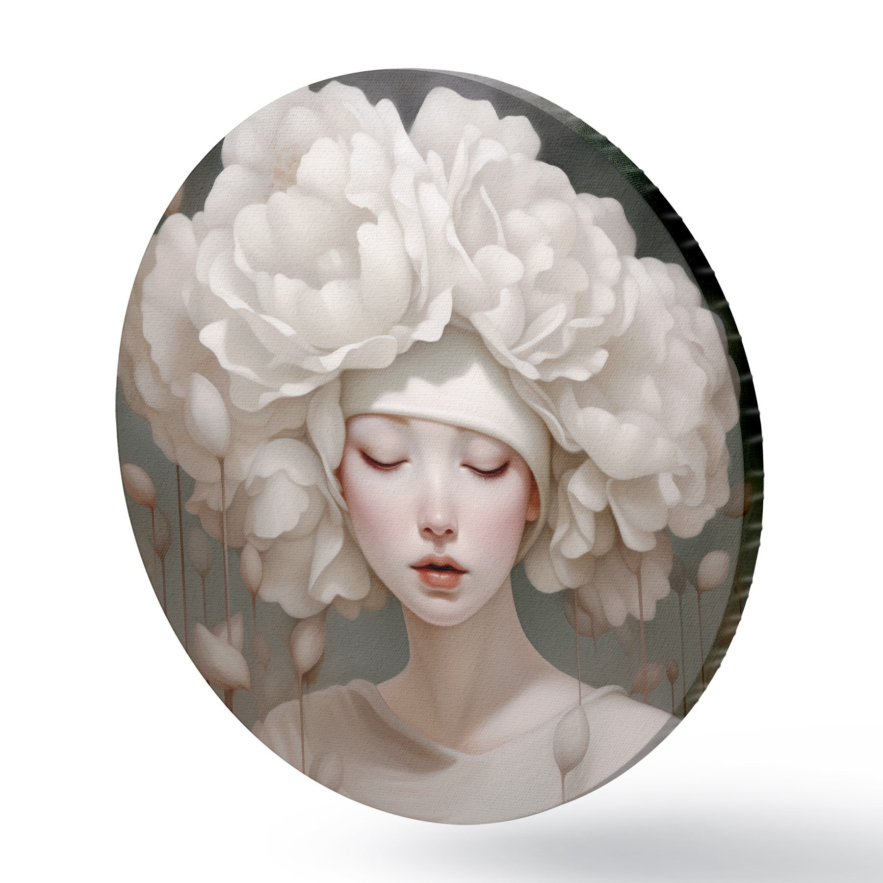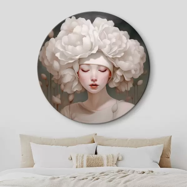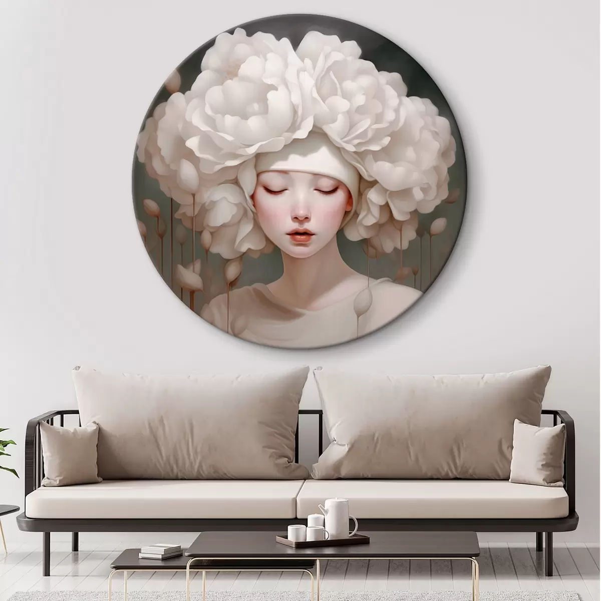 Cuadros redondos Niña con flores en la cabeza en tonos suaves r43385