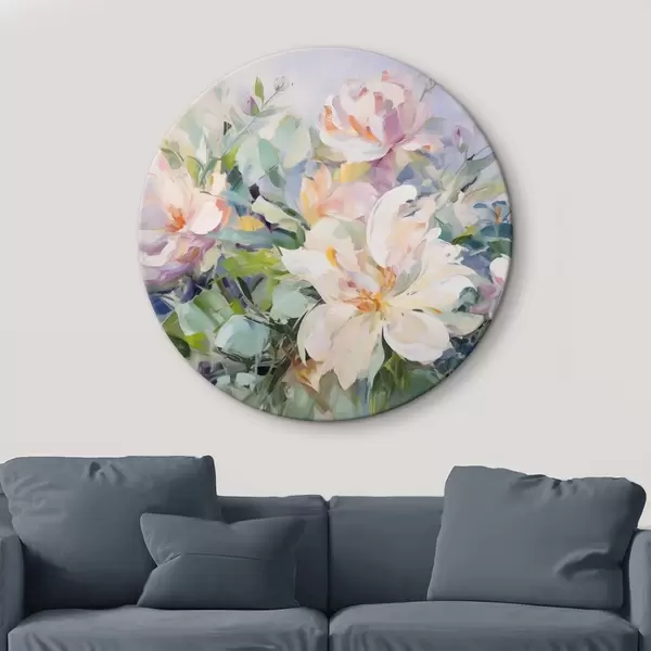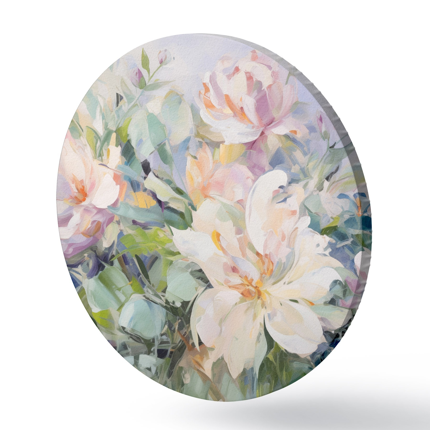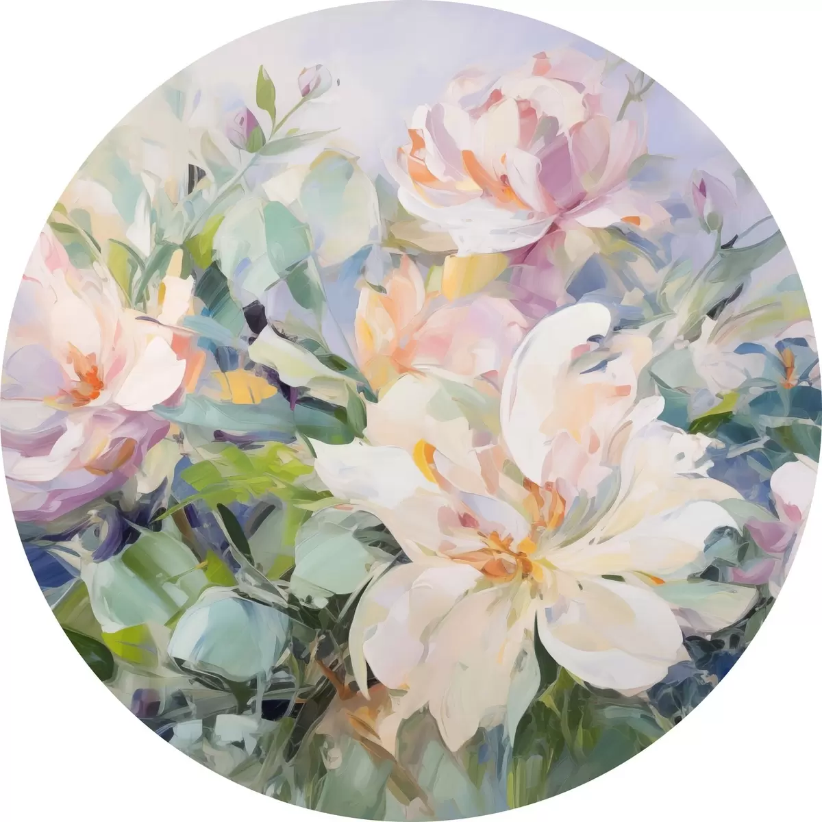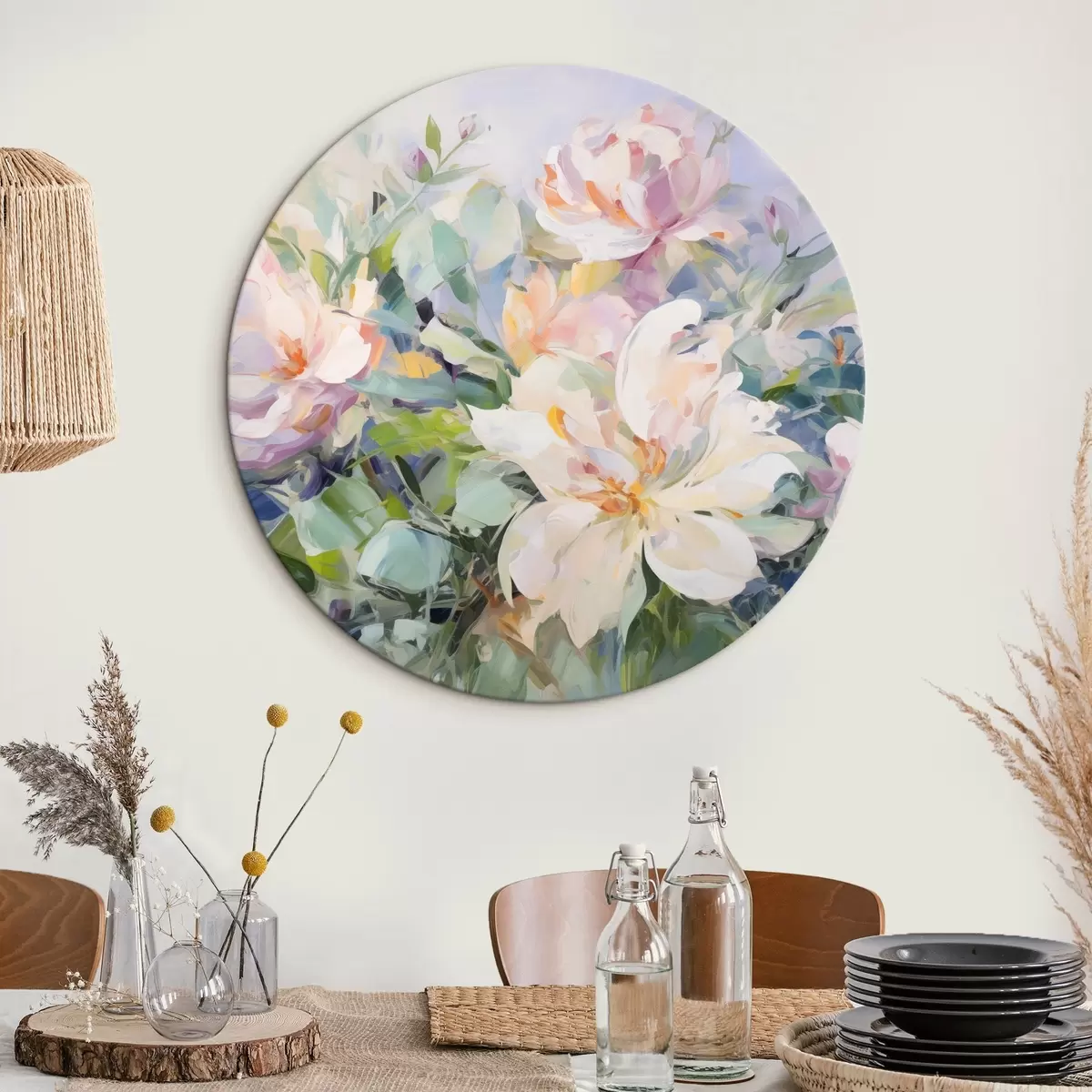 Cuadros redondos Arreglo floral con flores de color pastel y hojas azules, imitación de pintura al óleo r43390
