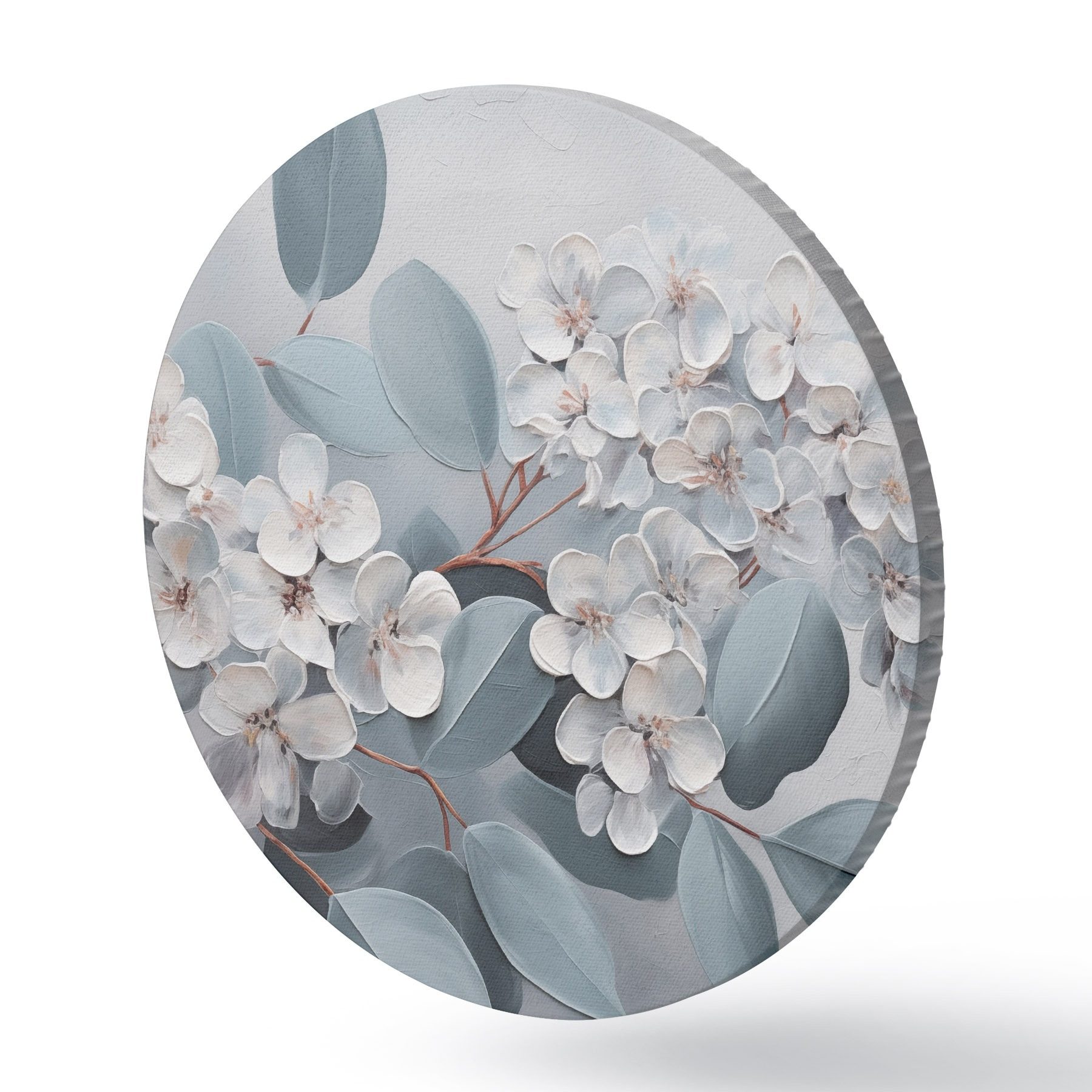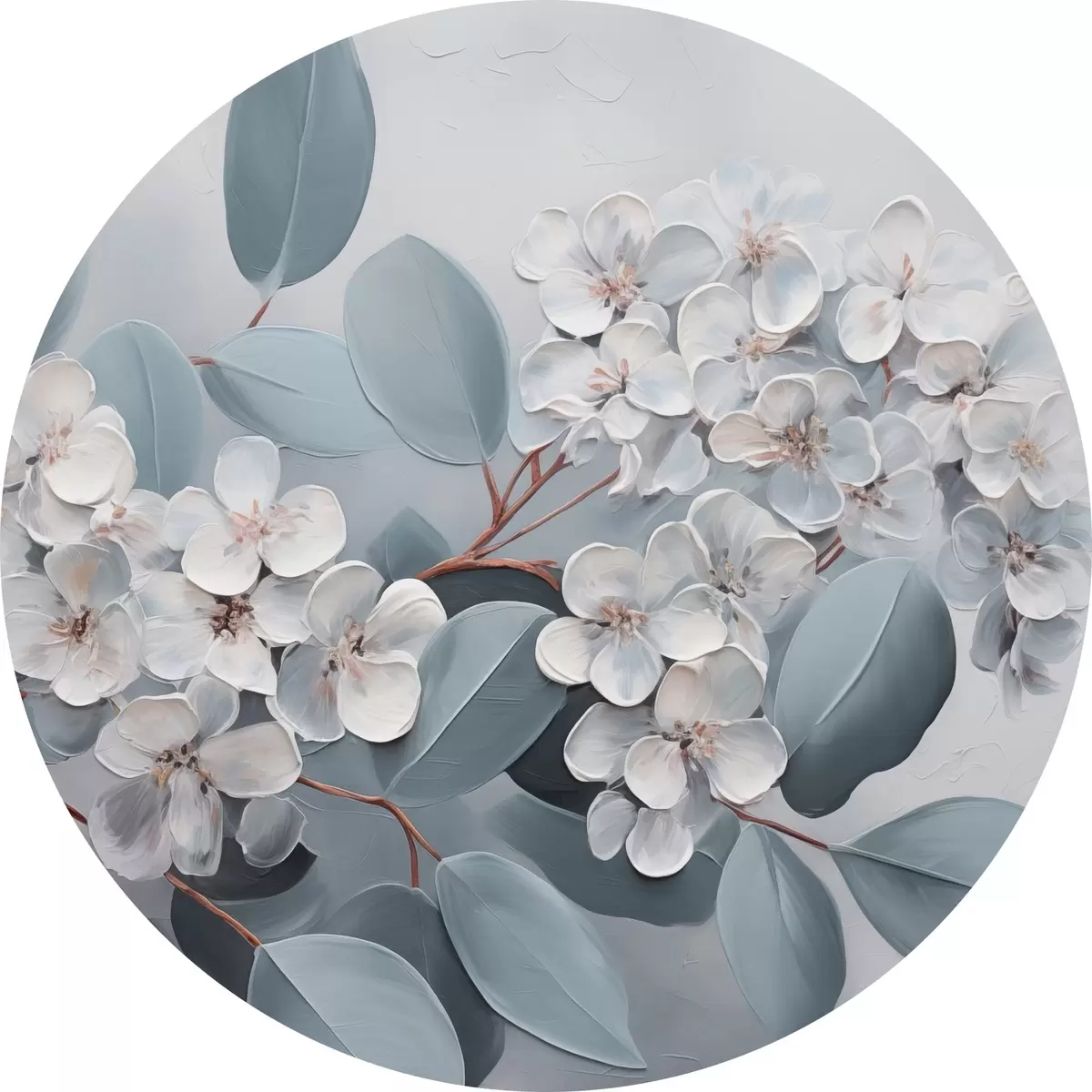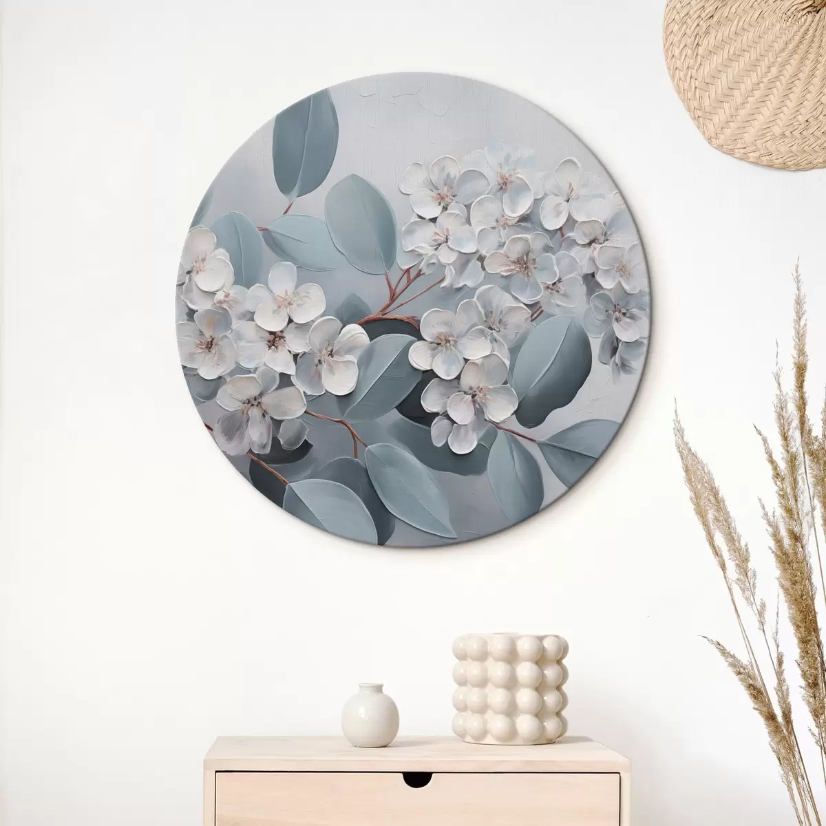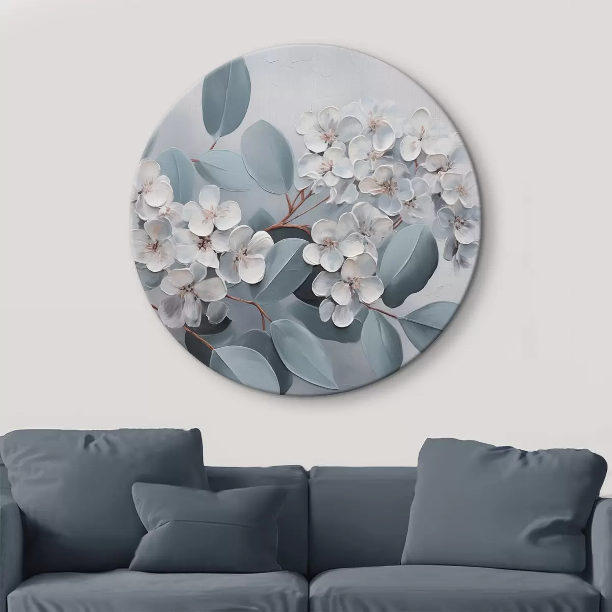 Cuadros redondos Una rama de flores de hortensia blanca en plena floración, con hojas azules sobre un fondo gris claro, estilo pintura al óleo r43391