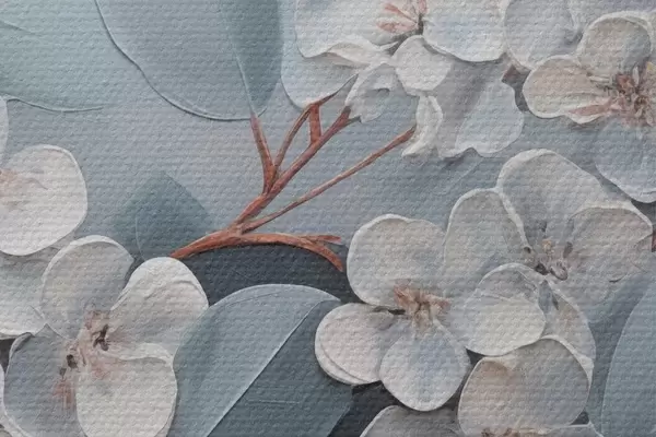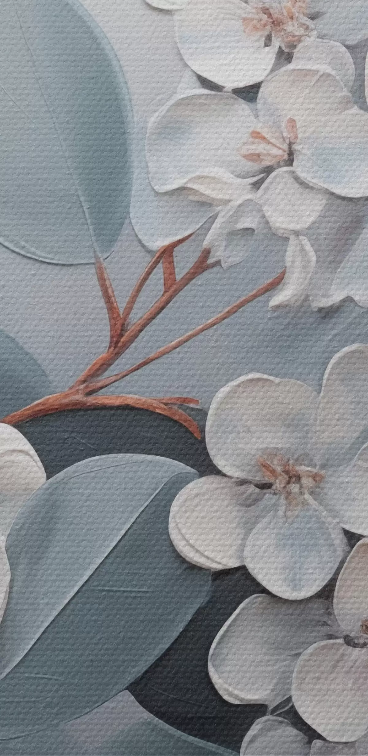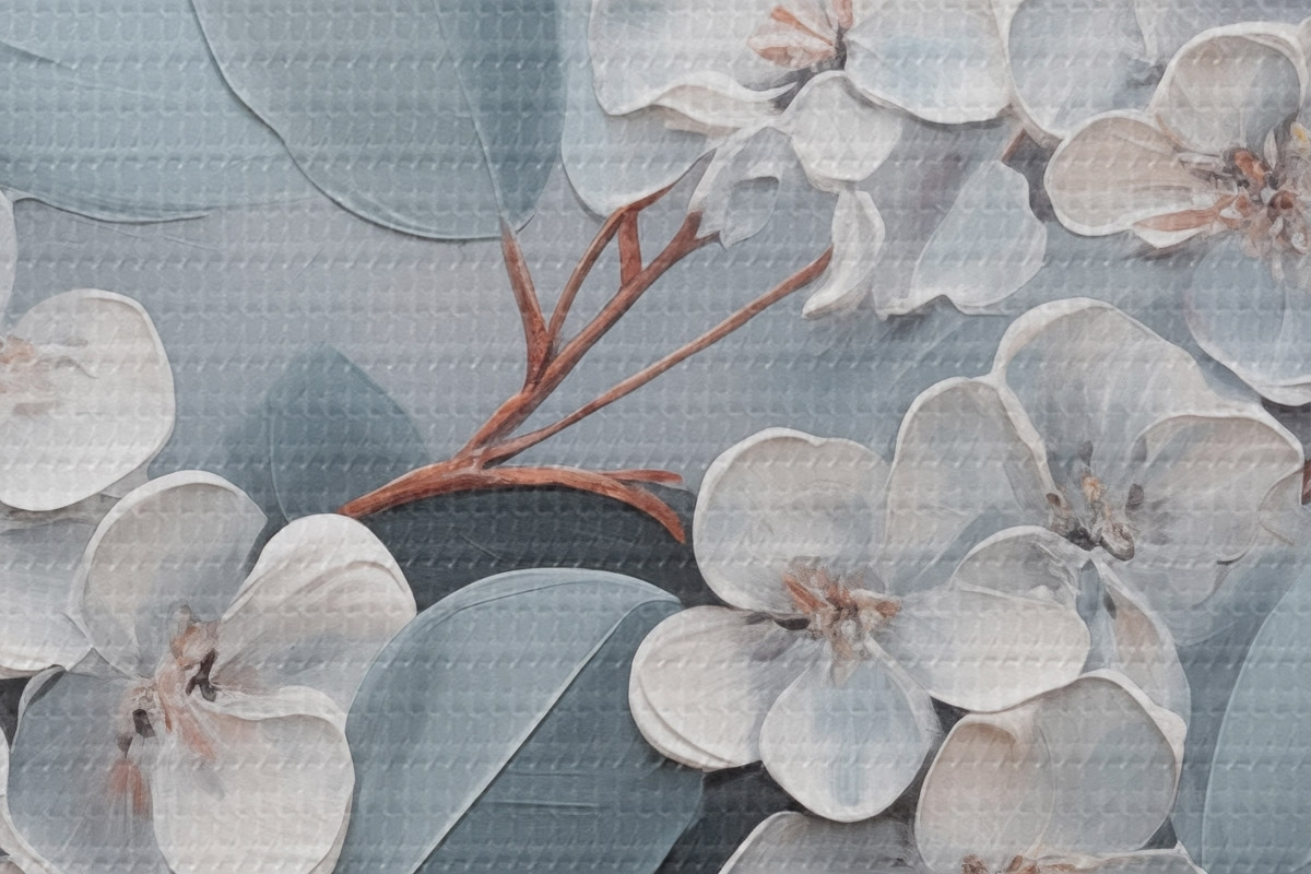 Foto Una rama de flores de hortensia blanca en plena floración, con hojas azules sobre un fondo gris claro, estilo pintura al óleo Nr r43391