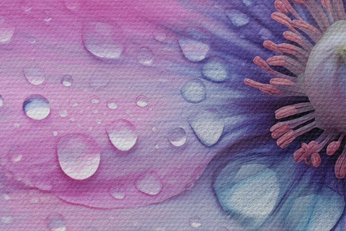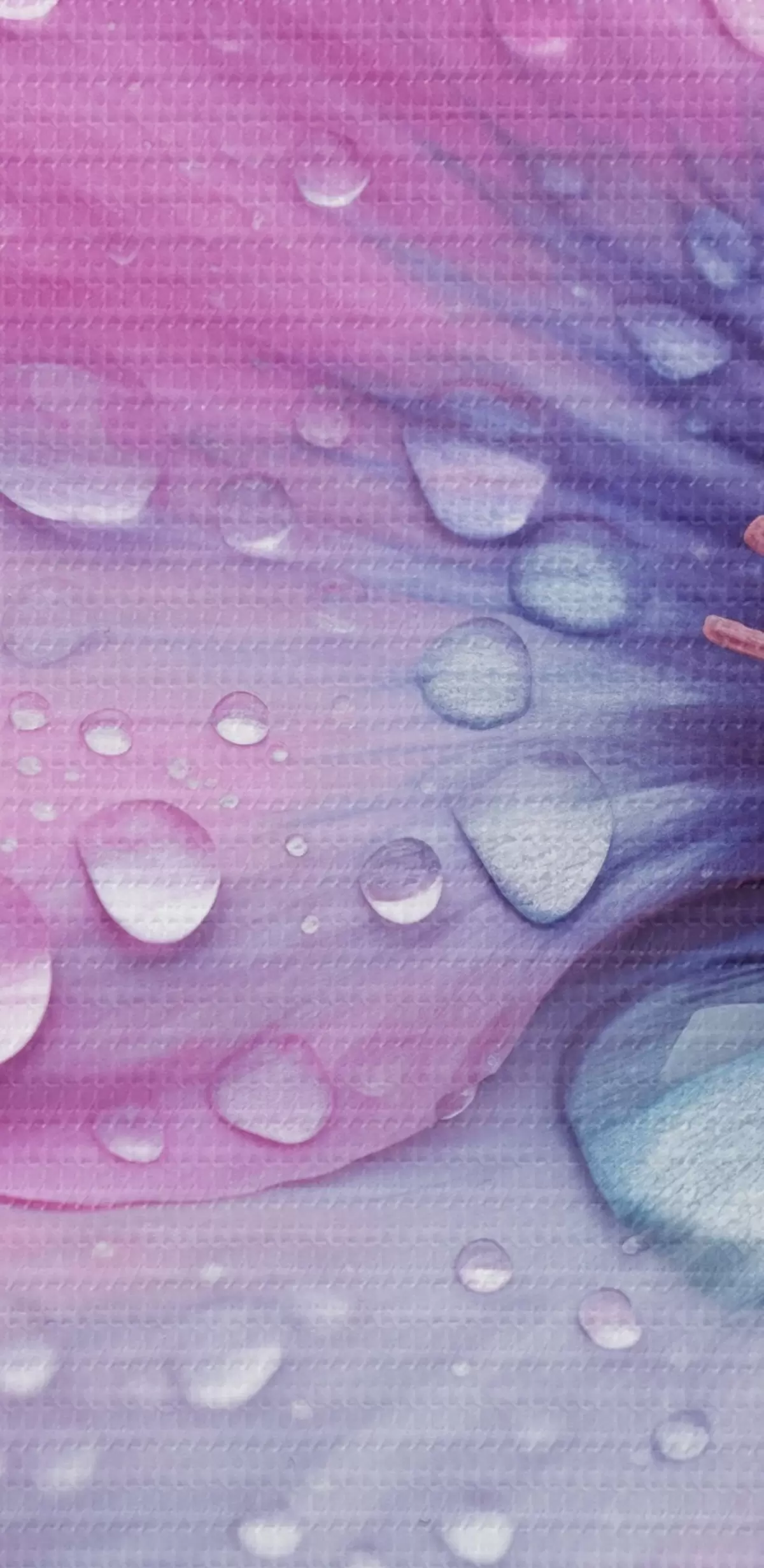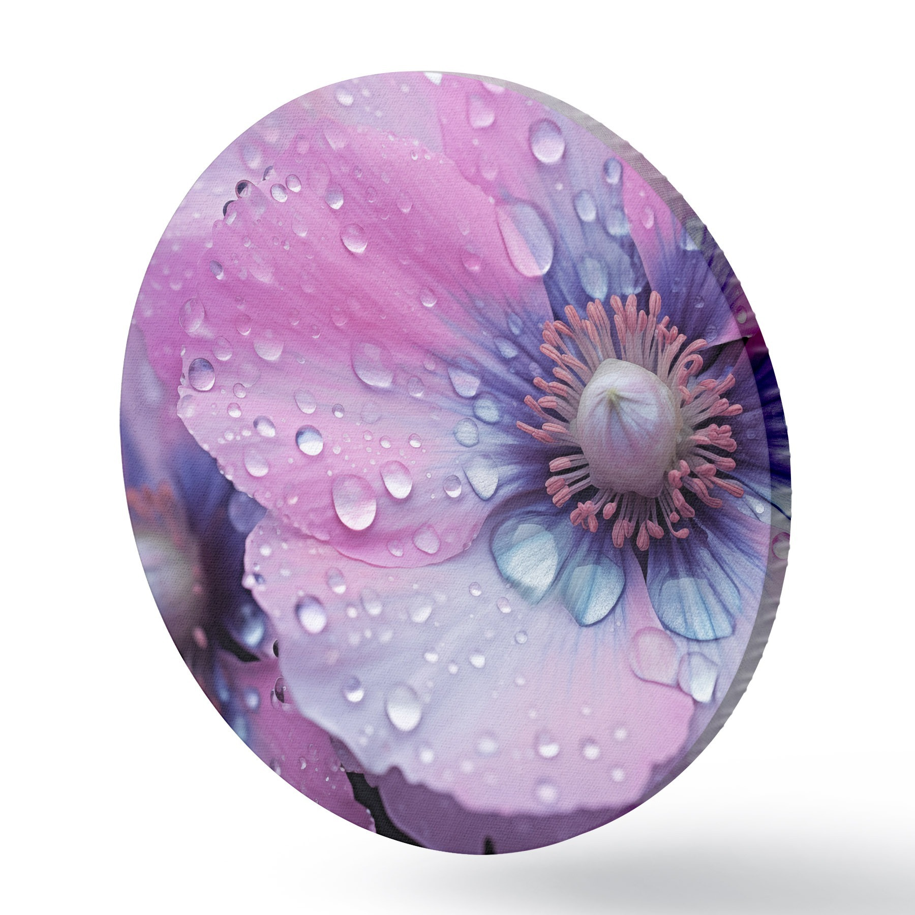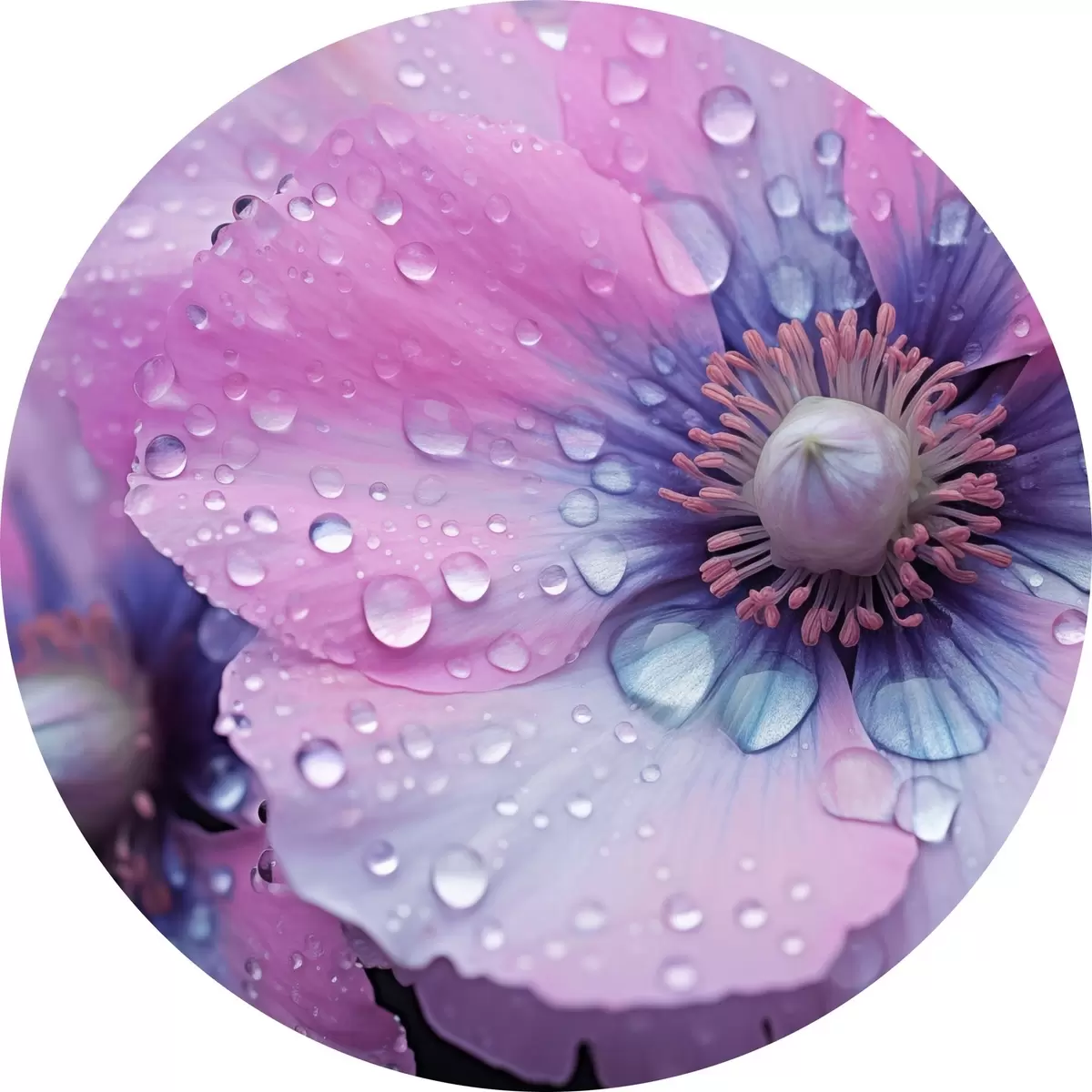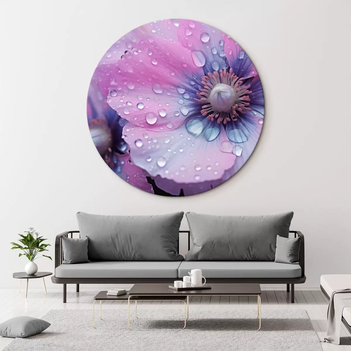 Cuadros redondos Flores rosas y moradas en plena floración cubiertas de gotas de agua, sobre fondo oscuro r43394