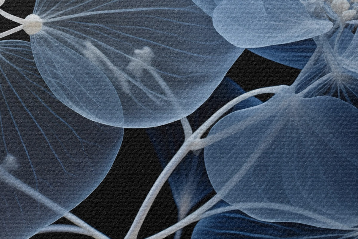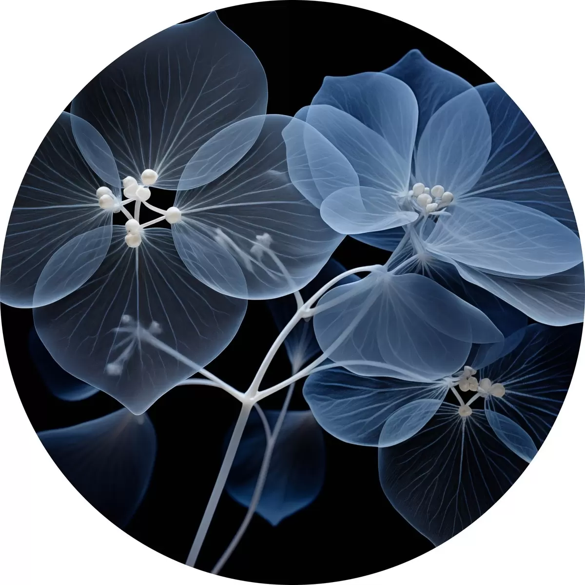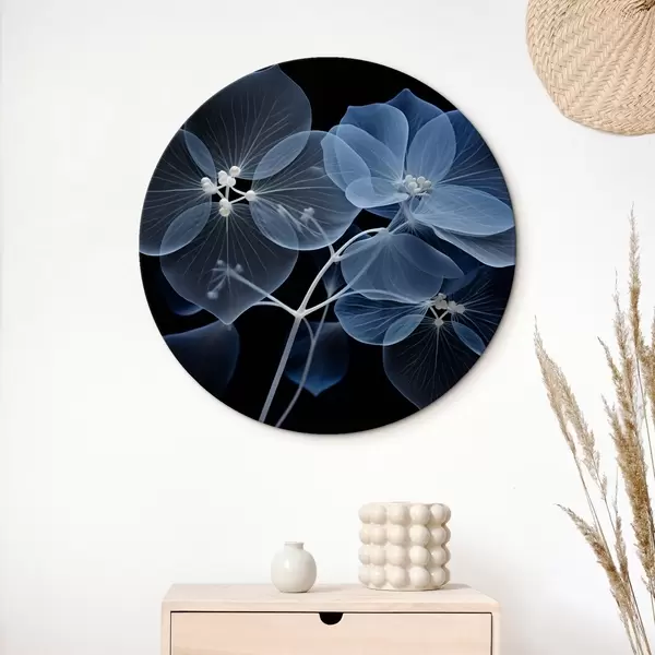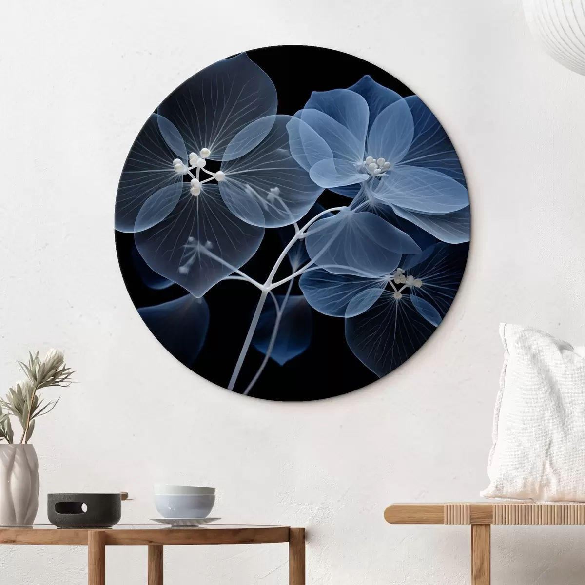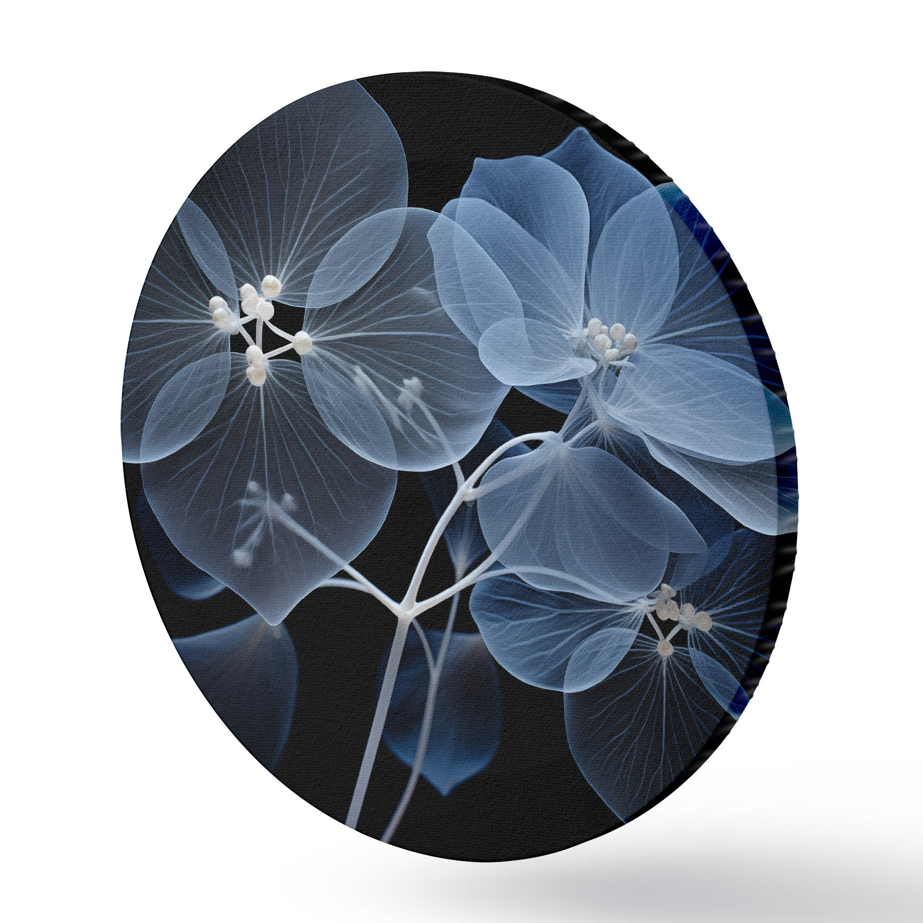 Cuadros redondos Una flor de hortensia azul translúcida con estambres azules y un delicado tallo, sobre fondo negro r43395