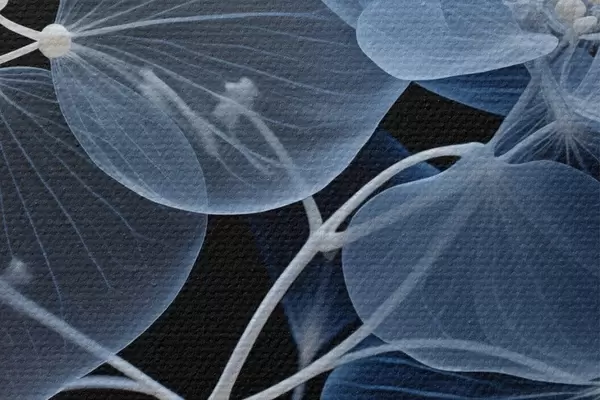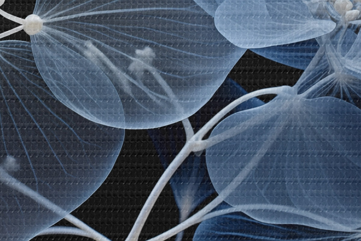 Foto Una flor de hortensia azul translúcida con estambres azules y un delicado tallo, sobre fondo negro Nr r43395