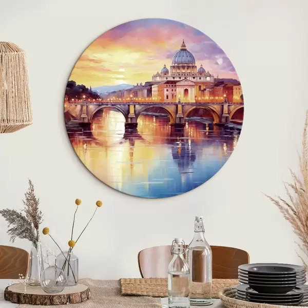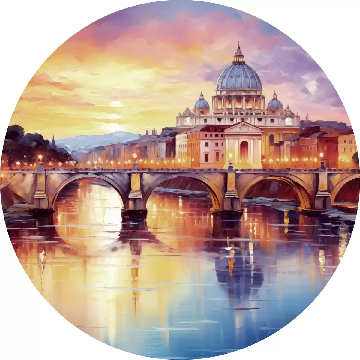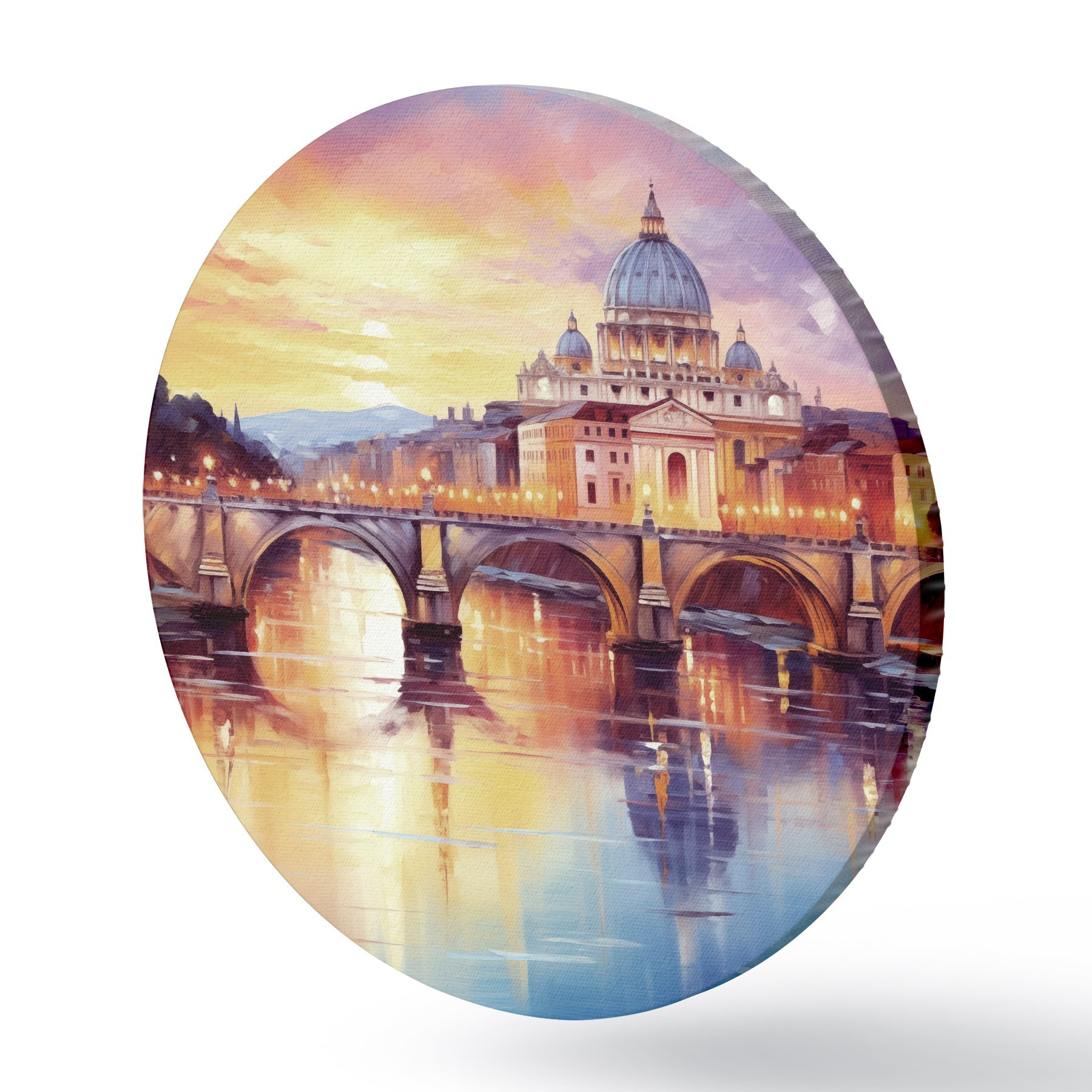 Cuadros redondos Basílica de San Pedro y puente sobre el río al atardecer, colores cálidos, reflejo en el agua, estilo pintura al óleo r43396