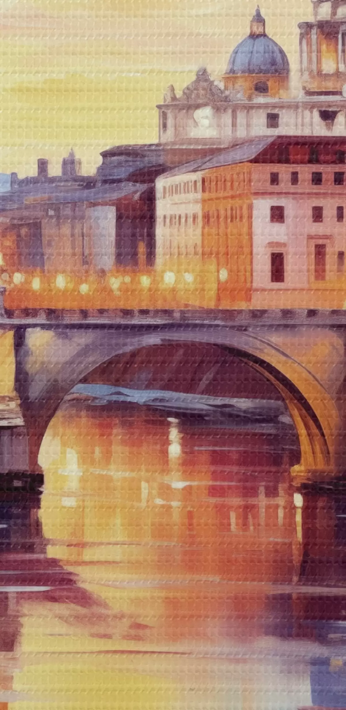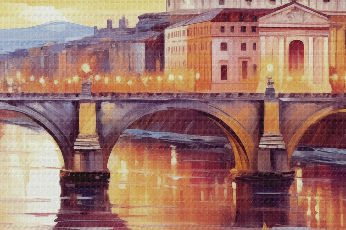 Foto Basílica de San Pedro y puente sobre el río al atardecer, colores cálidos, reflejo en el agua, estilo pintura al óleo Nr r43396