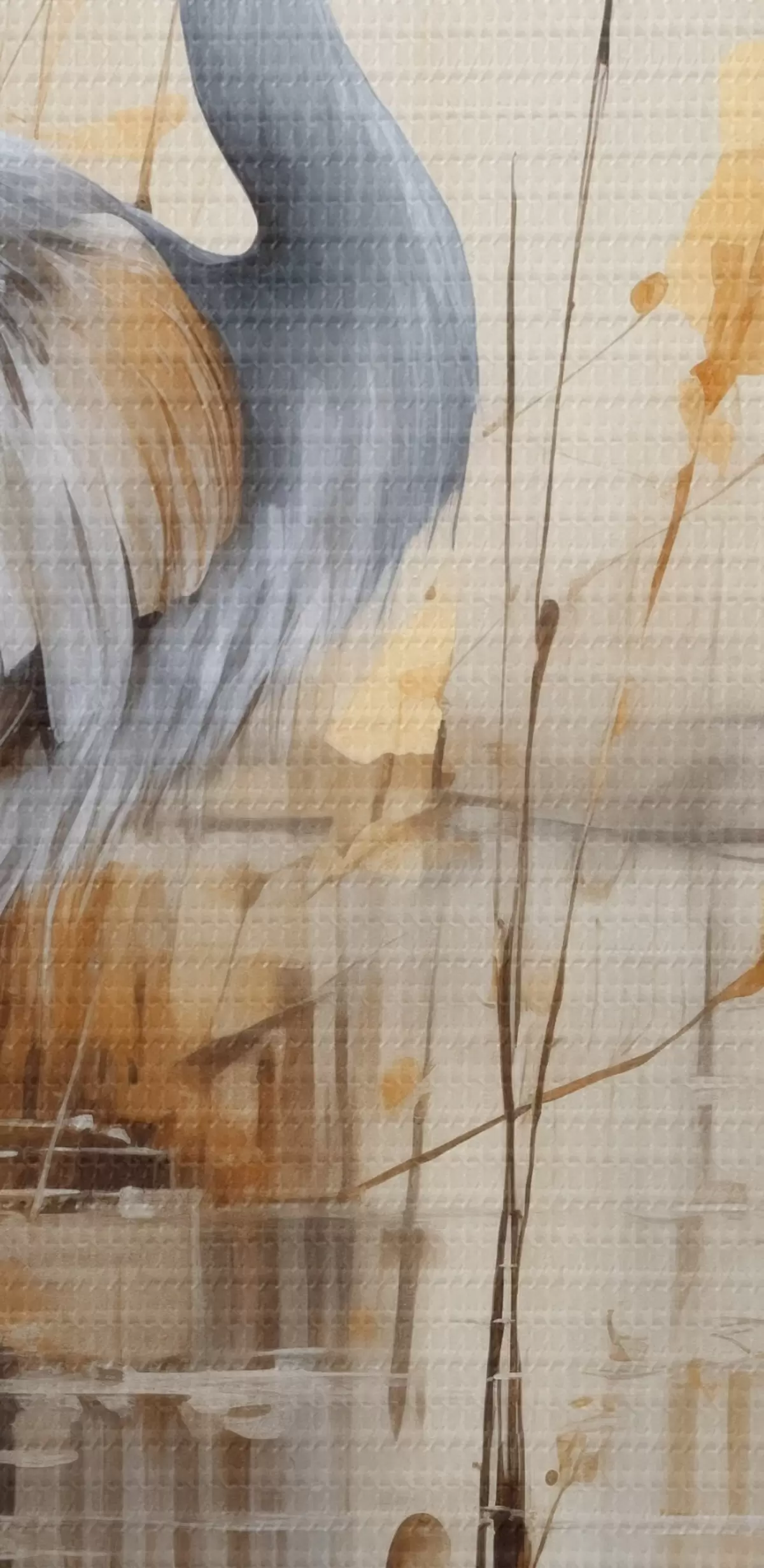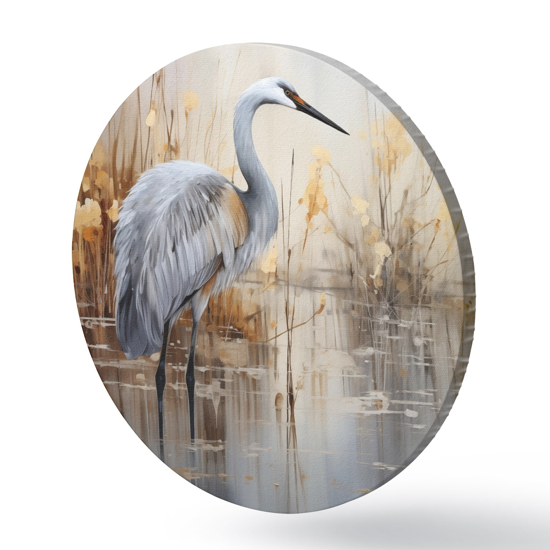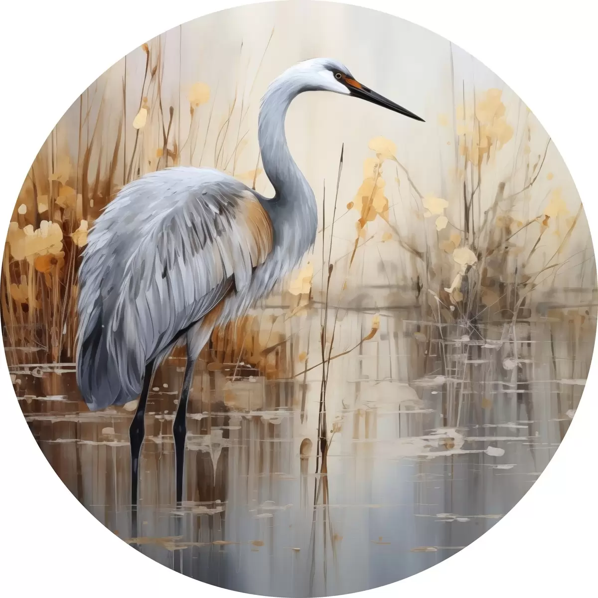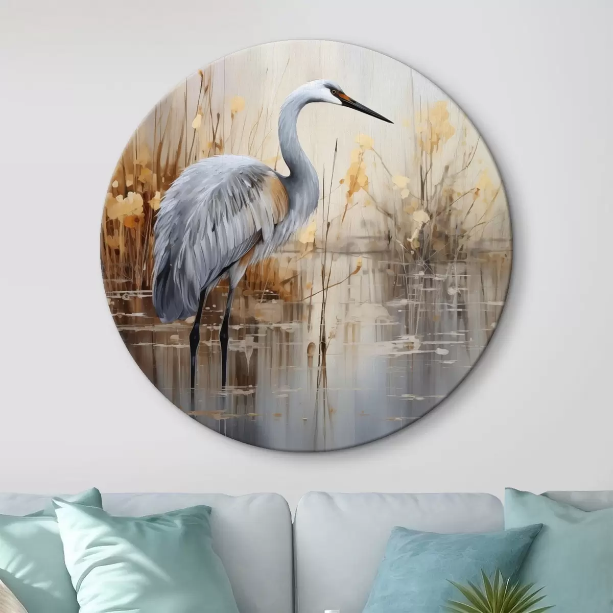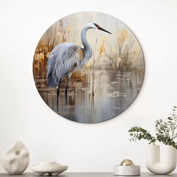Cuadros redondos Una garza real de pie en un estanque , rodeada de plantas altas y delgadas, el fondo es una suave mezcla de beige y blanco r43398