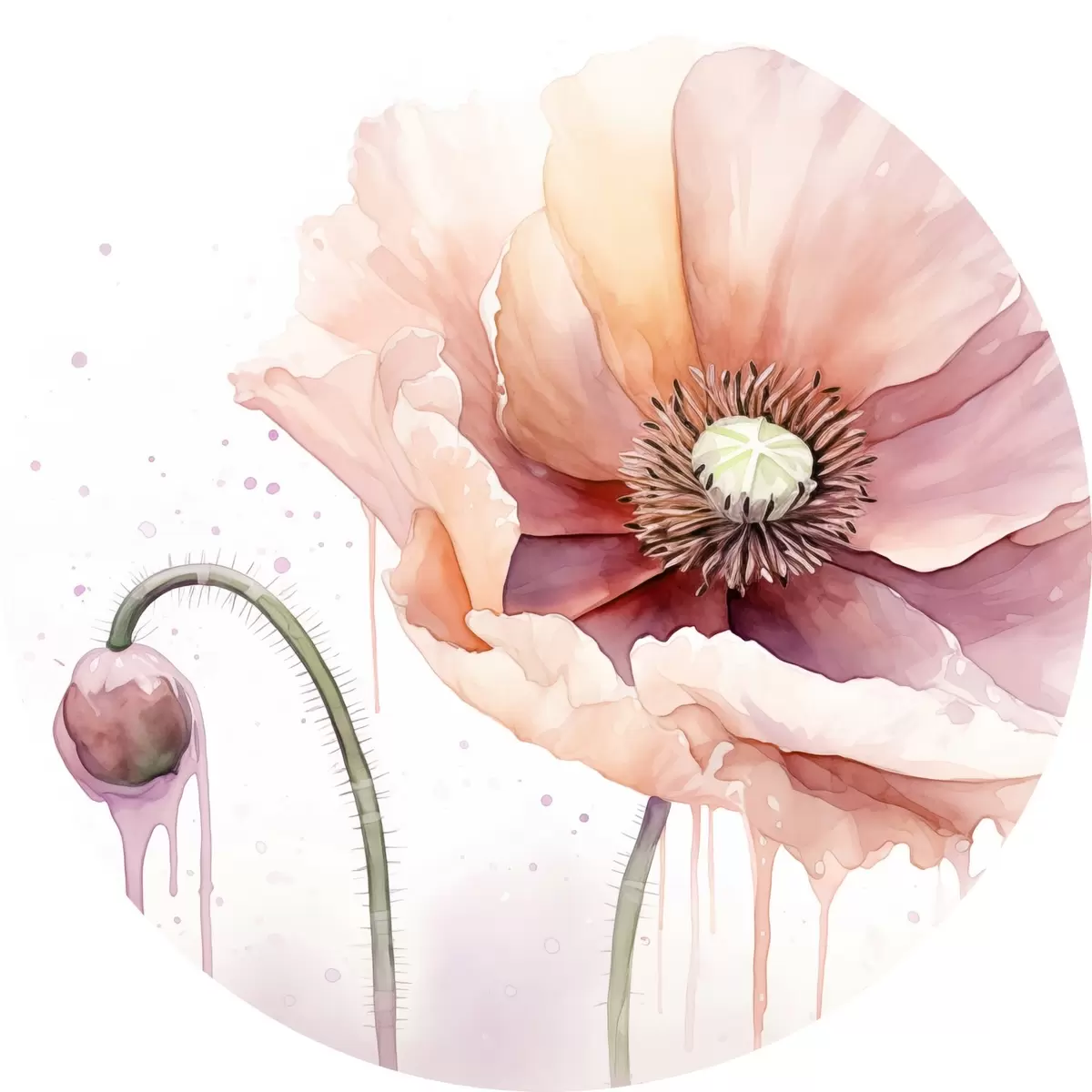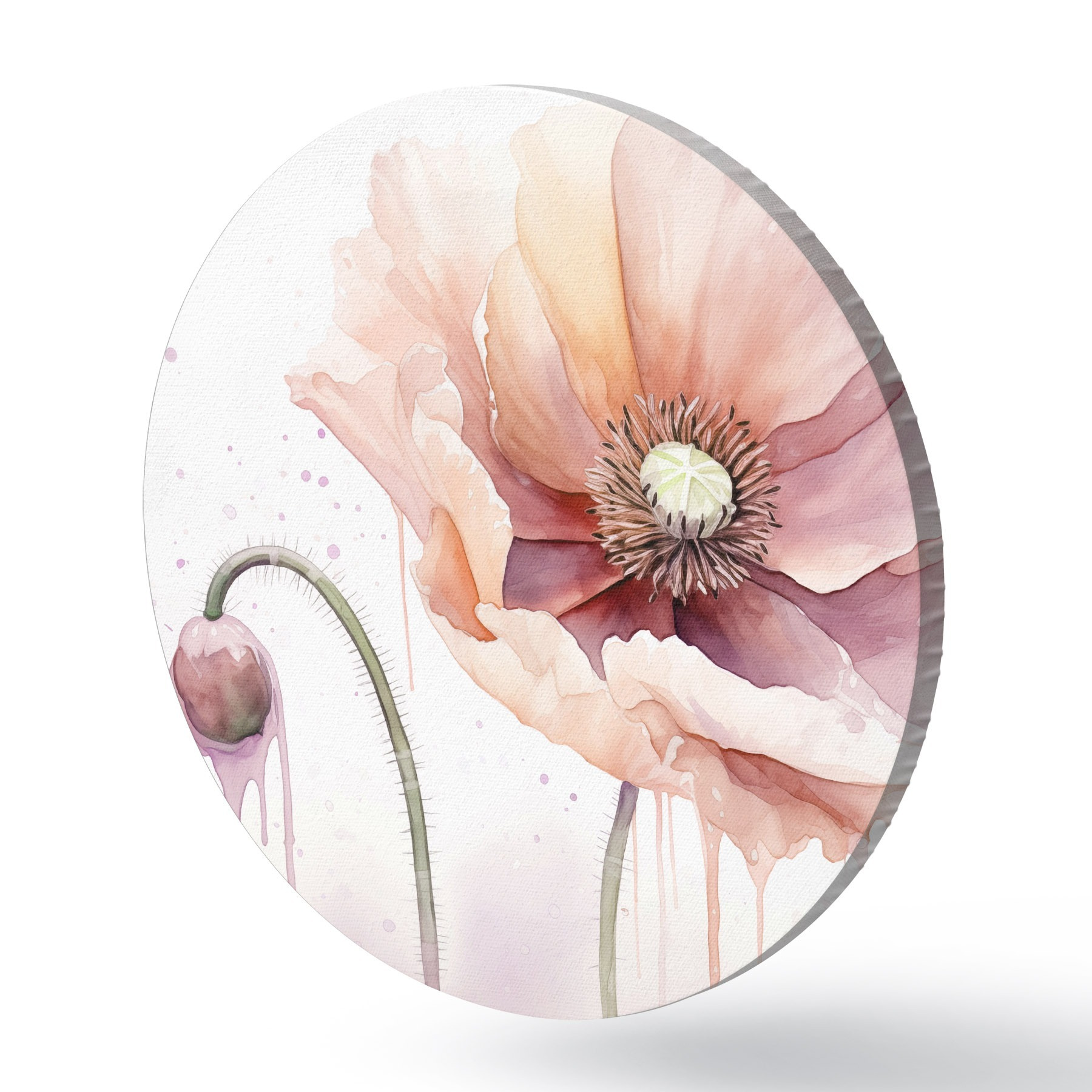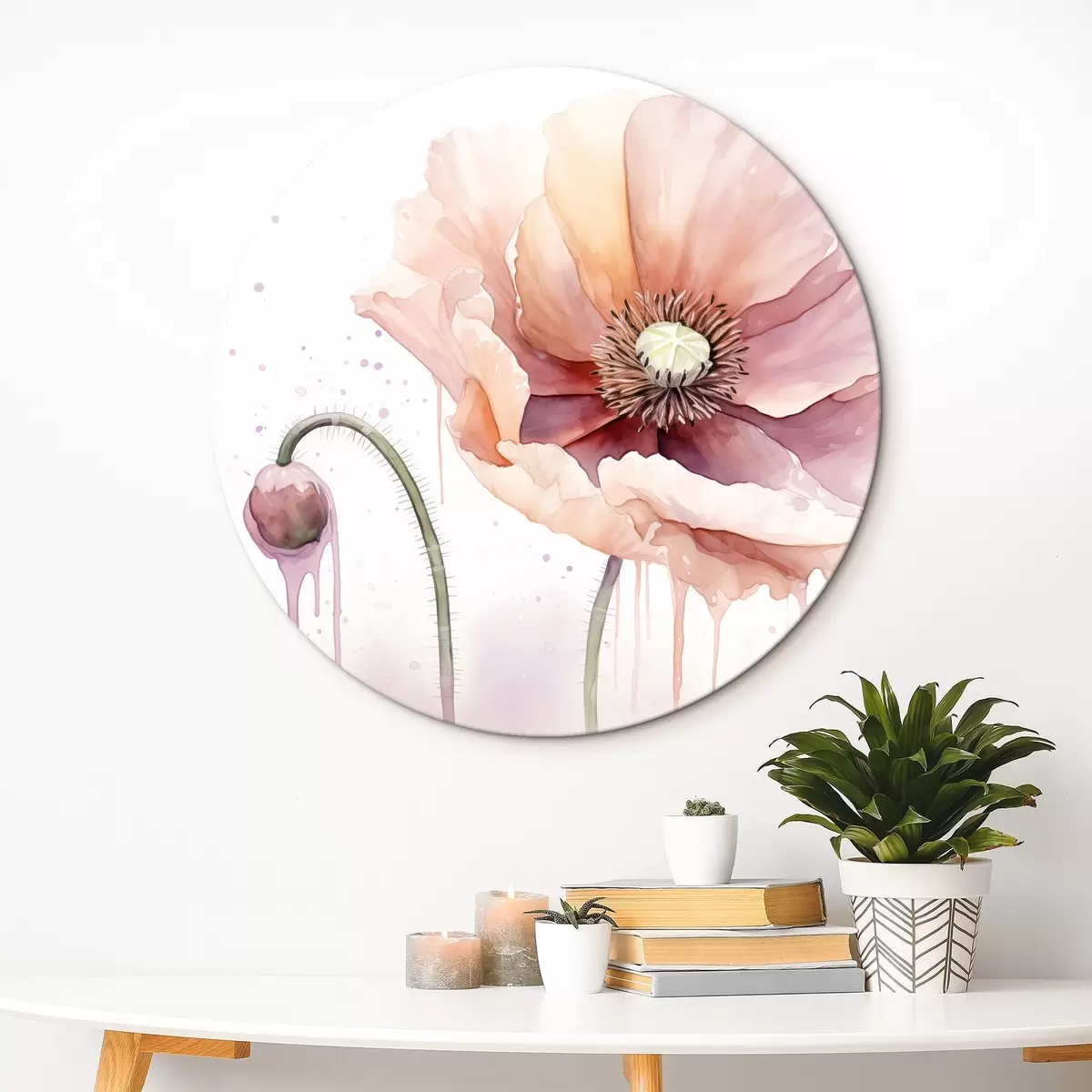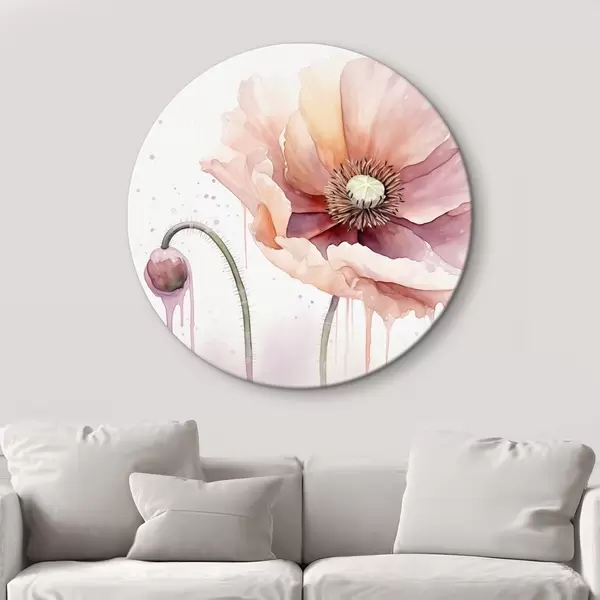 Cuadros redondos Una flor de amapola de color rosa con un capullo sobre un fondo blanco, acuarela pintura de imitación con goteos, colores suaves r43402