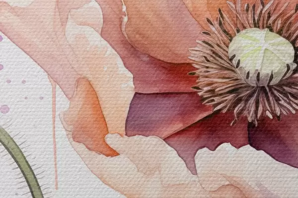Foto Una flor de amapola de color rosa con un capullo sobre un fondo blanco, acuarela pintura de imitación con goteos, colores suaves Nr r43402