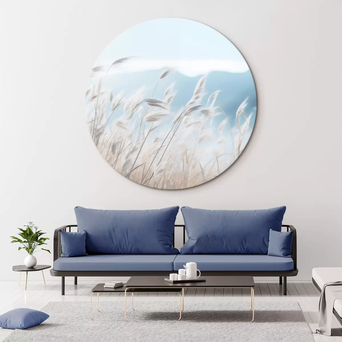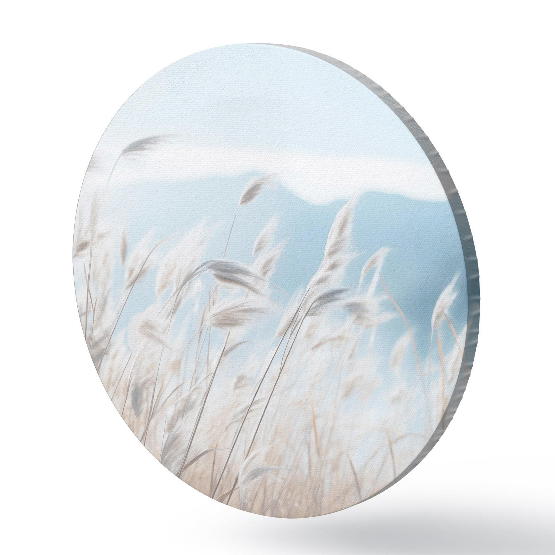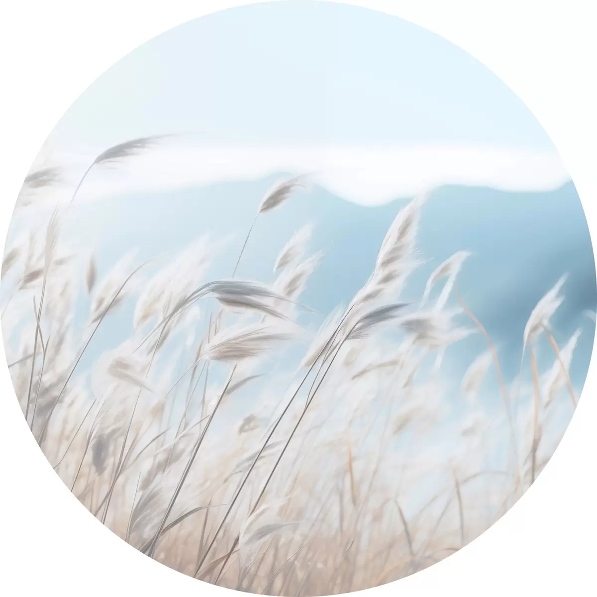 Cuadros redondos Hierba, campo pampeano con una montaña azul de fondo, cielo azul claro, minimalista, colores pastel r43404