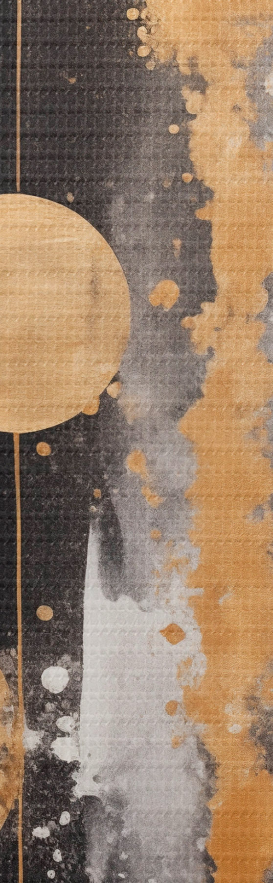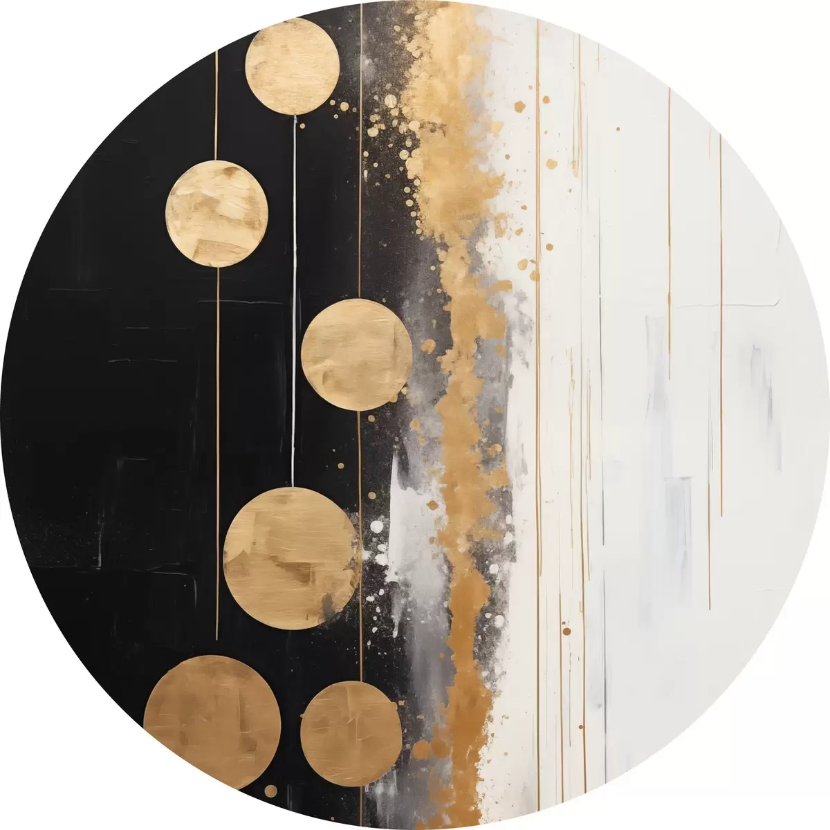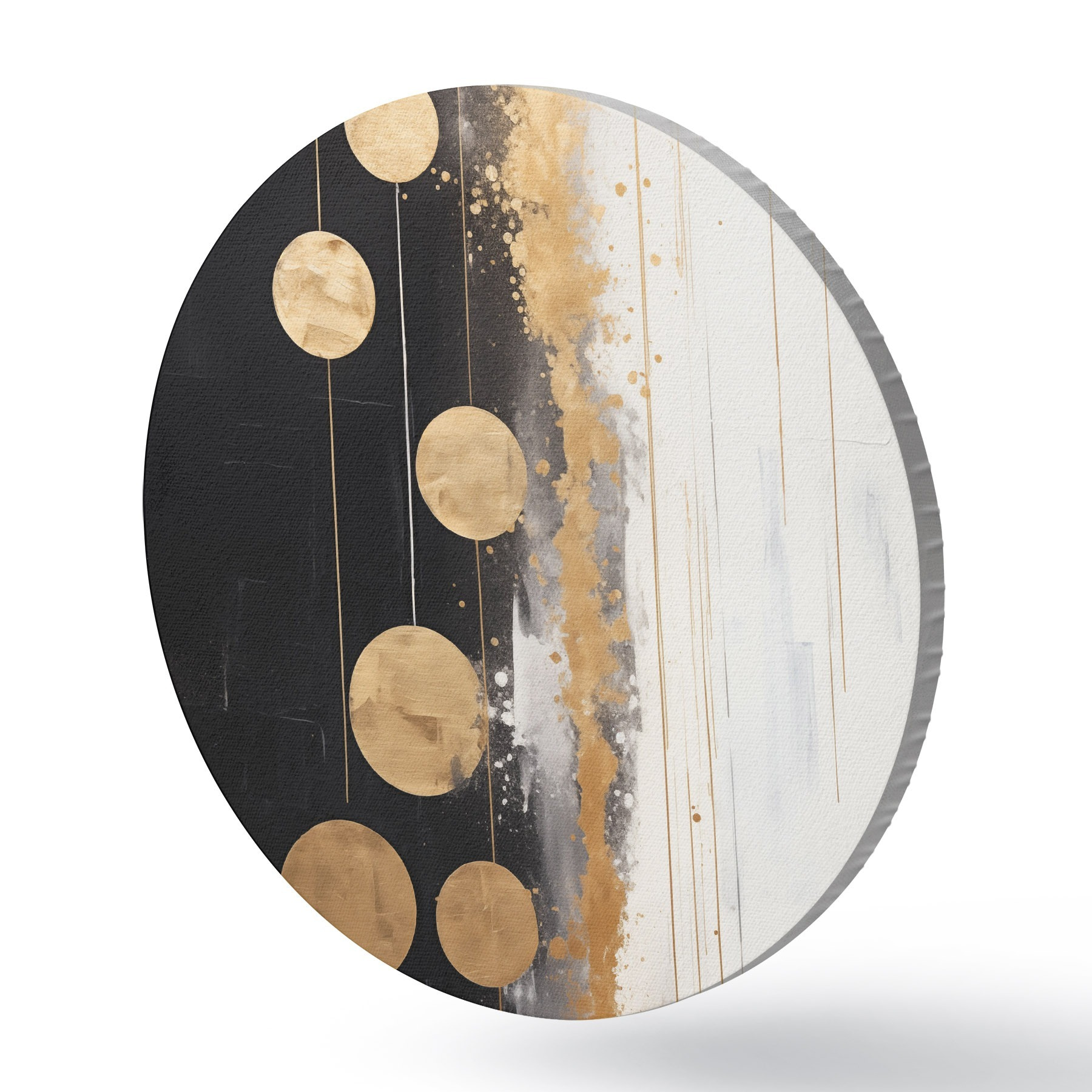 Cuadros redondos Arte abstracto con círculos amarillos colgando sobre fondo blanco y negro con manchas blancas y amarillas r43410