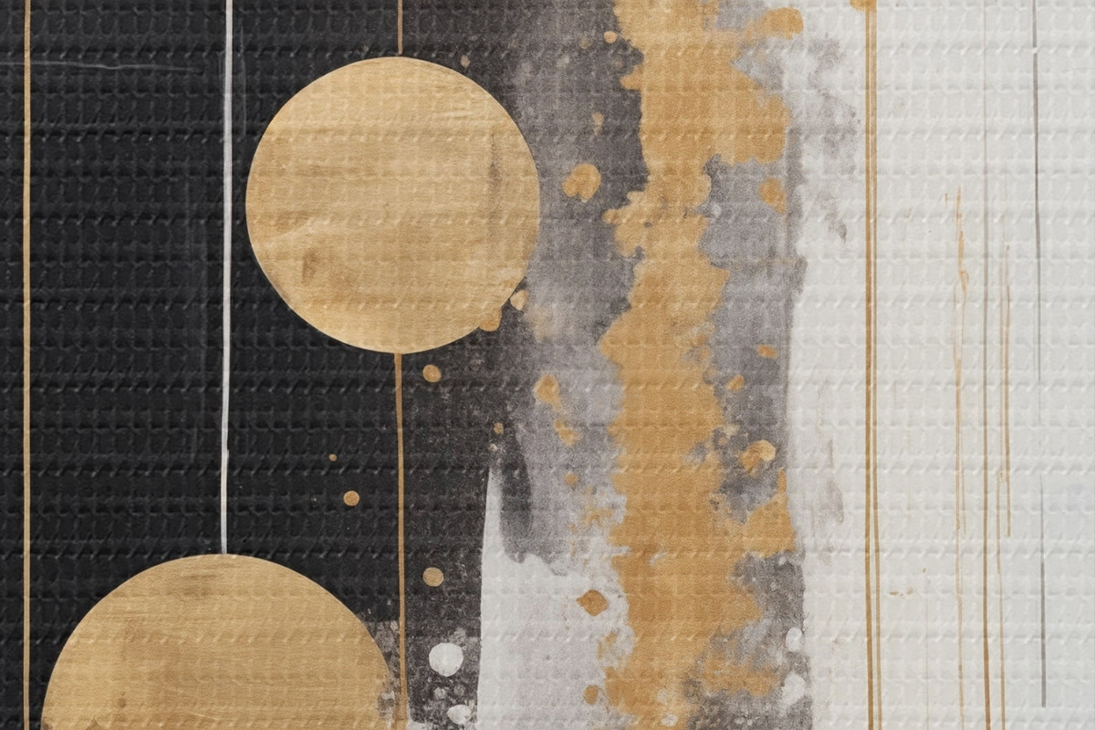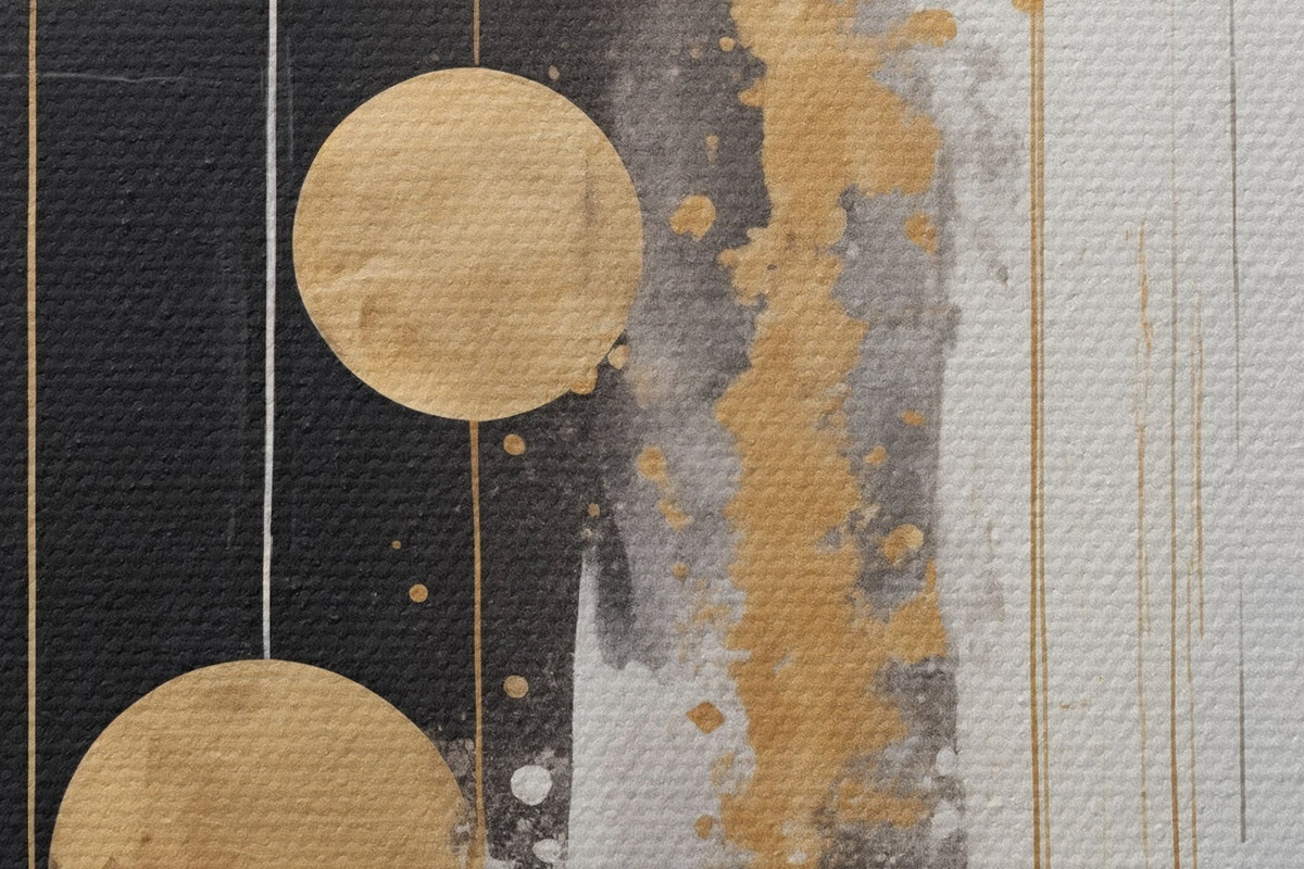 Foto Arte abstracto con círculos amarillos colgando sobre fondo blanco y negro con manchas blancas y amarillas Nr r43410