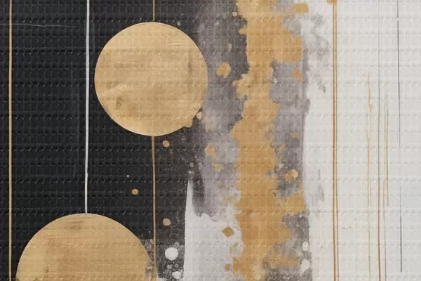 Cuadros redondos Arte abstracto con círculos amarillos colgando sobre fondo blanco y negro con manchas blancas y amarillas r43410