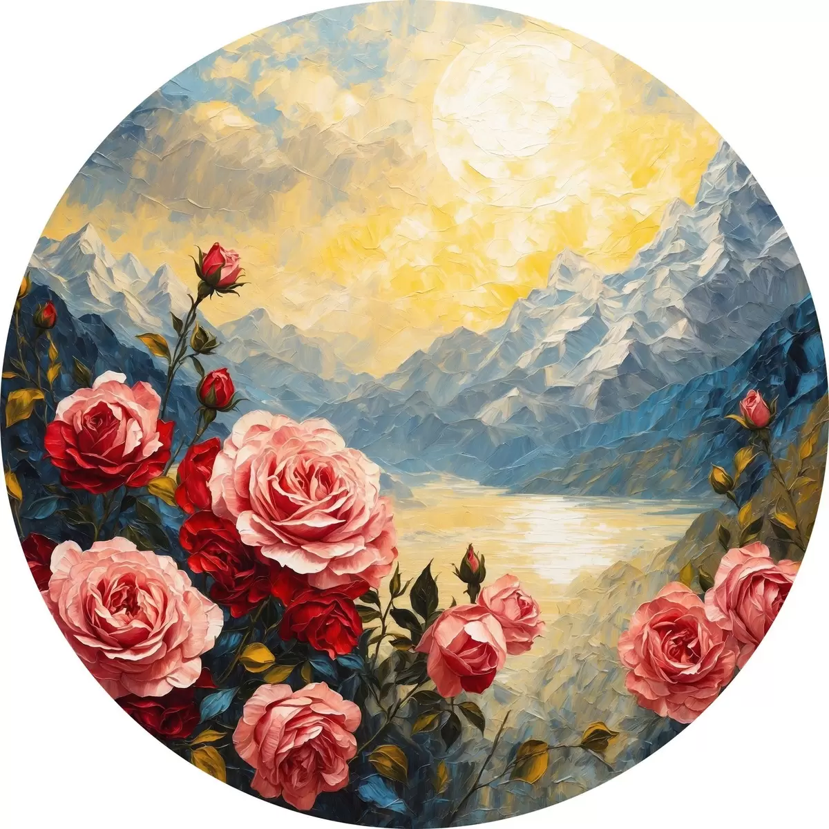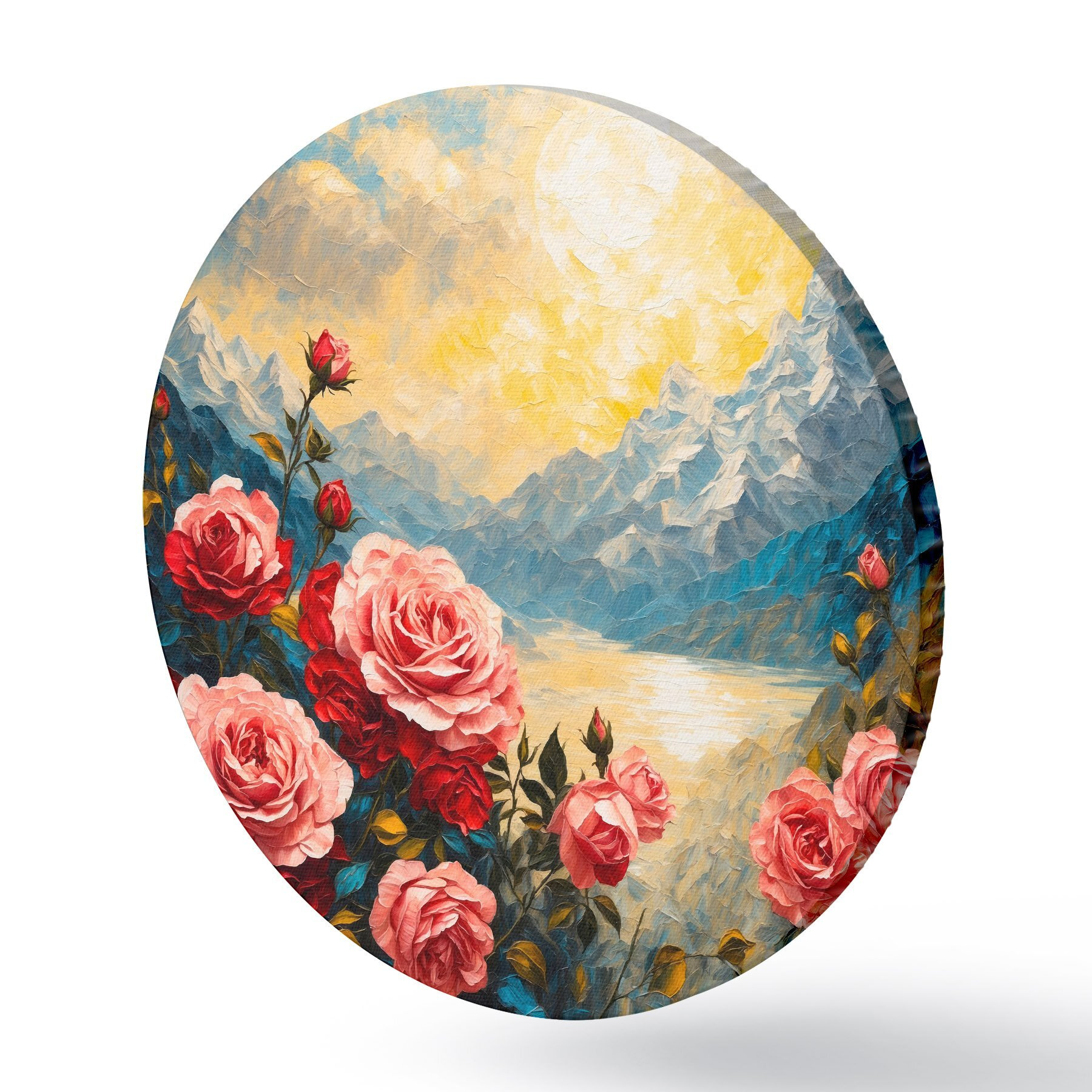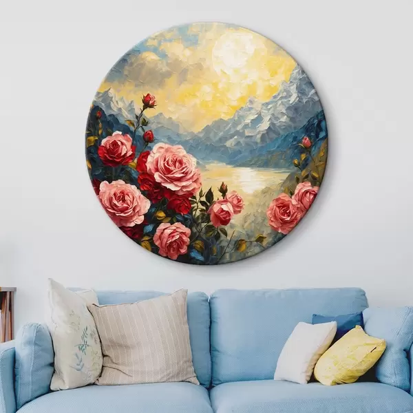 Cuadros redondos Rosas sobre fondo de montañas al óleo r43457