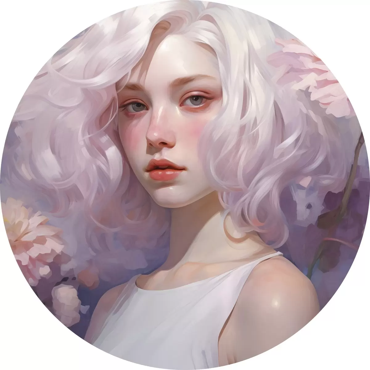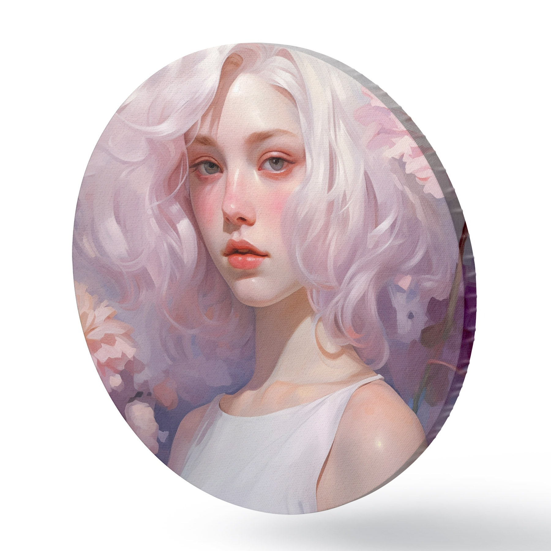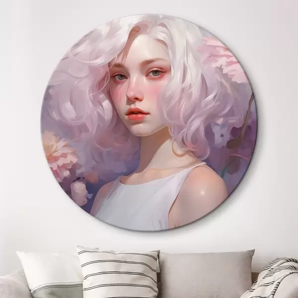 Cuadros redondos Hermosa chica en las flores, dibujo estilo acrílico, Japón, colores púrpura r43495
