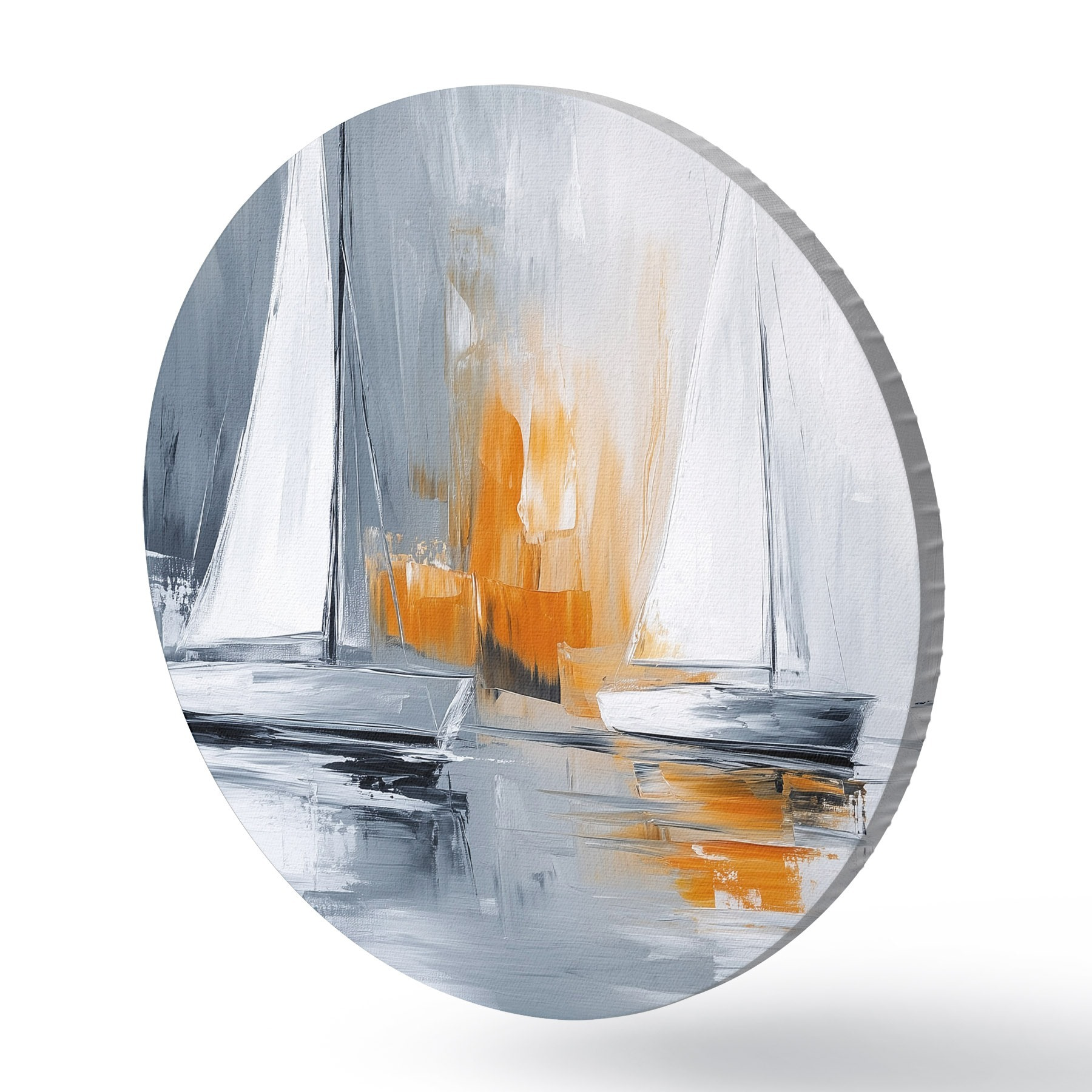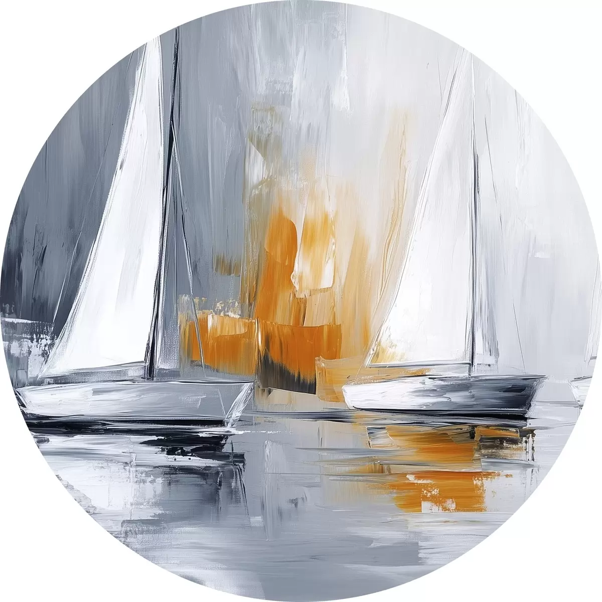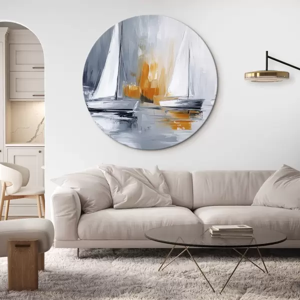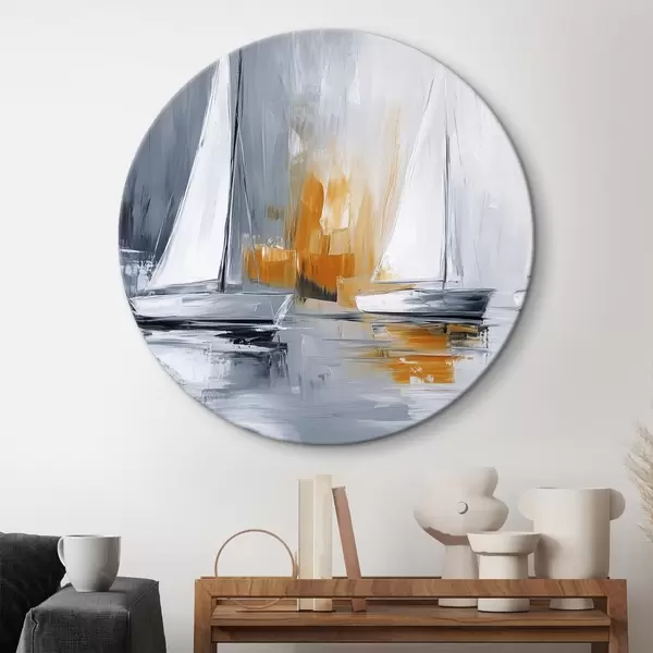 Cuadros redondos Veleros, abstracción, dibujo estilo acrílico, gris y naranja r43499