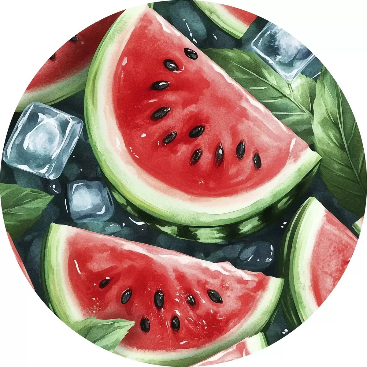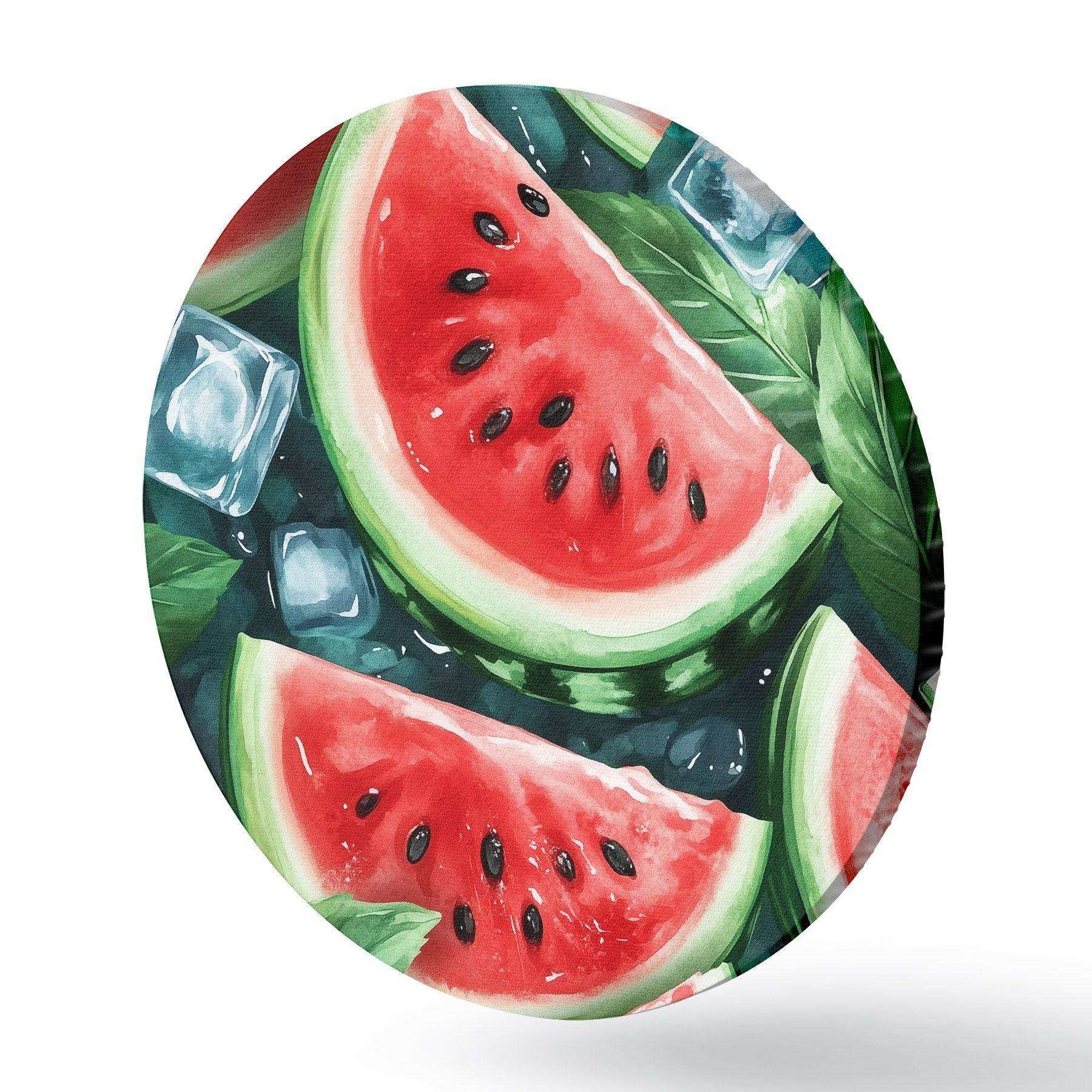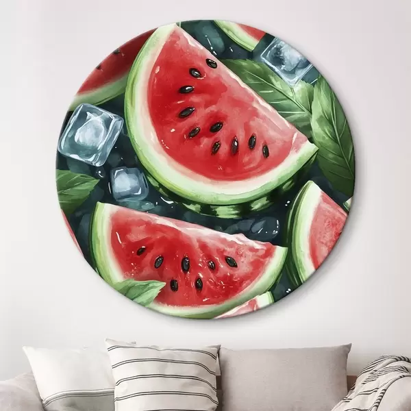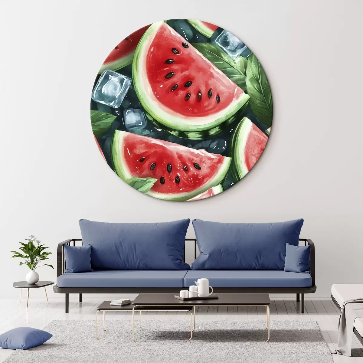 Cuadros redondos Rodajas de sandía con cubitos de hielo y menta, estilo acuarela r43880