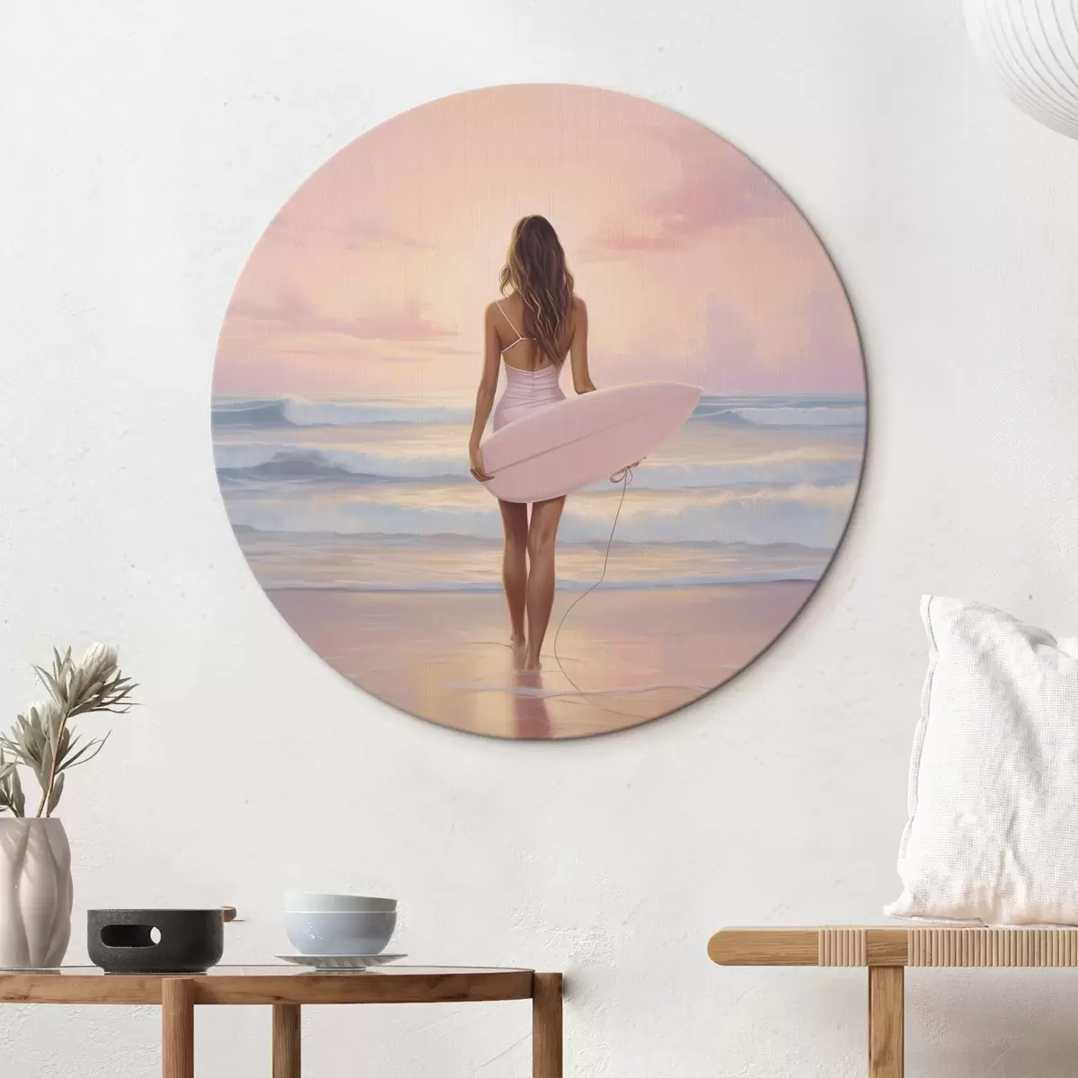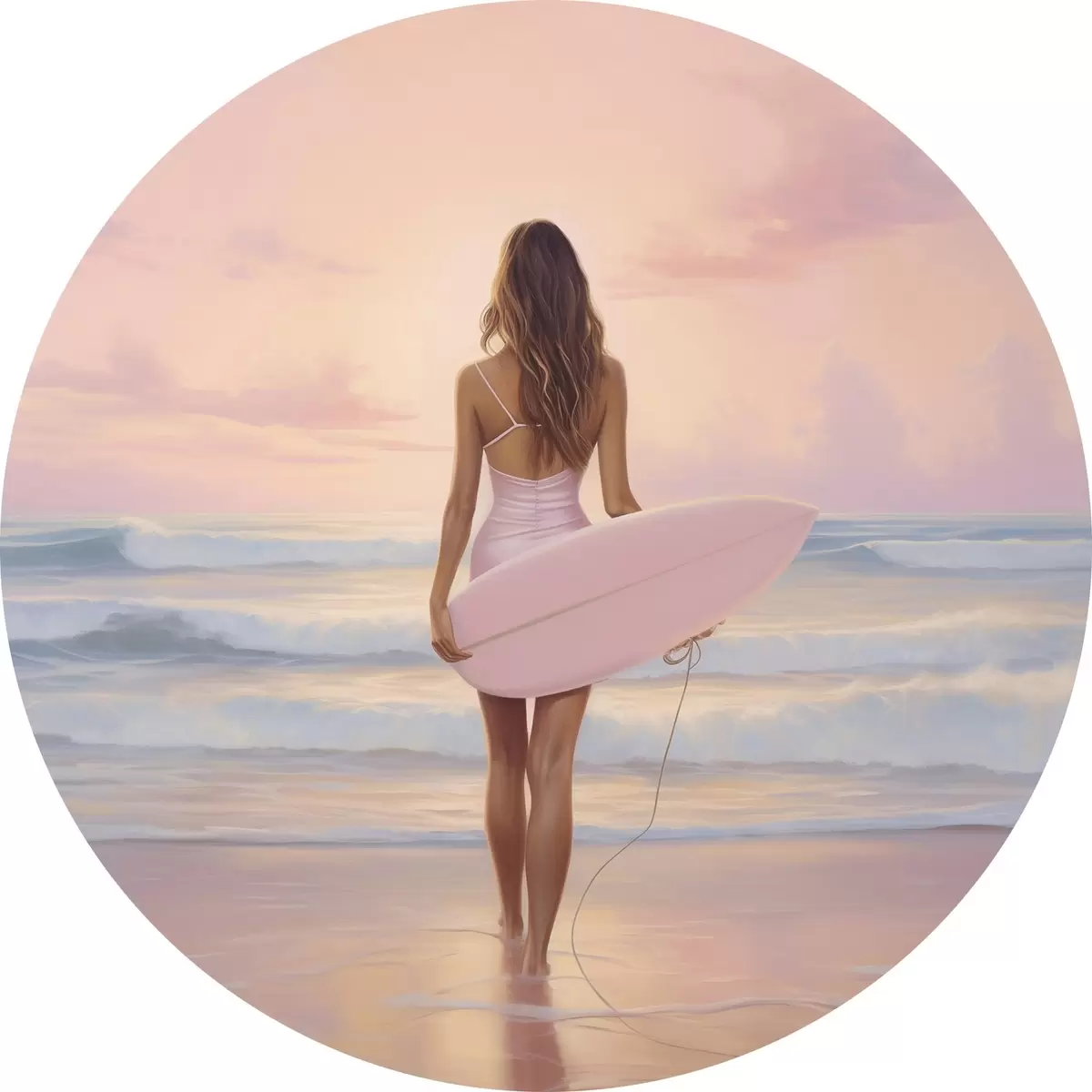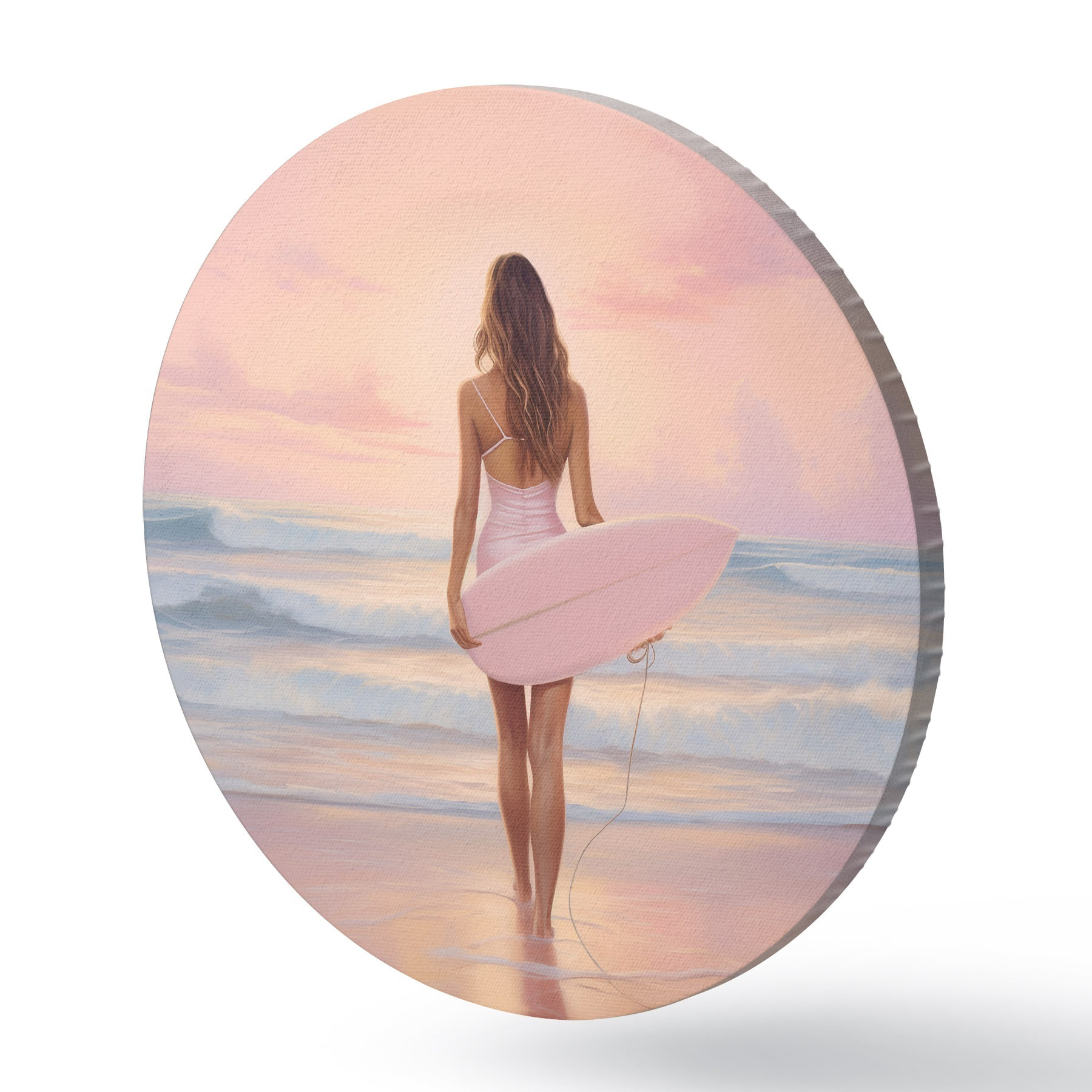 Cuadros redondos Chica con tabla de surf en la playa del océano, puesta de sol, dibujo estilo acrílico r43881