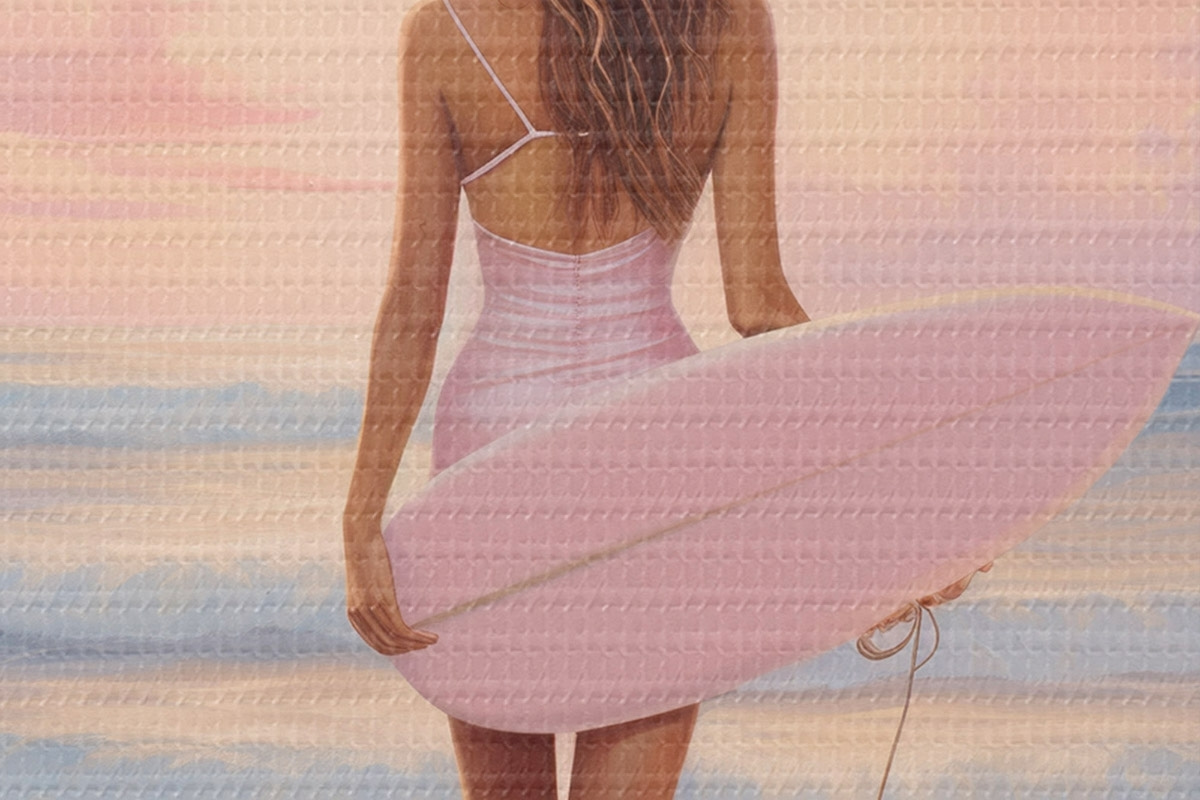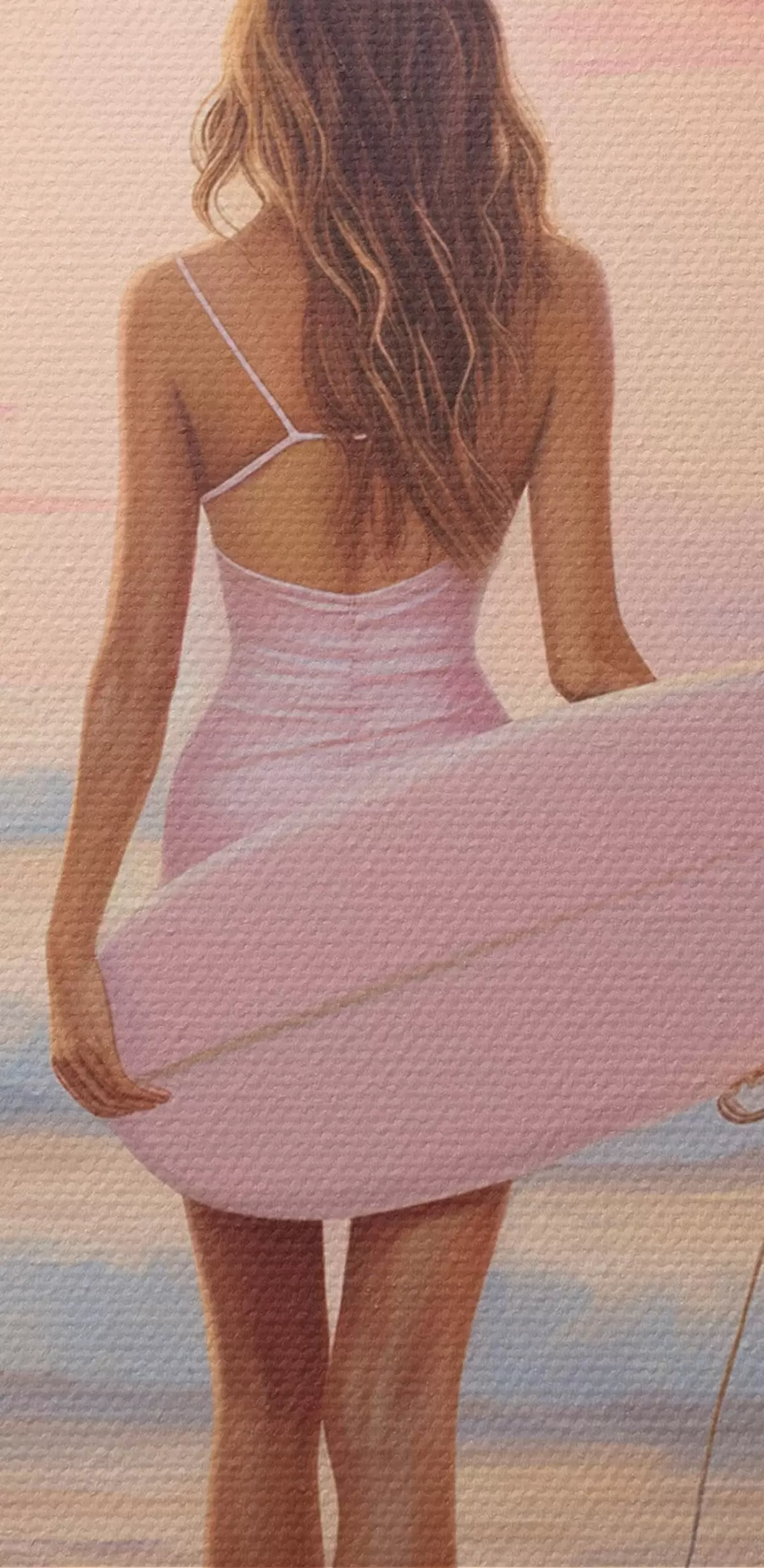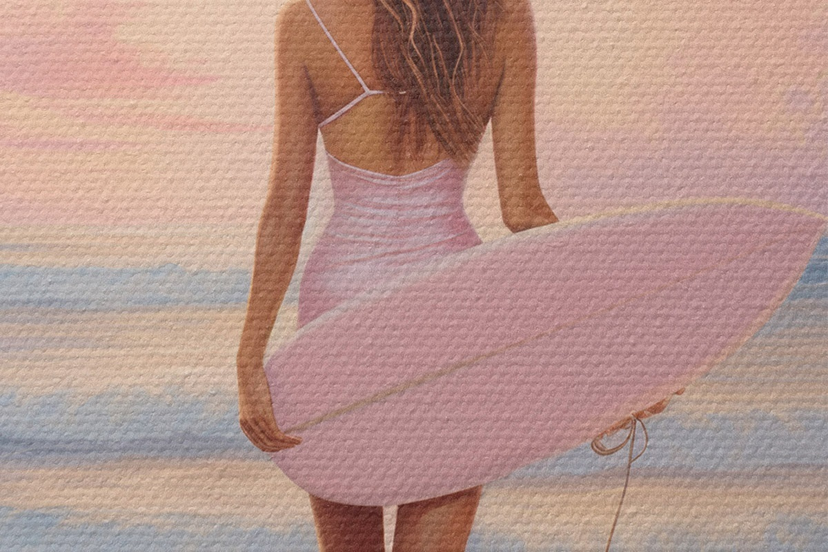 Foto Chica con tabla de surf en la playa del océano, puesta de sol, dibujo estilo acrílico Nr r43881