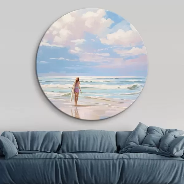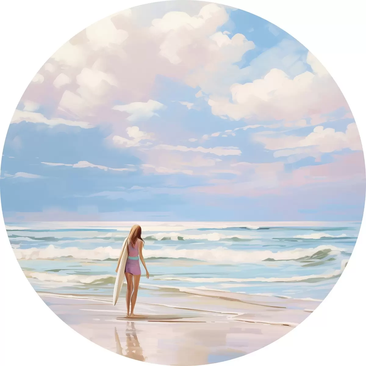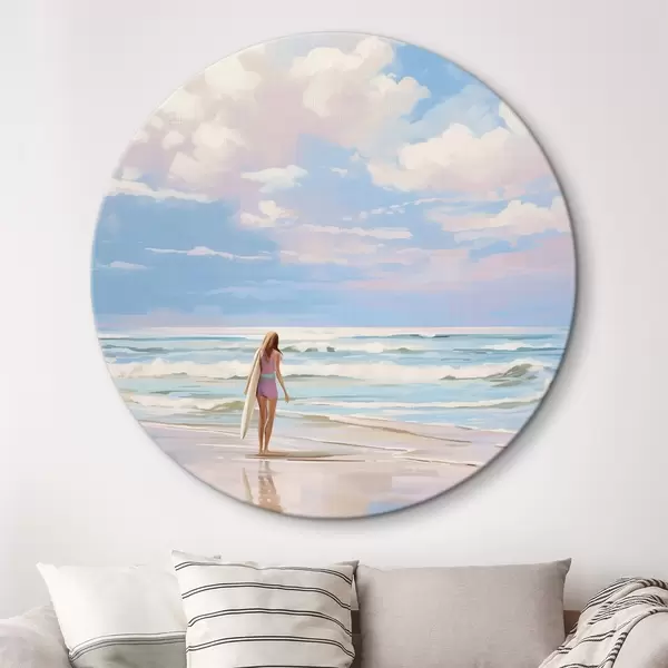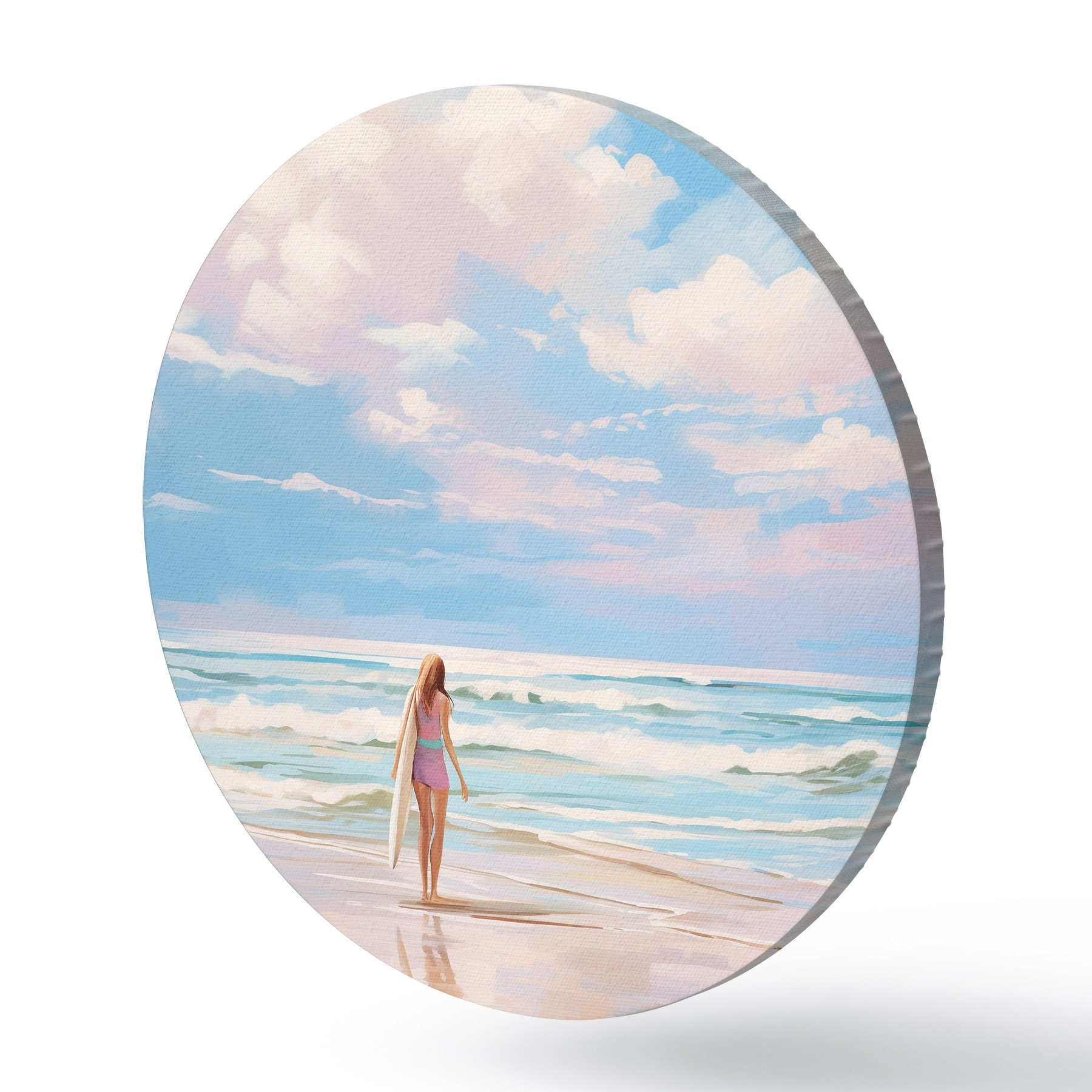 Cuadros redondos Chica surfeando en el océano, verano, olas, estilo acrílico r43882