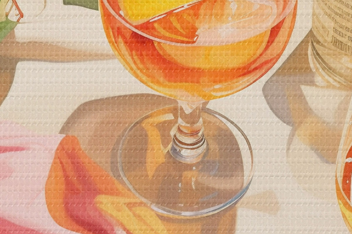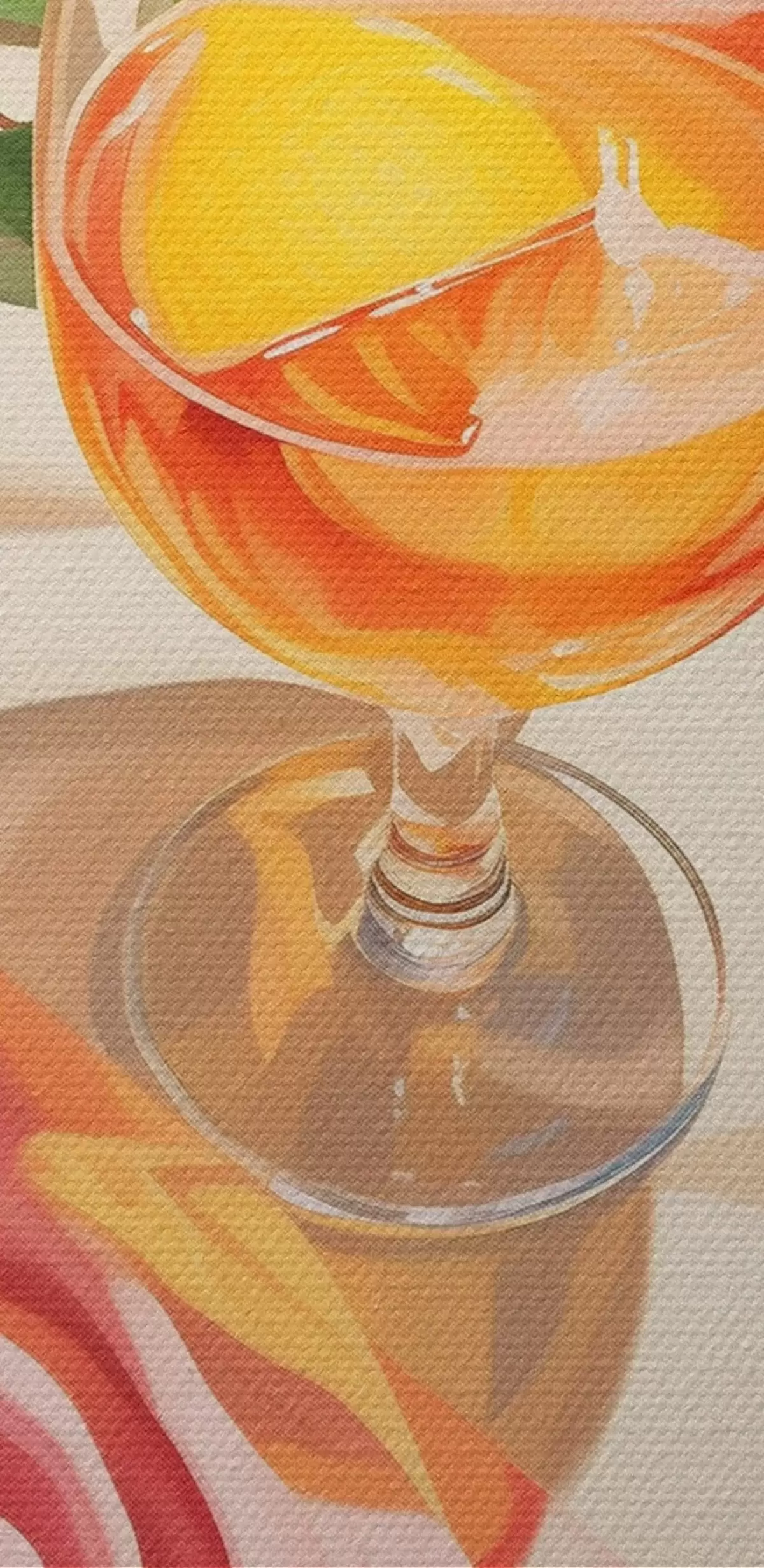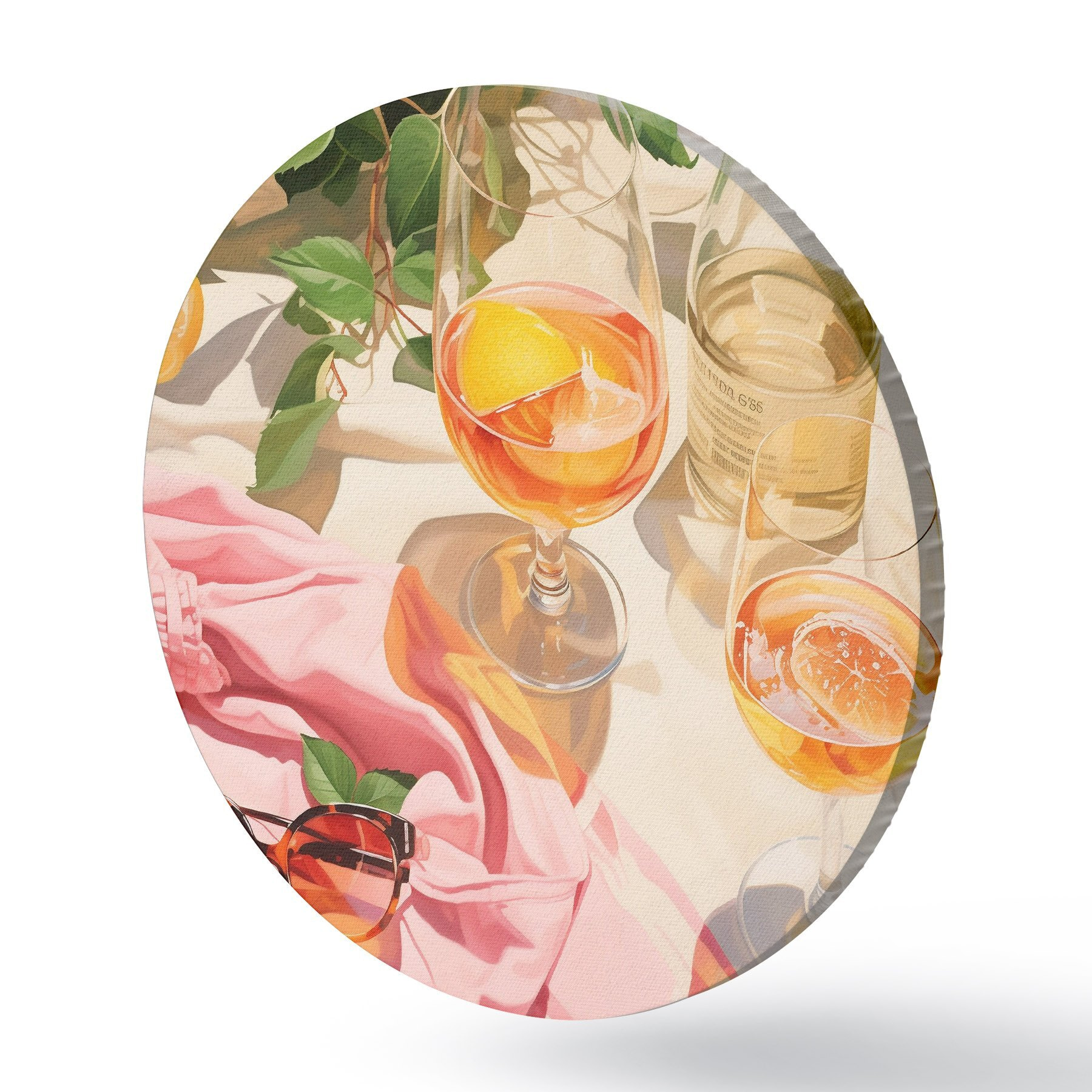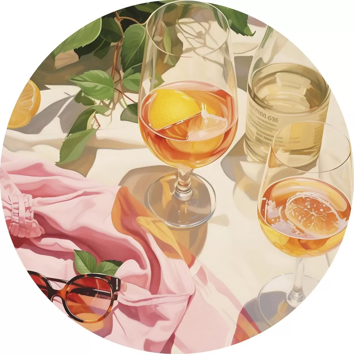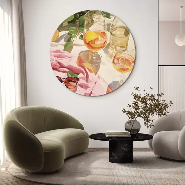 Cuadros redondos Verano, copas con champán, plantas verdes, colores cálidos r43885