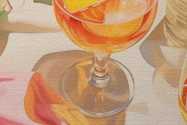 Foto Verano, copas con champán, plantas verdes, colores cálidos Nr r43885