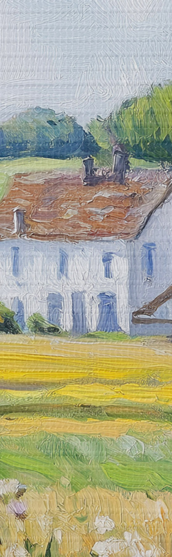 Cuadros redondos Paisajes de pueblo en la ventana de madera, flores, campos, estilo de aceite, casa de campo r43888