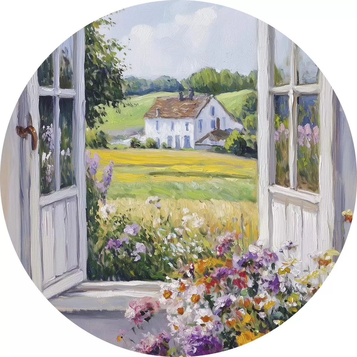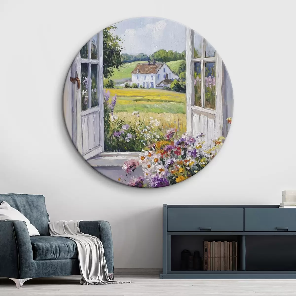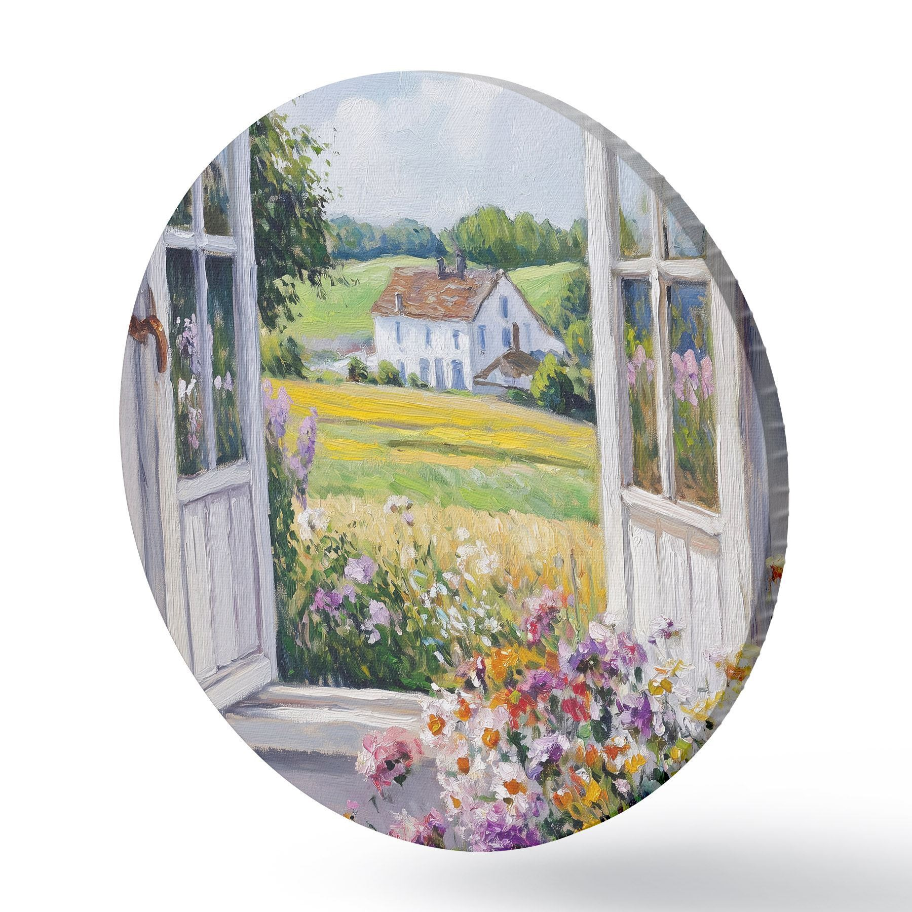 Cuadros redondos Paisajes de pueblo en la ventana de madera, flores, campos, estilo de aceite, casa de campo r43888