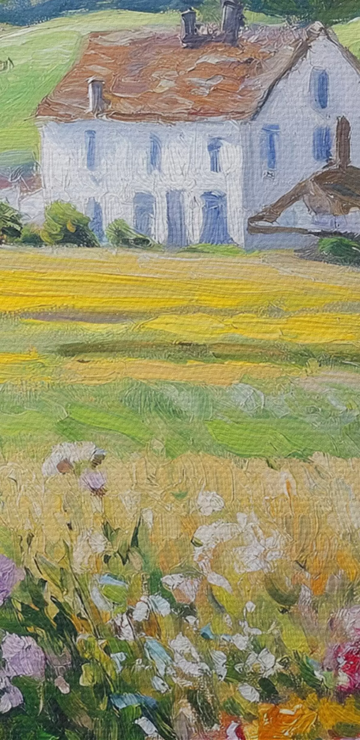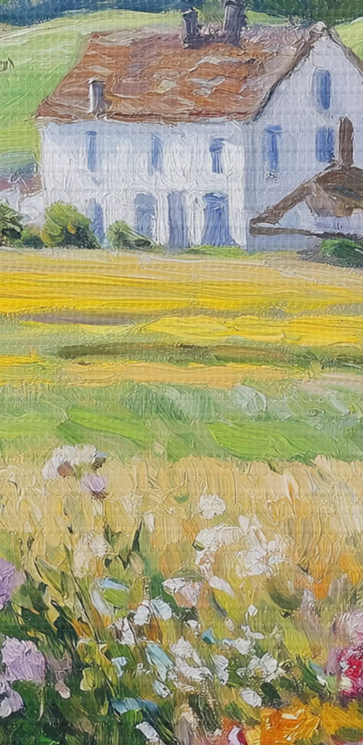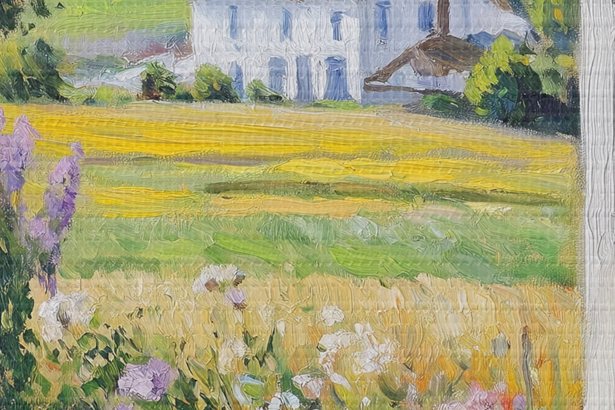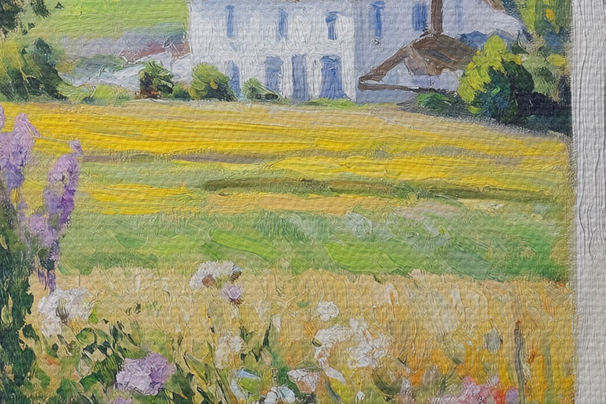 Foto Paisajes de pueblo en la ventana de madera, flores, campos, estilo de aceite, casa de campo Nr r43888
