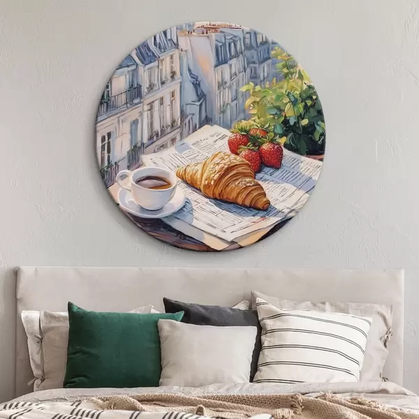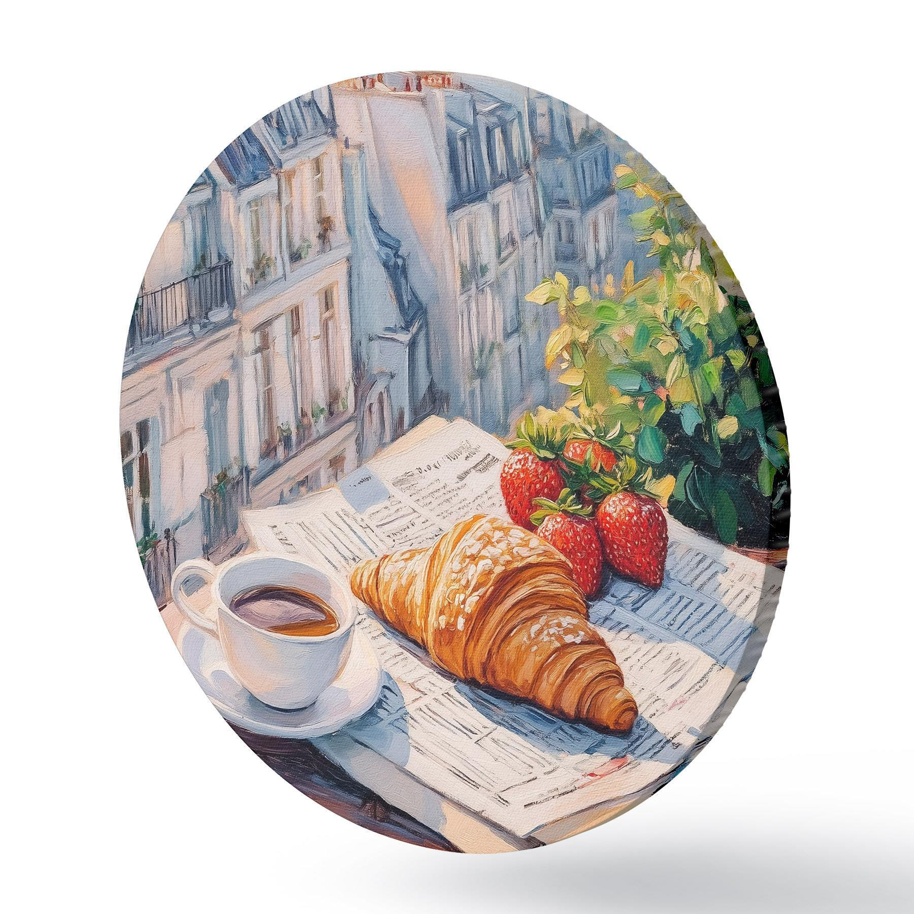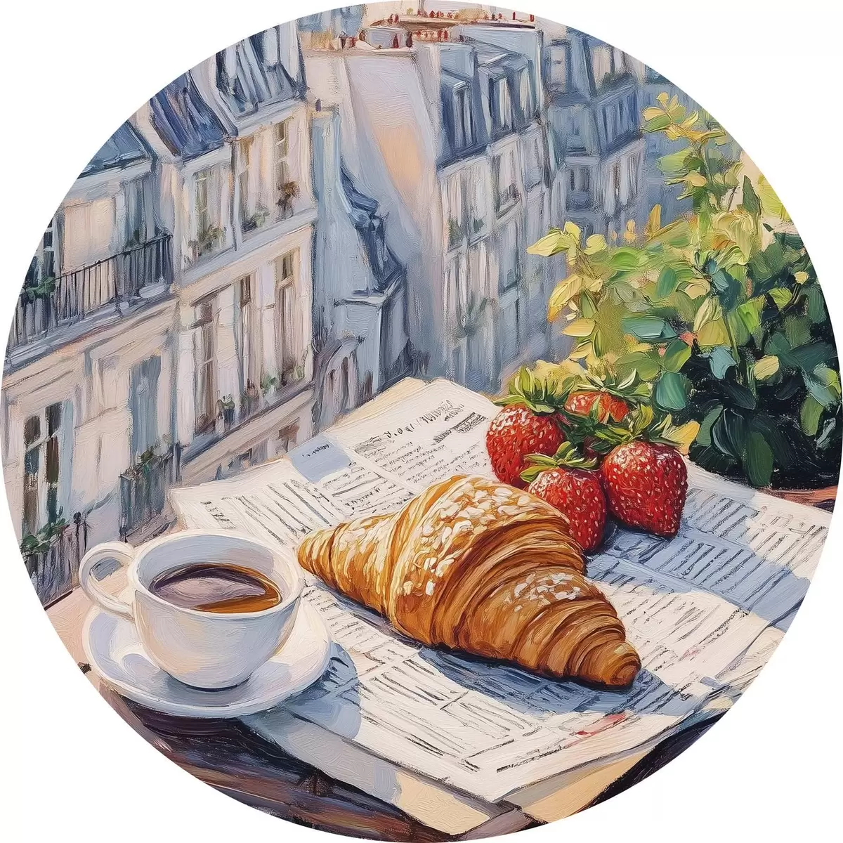 Cuadros redondos Amanecer en el balcón de París, Torre Eiffel, fresas, café, diario r43890