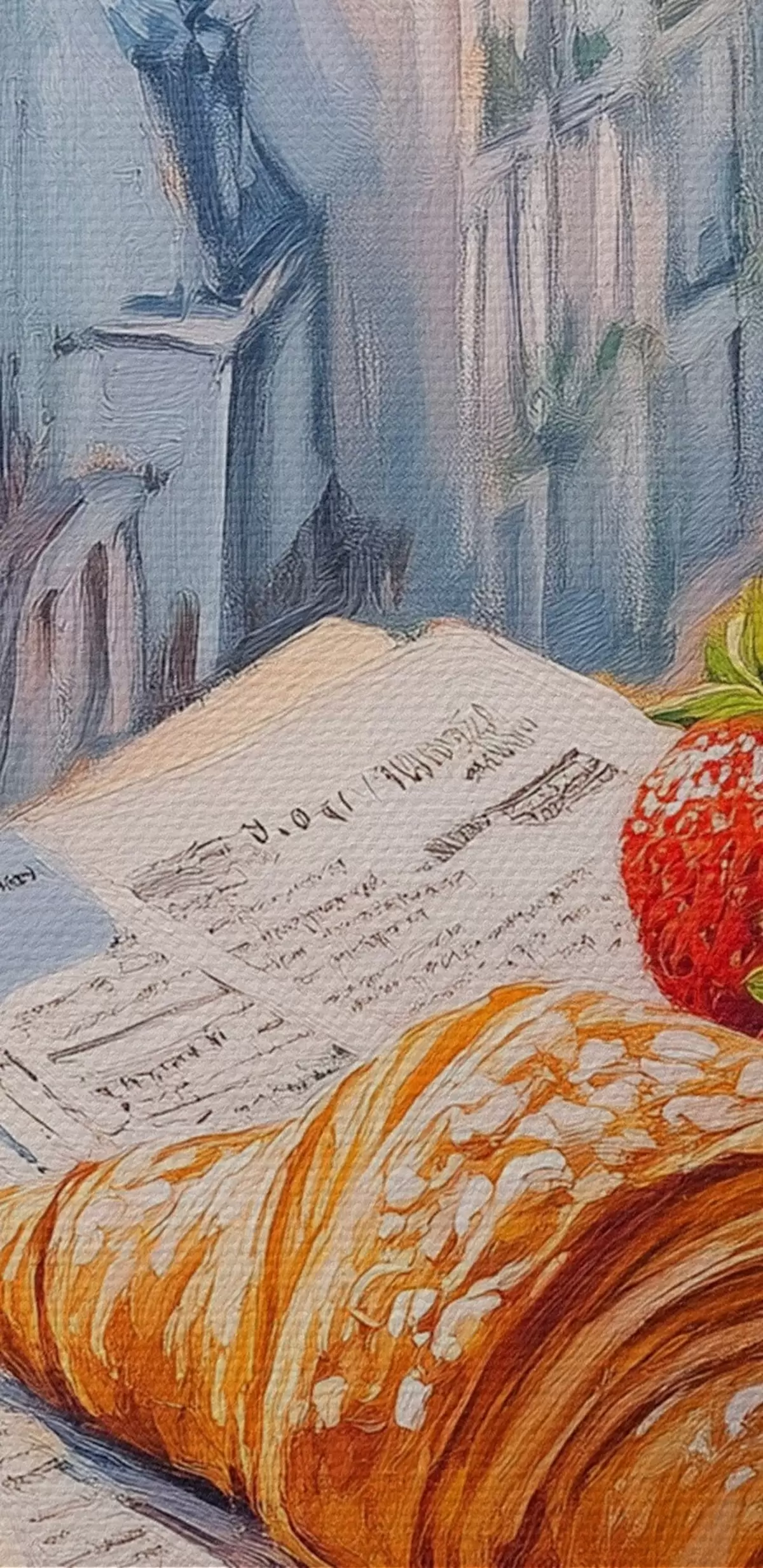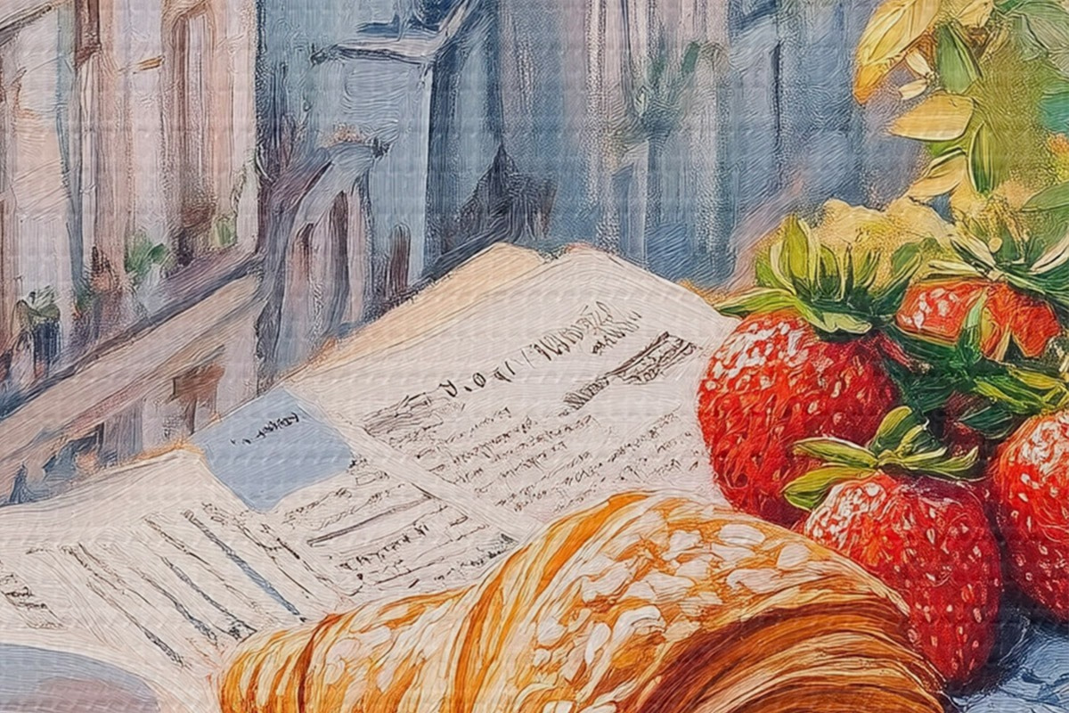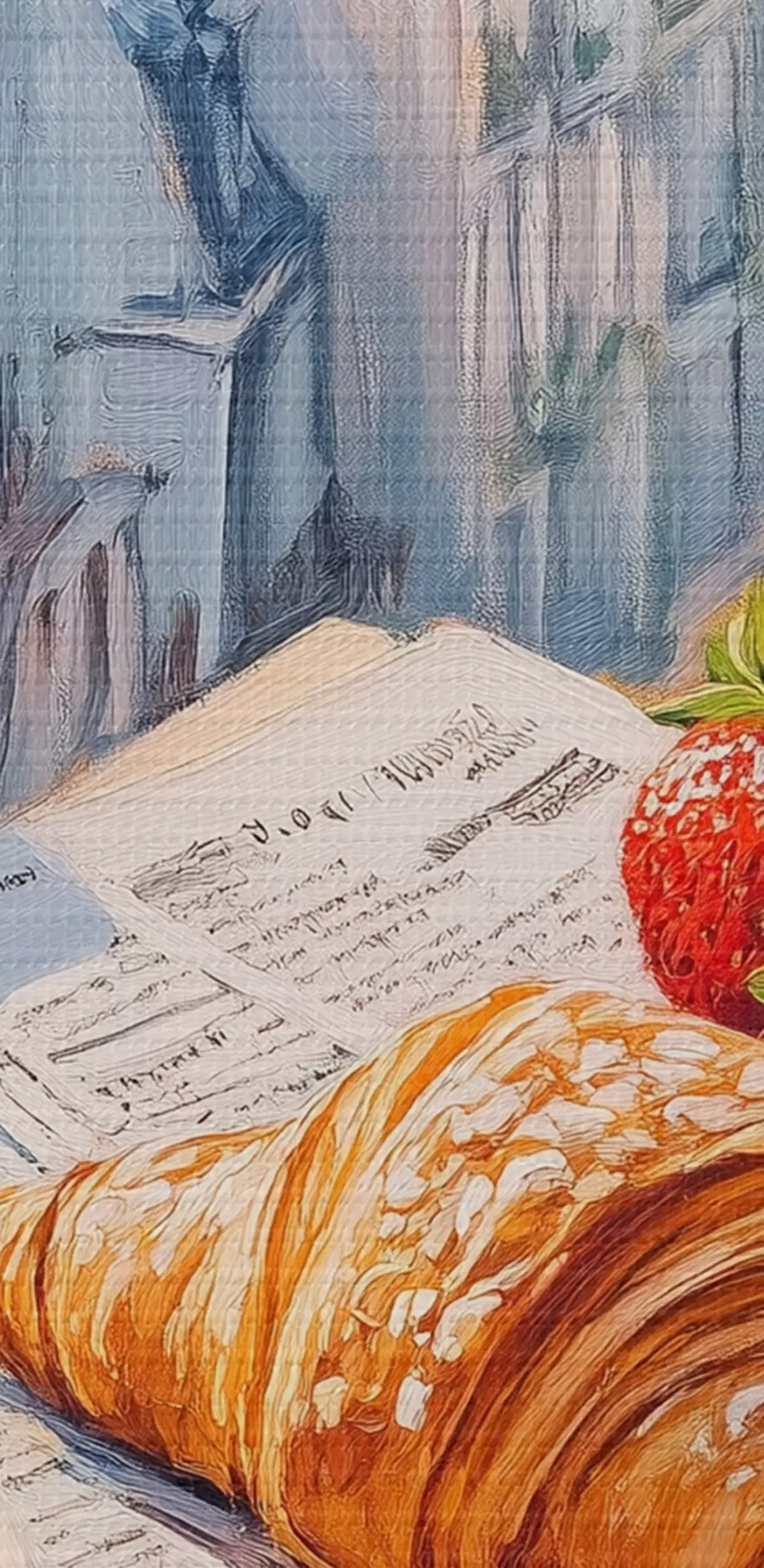 Foto Amanecer en el balcón de París, Torre Eiffel, fresas, café, diario Nr r43890