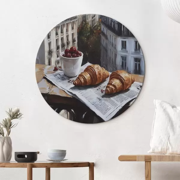 Cuadros redondos París por la mañana, café con croissants, vista de la ciudad, dibujo al óleo r43892