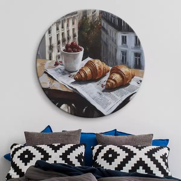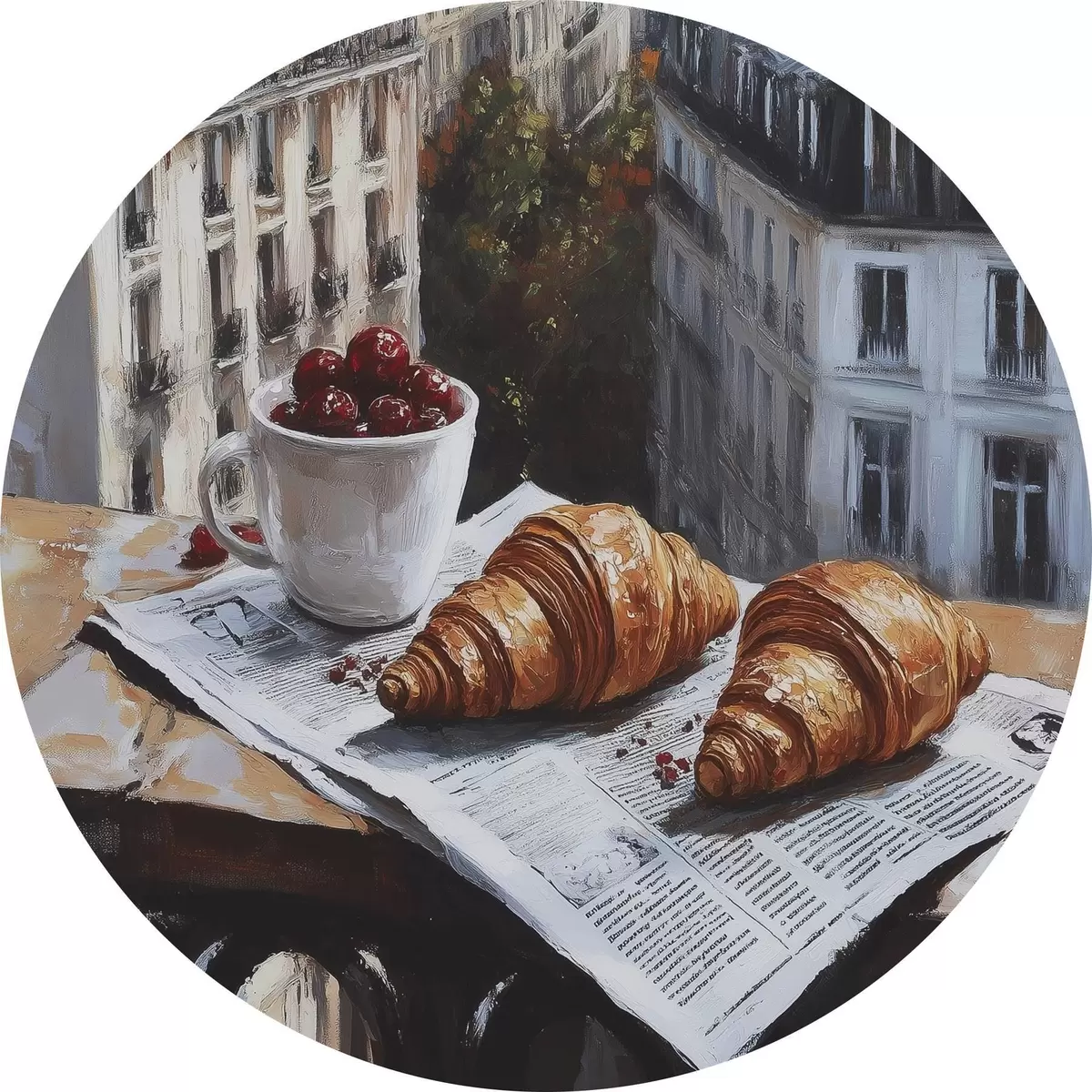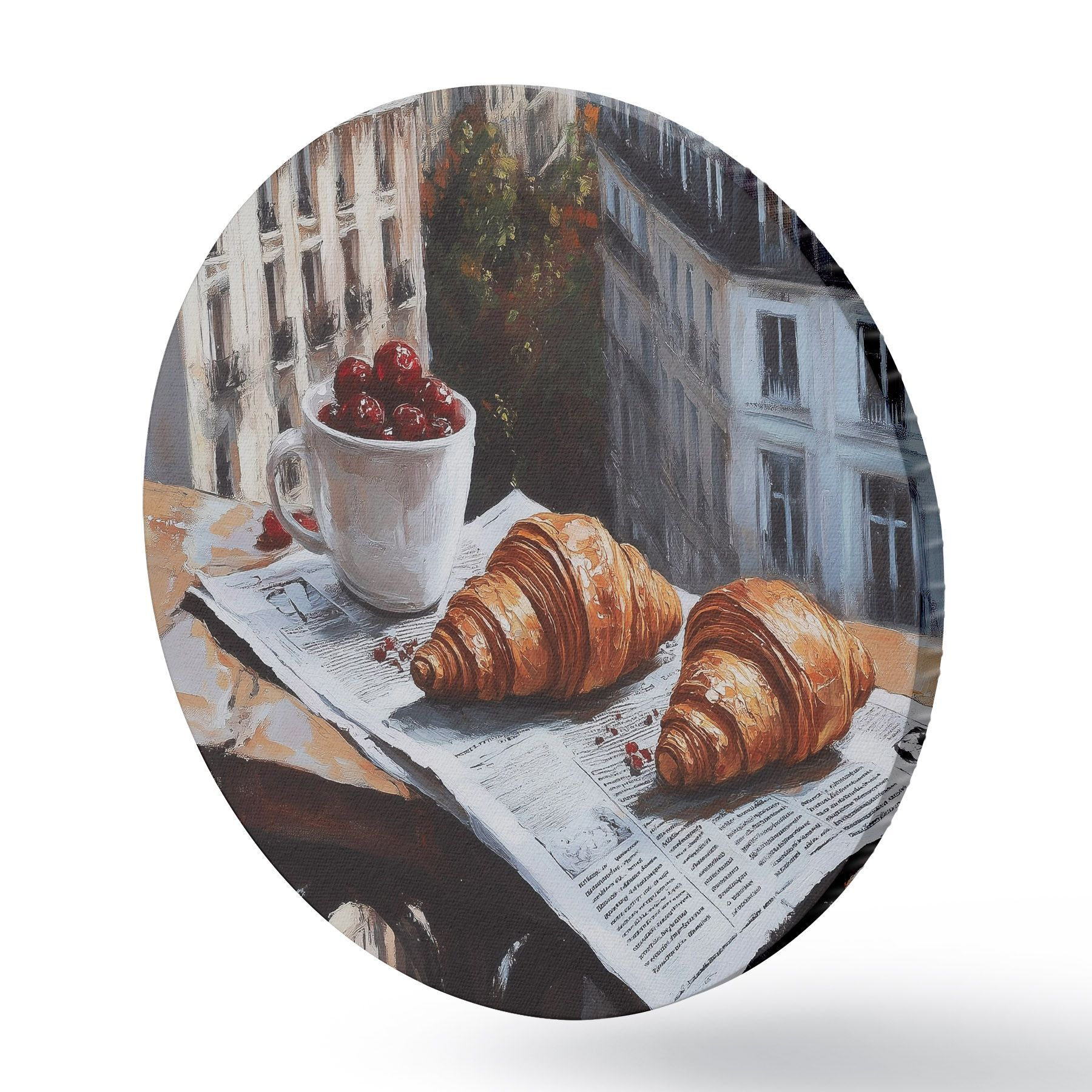 Cuadros redondos París por la mañana, café con croissants, vista de la ciudad, dibujo al óleo r43892