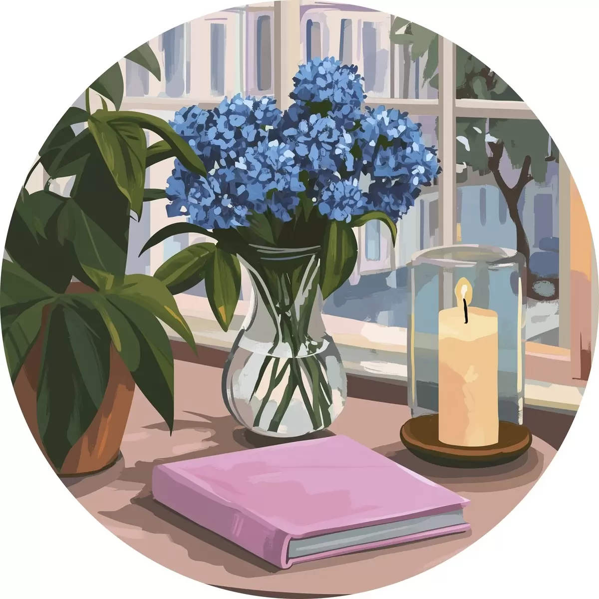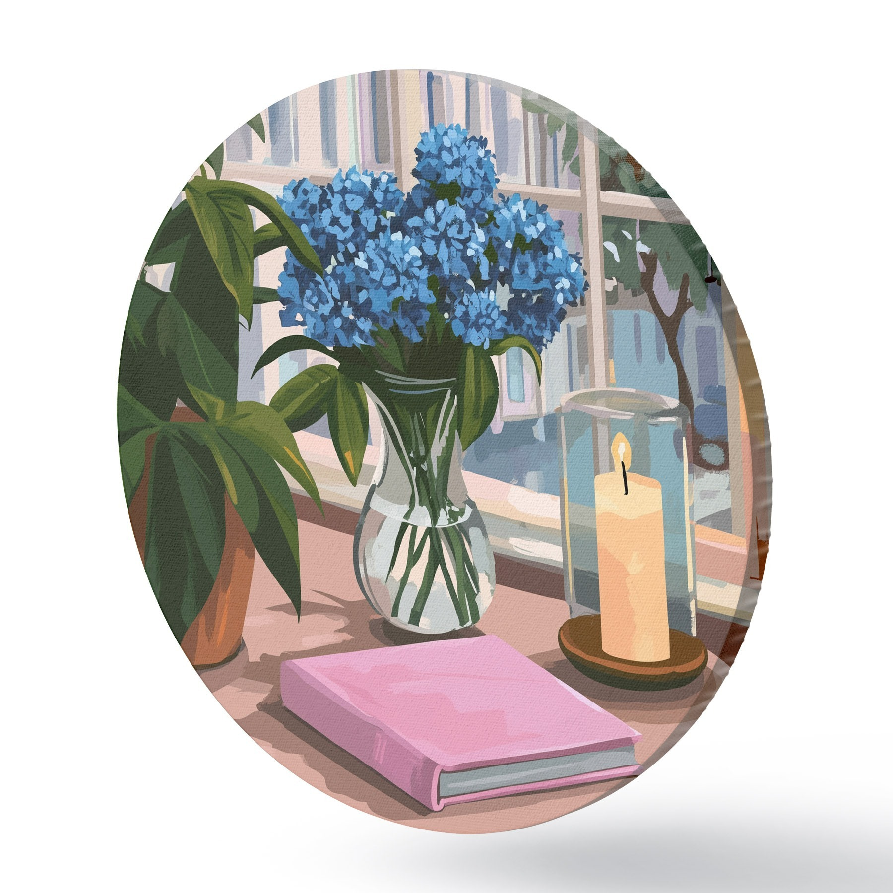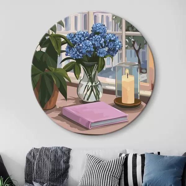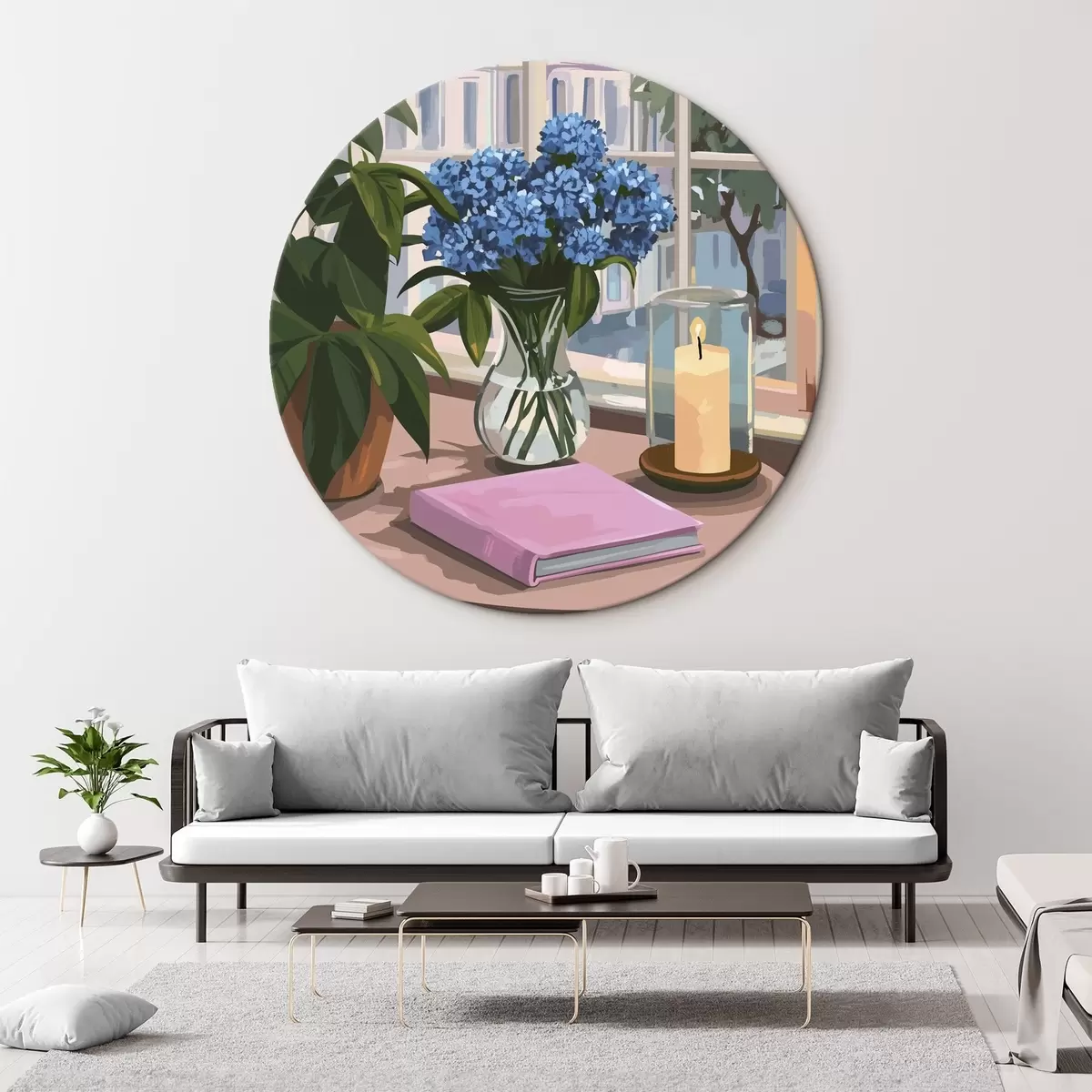 Cuadros redondos Hortensias en el jarrón, vista a la ventana, vela, hogar acogedor r44009