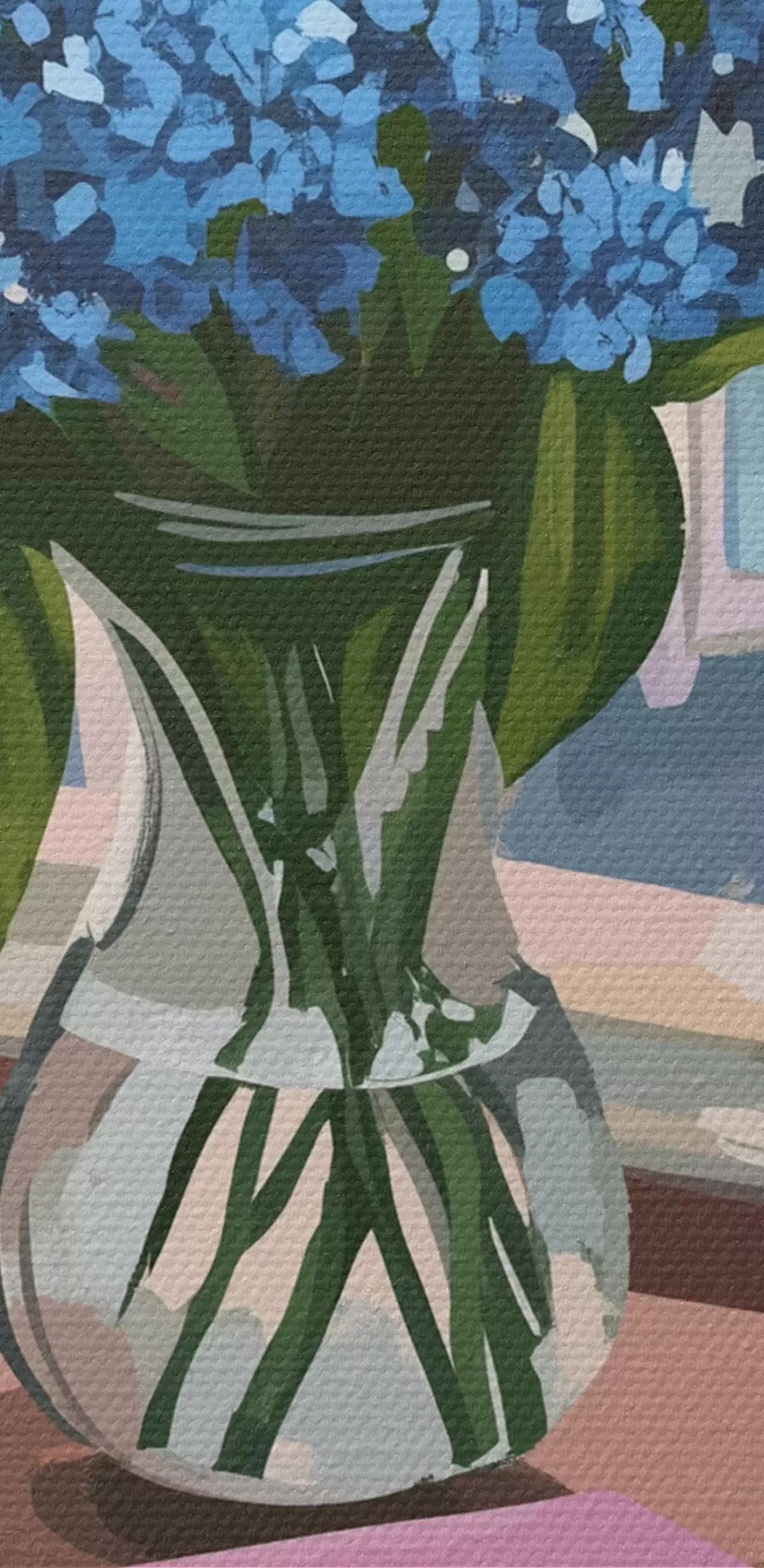 Foto Hortensias en el jarrón, vista a la ventana, vela, hogar acogedor Nr r44009