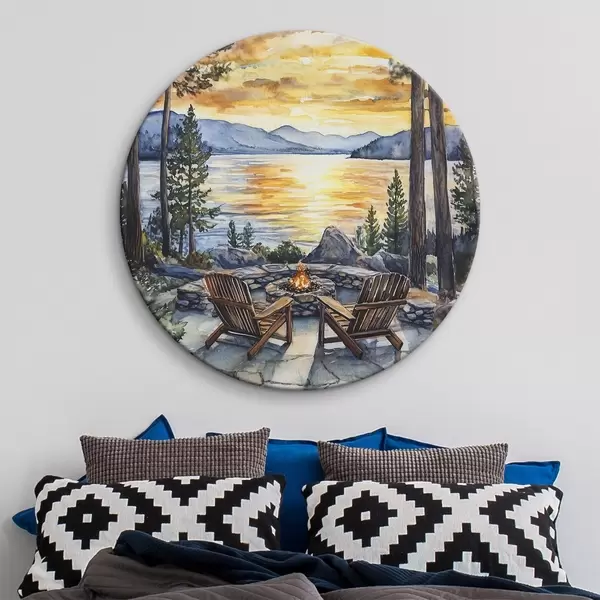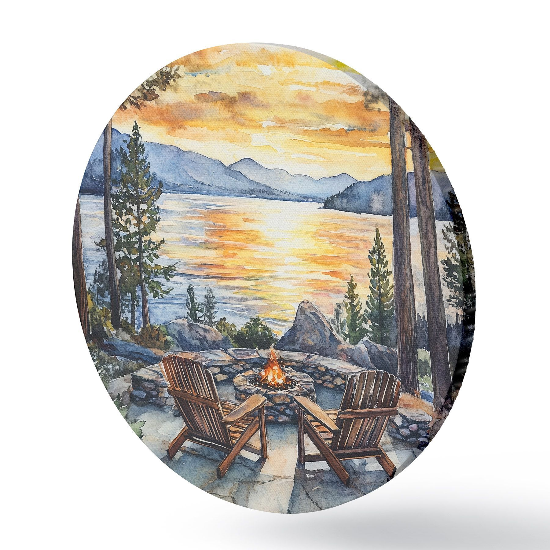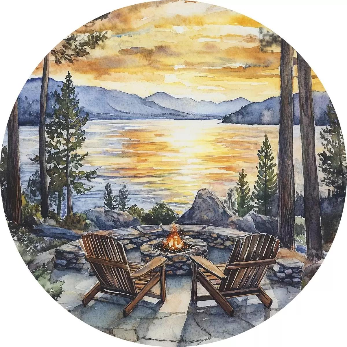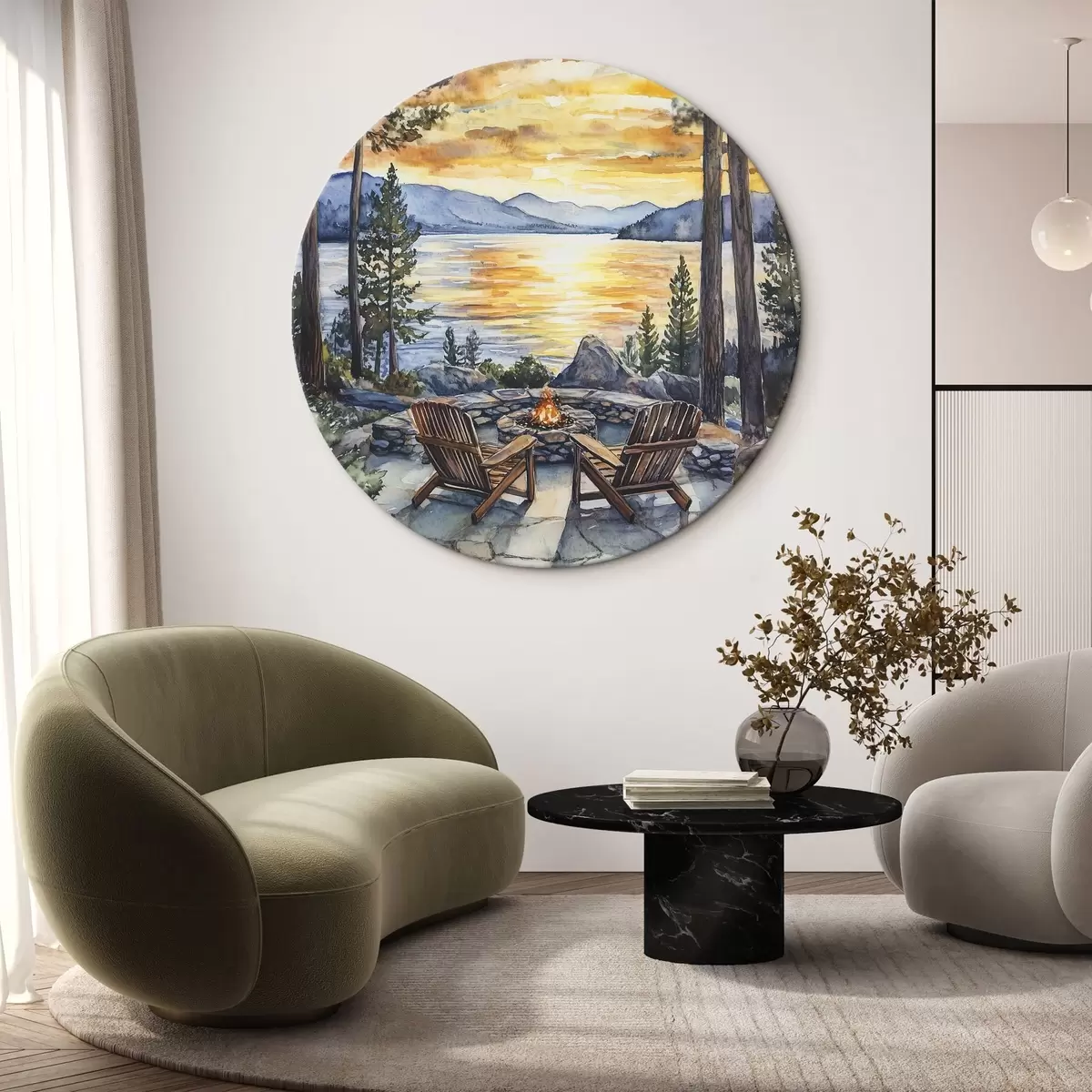 Cuadros redondos Lago con montañas en la puesta de sol, viajar, acogedora chimenea, acuarela r44018